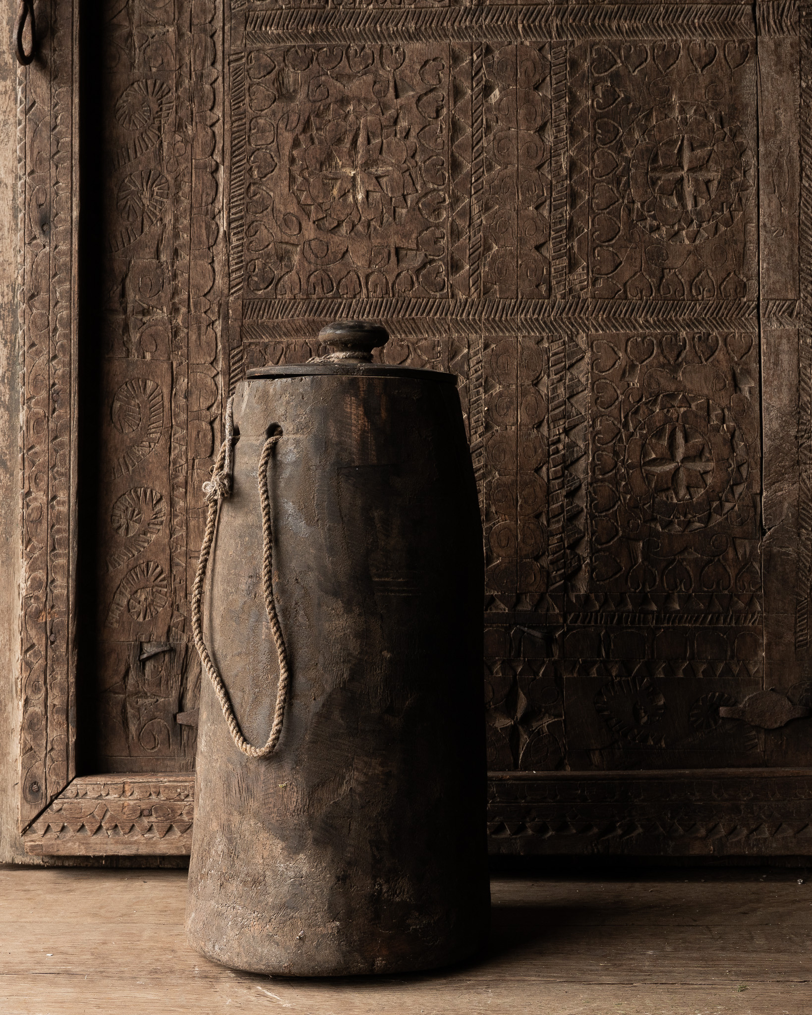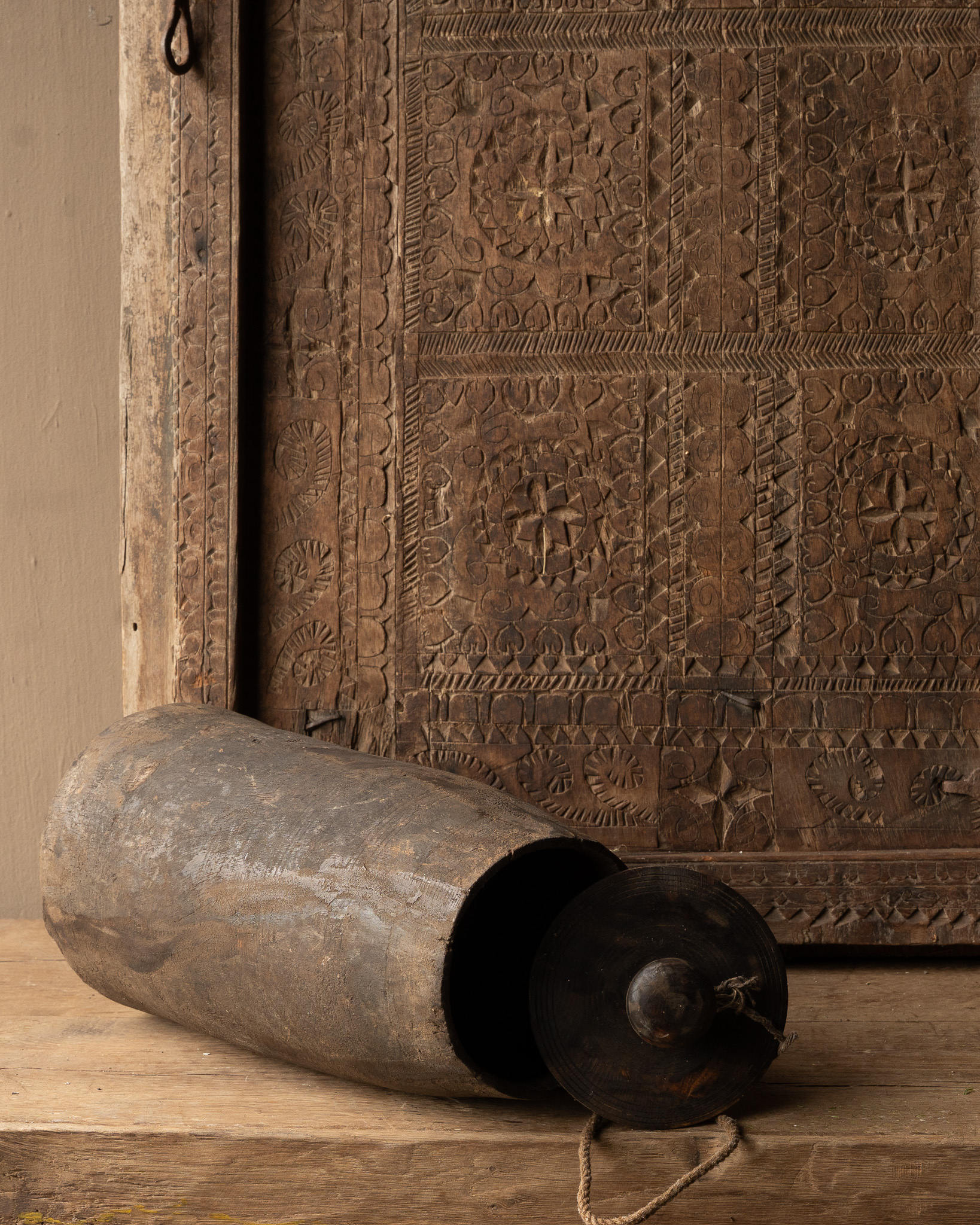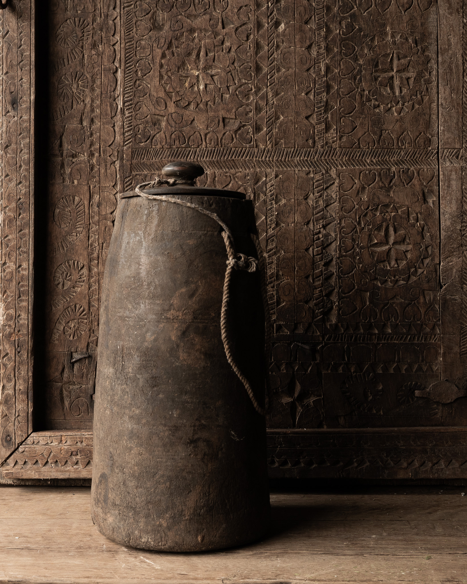 Een authentieke antieke melkkan uit India, met prachtig verweerde details en een origineel houten deksel met koord. De donkere, matte patina en het robuuste silhouet geven dit stuk een pure, doorleefde uitstraling — perfect passend binnen een stoer, sober en sfeervol interieur.