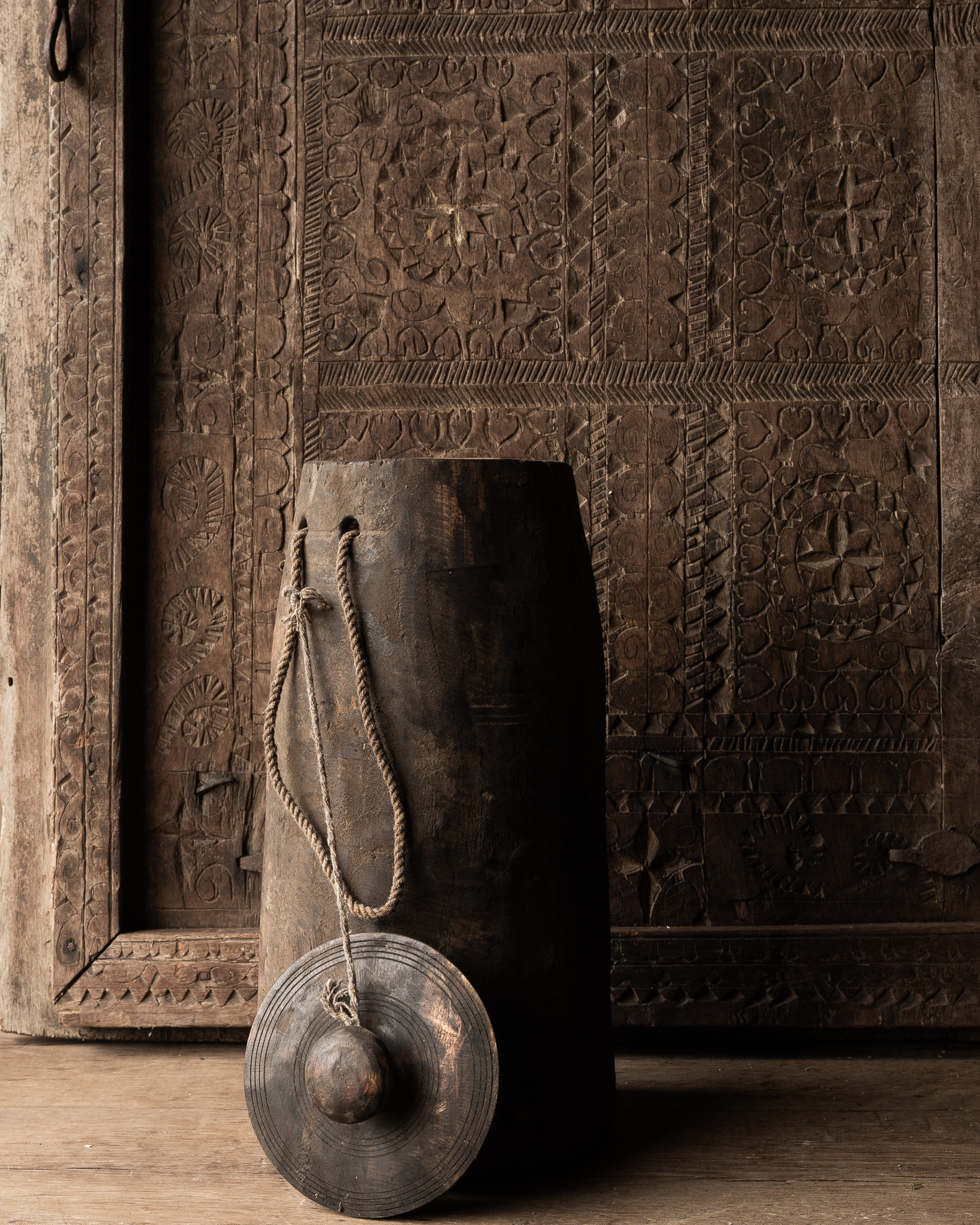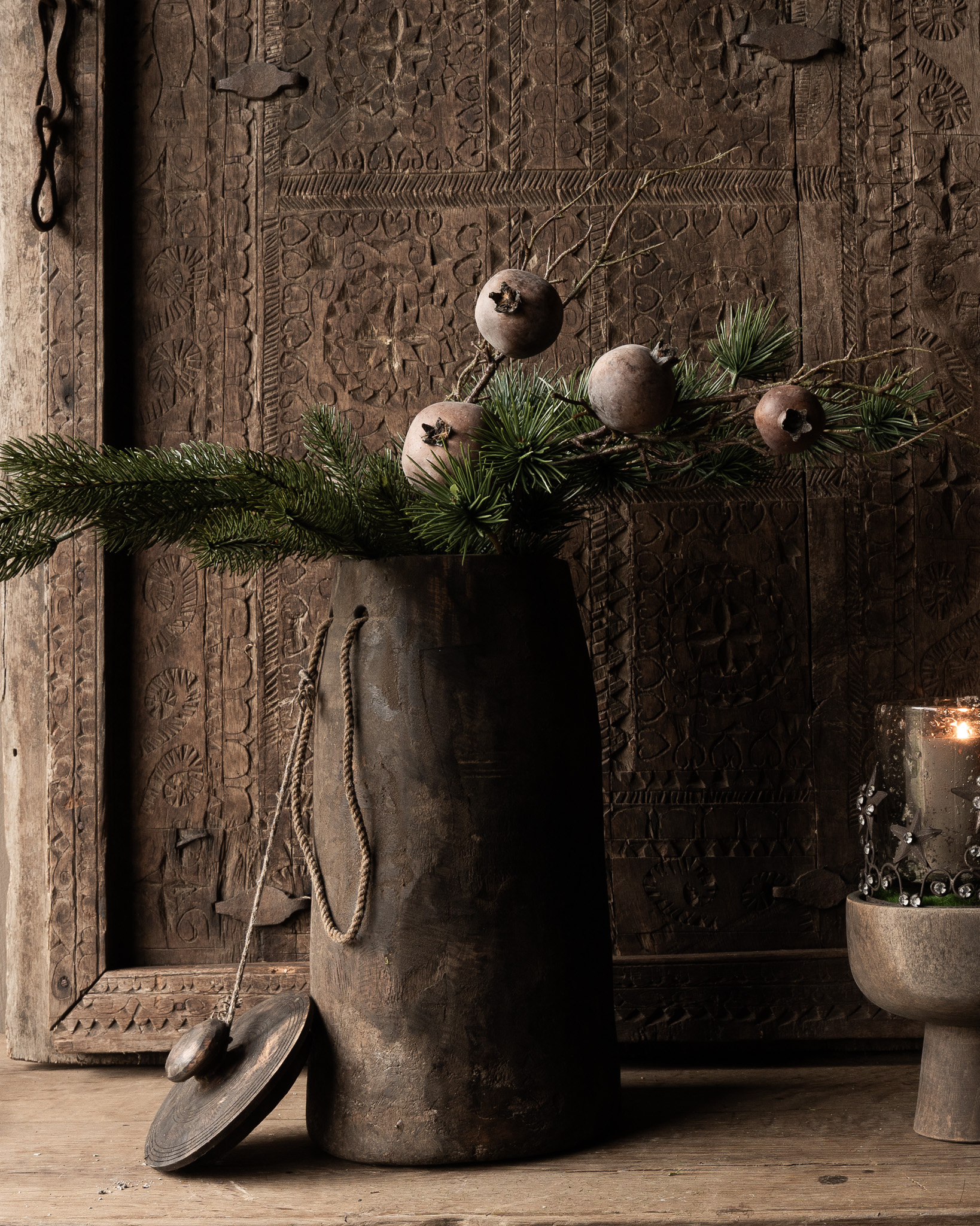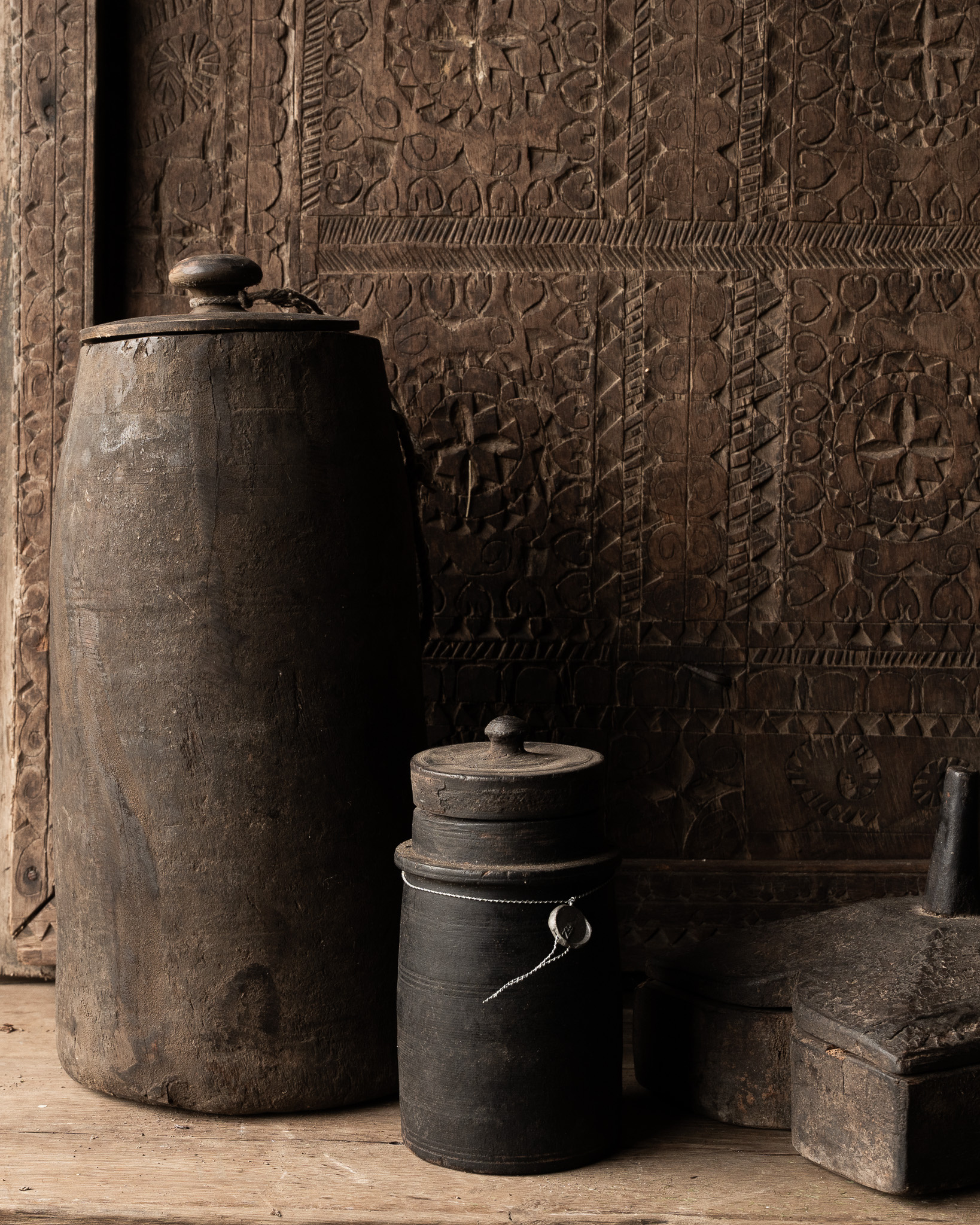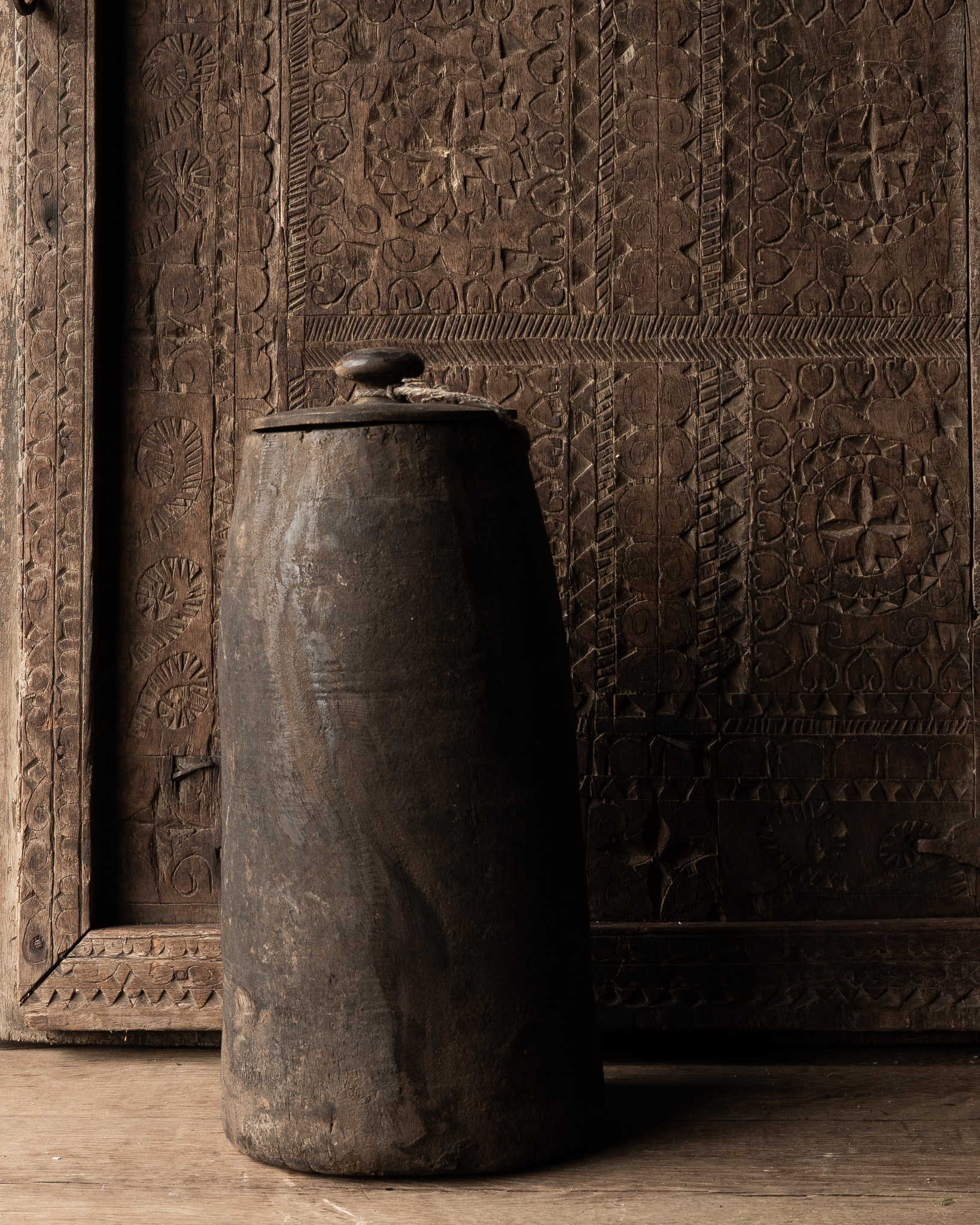 Een authentieke antieke melkkan uit India, met prachtig verweerde details en een origineel houten deksel met koord. De donkere, matte patina en het robuuste silhouet geven dit stuk een pure, doorleefde uitstraling — perfect passend binnen een stoer, sober en sfeervol interieur.