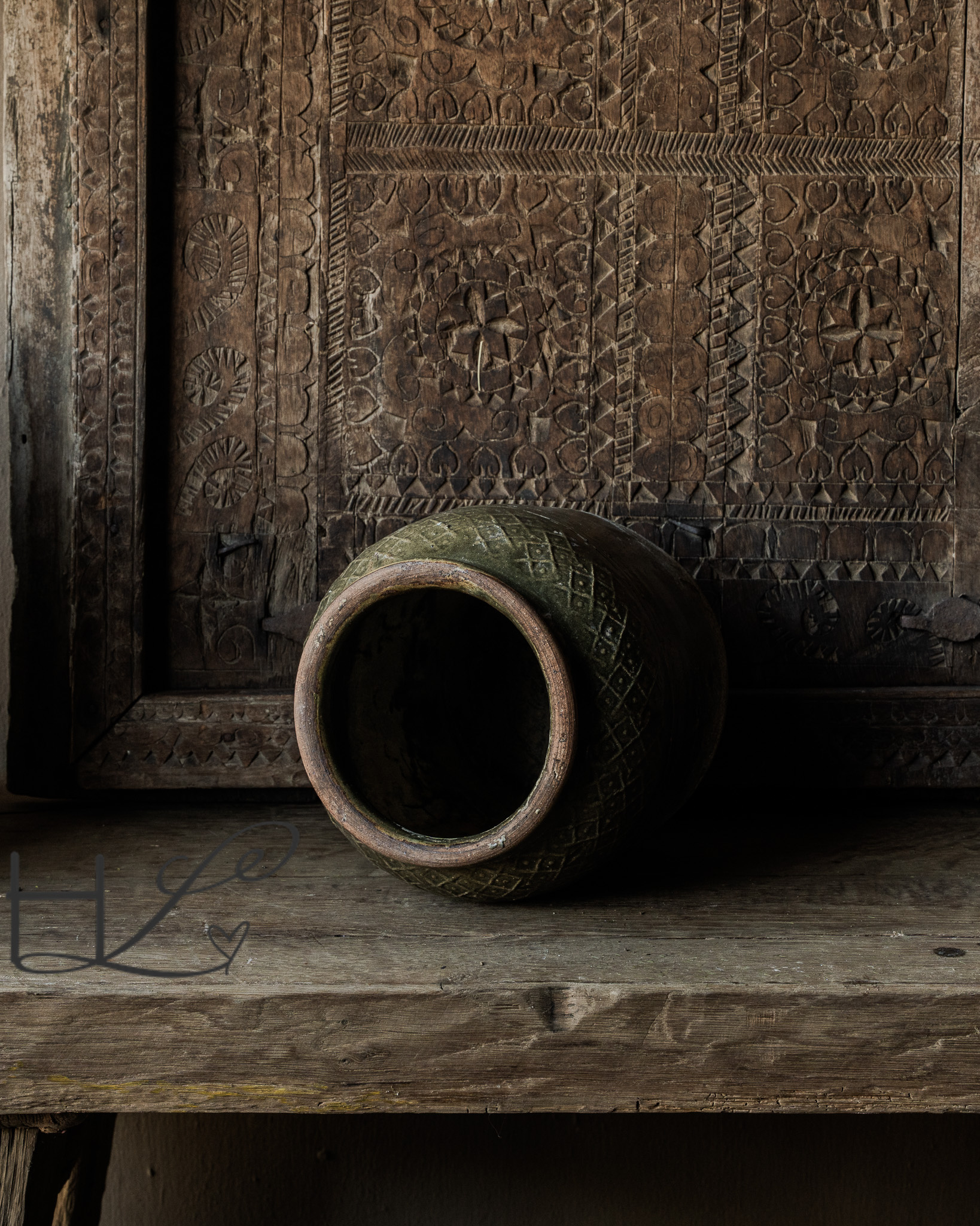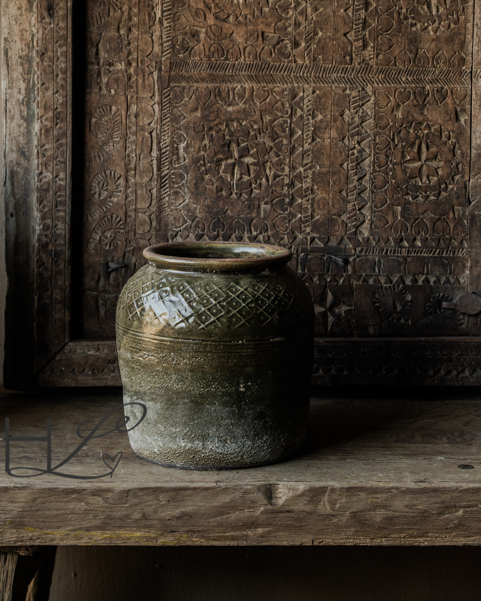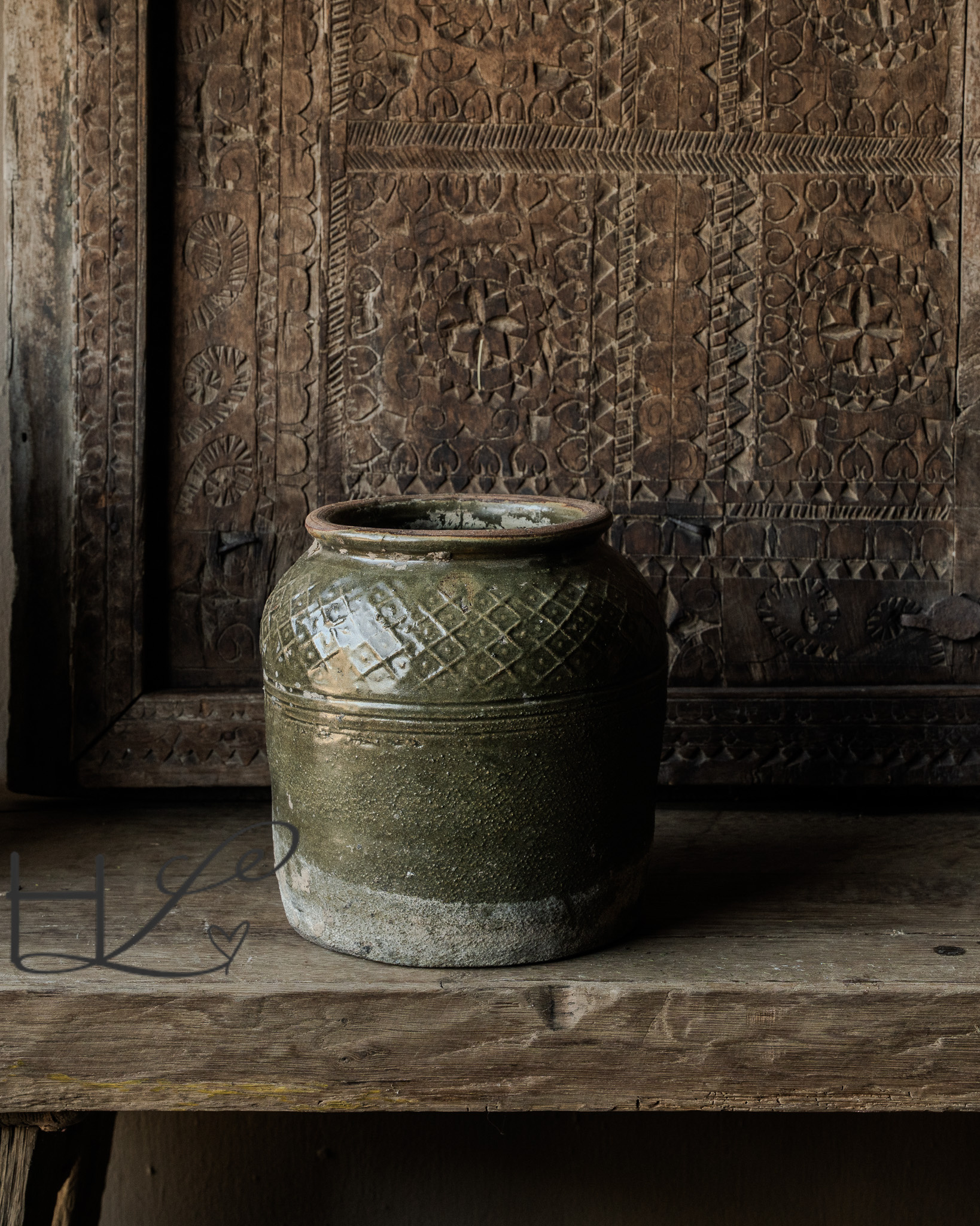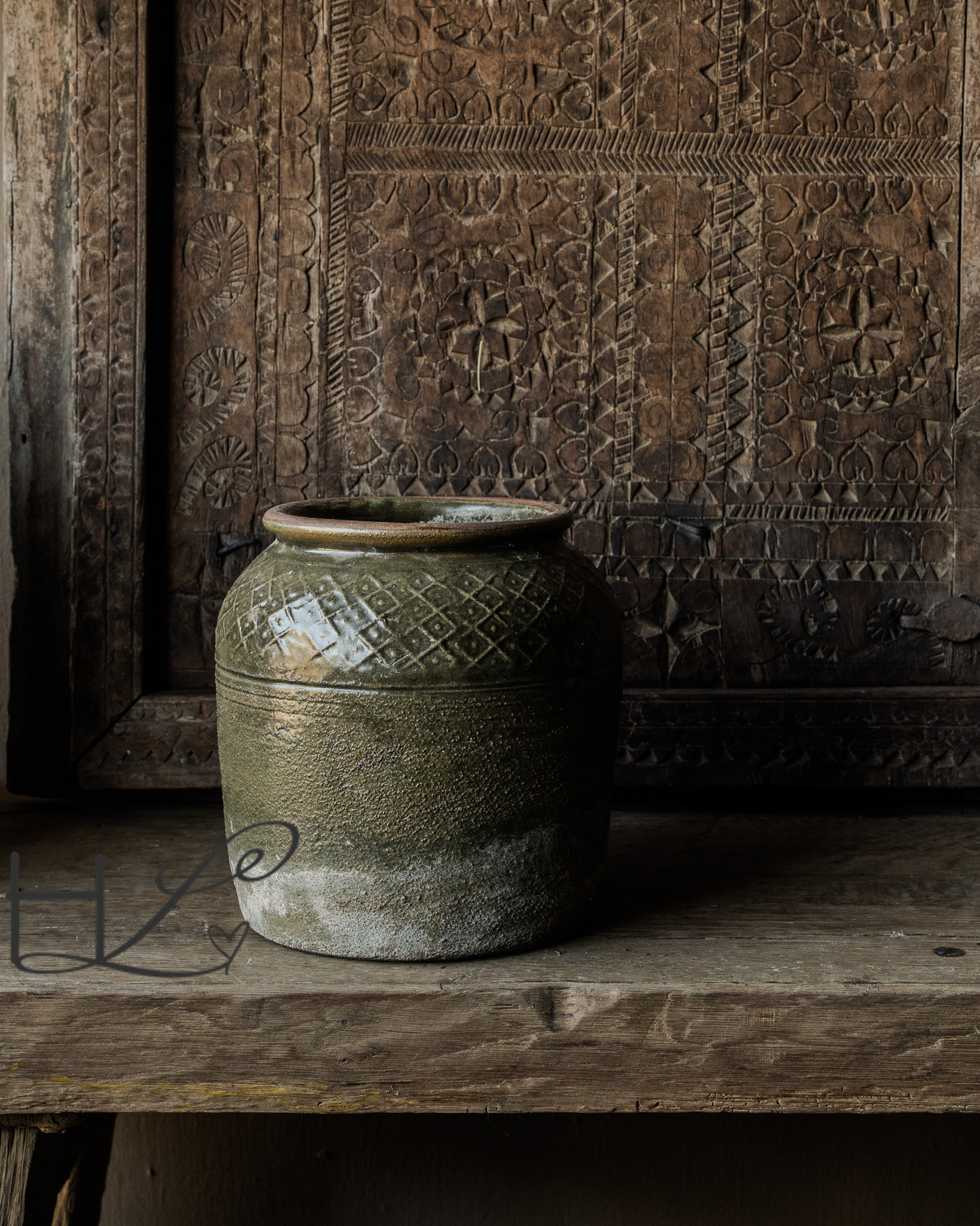 Een authentieke antieke kruik met een prachtig verweerde uitstraling. De kruik heeft een diepe, groene glazuurlaag vol karakter, getekend door de tijd en het gebruik. Elk detail — van de subtiele craquelé tot de natuurlijke kleurnuances — vertelt zijn eigen verhaal.