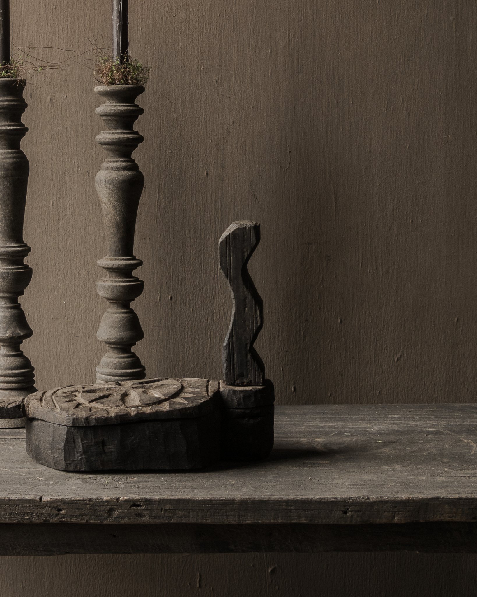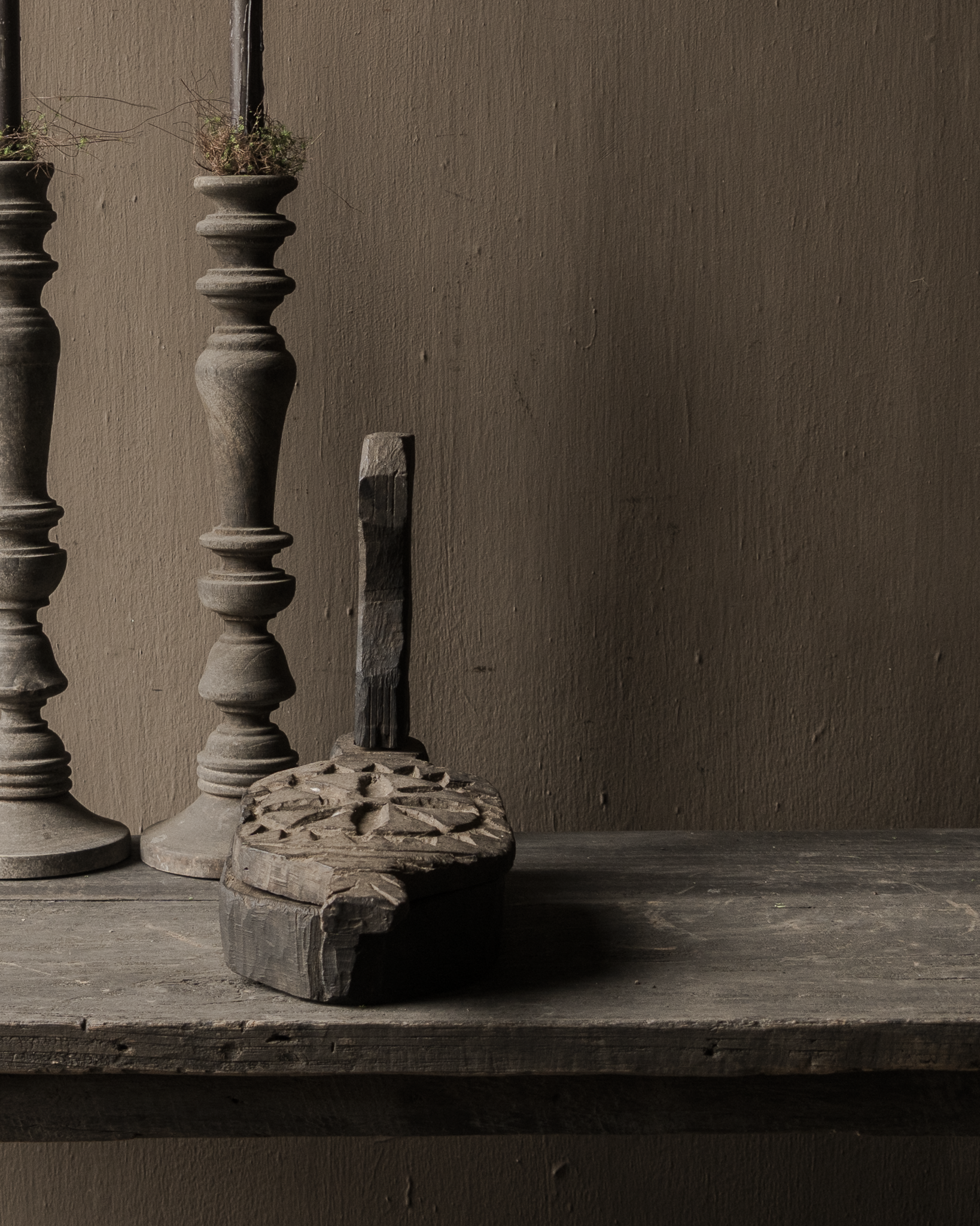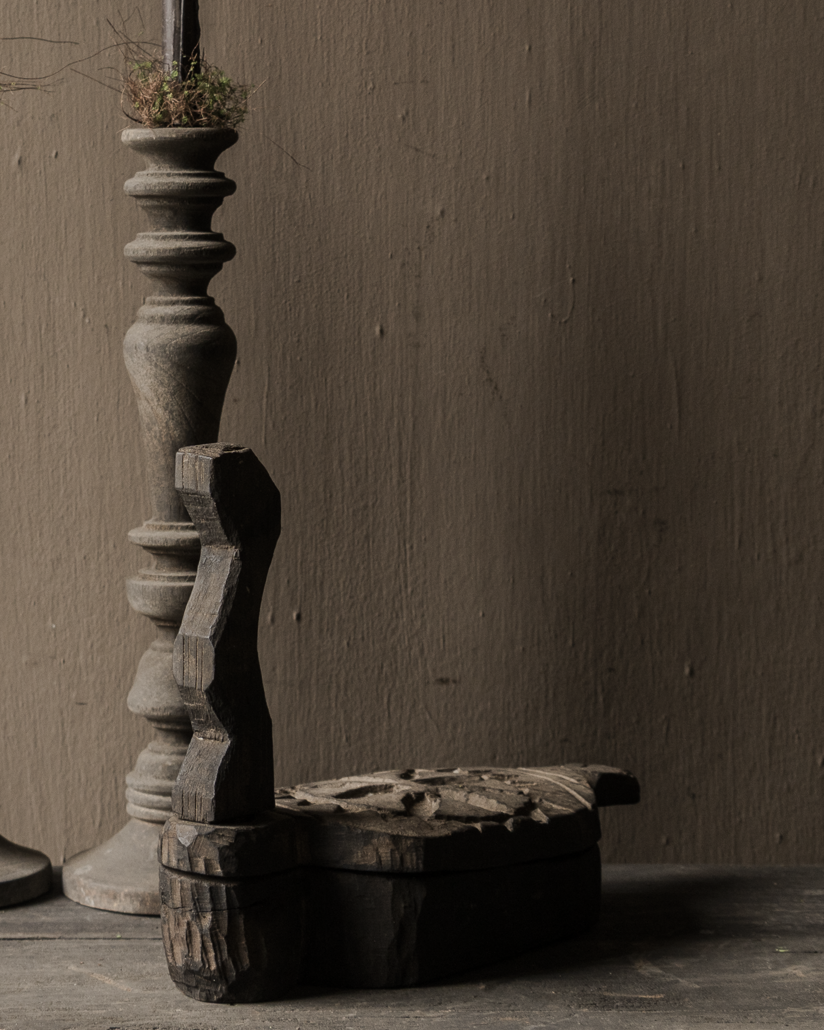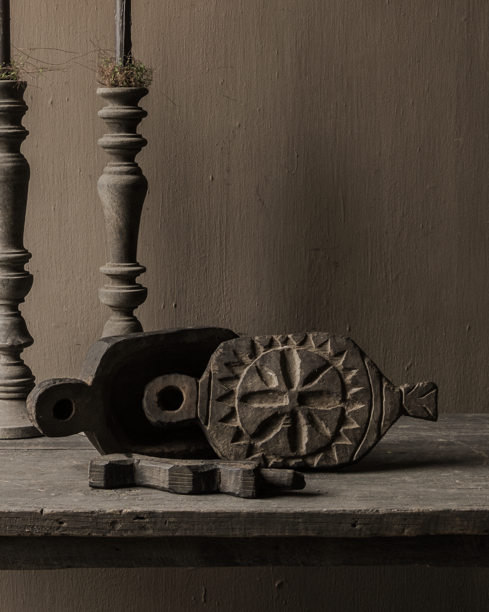 De handgesneden details in de deksel, het robuuste scharnier en het donkere, verweerde hout geven dit stuk een krachtige uitstraling. Mooi liggend op een tafel, in een open kast of gecombineerd met kandelaars en andere oude houten objecten.