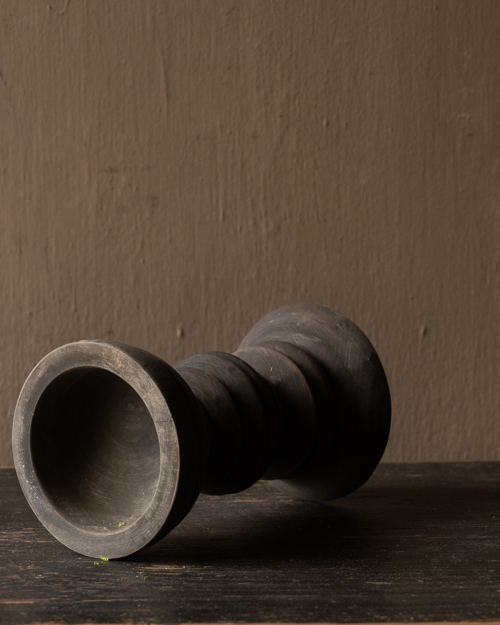 Deze karaktervolle houten kandelaar op voet in de stijl van Aura Peeperkorn straalt pure rust en eenvoud uit. Het sobere ontwerp, gecombineerd met de doorleefde donkere afwerking, geeft dit item een authentieke en tijdloze uitstraling.