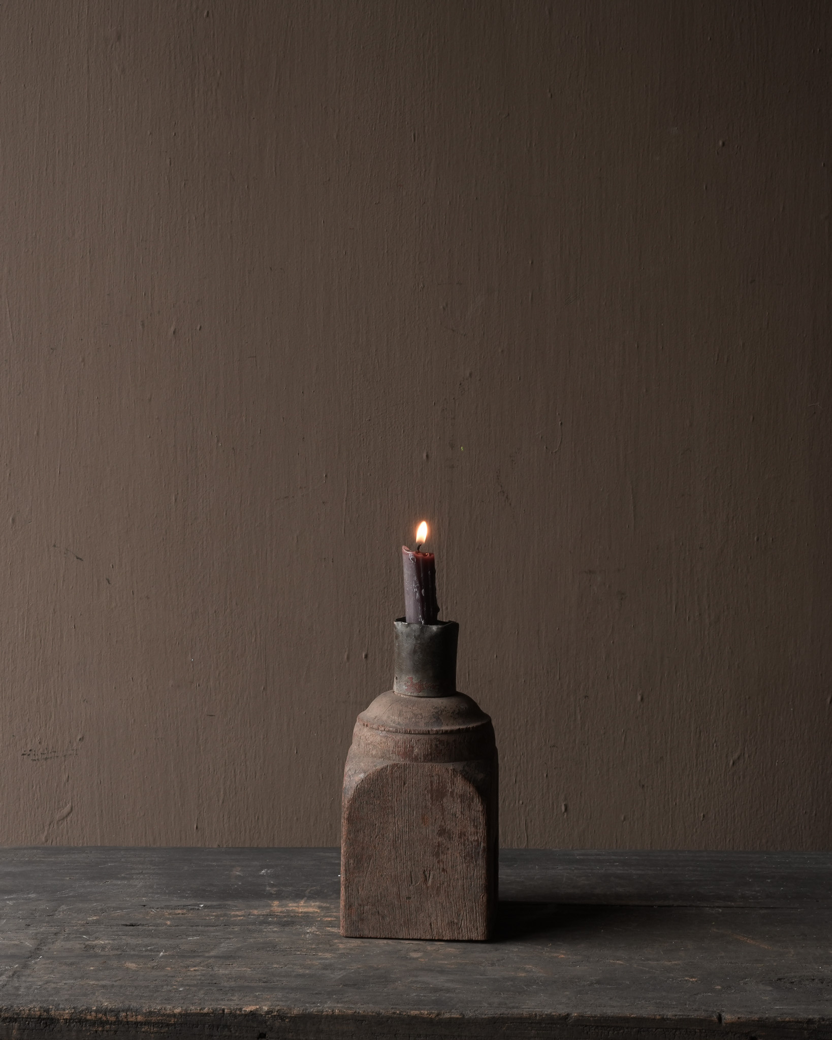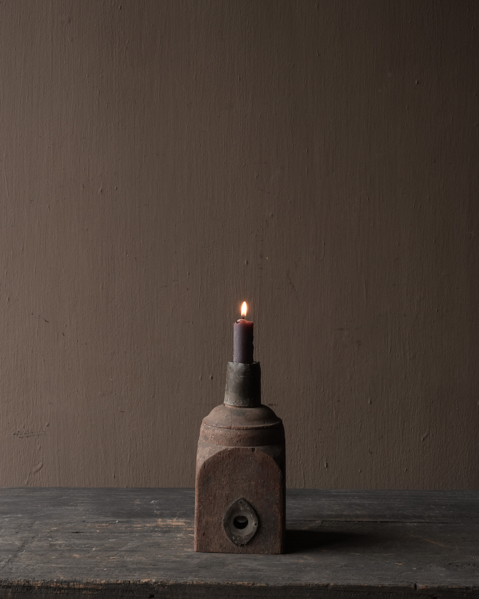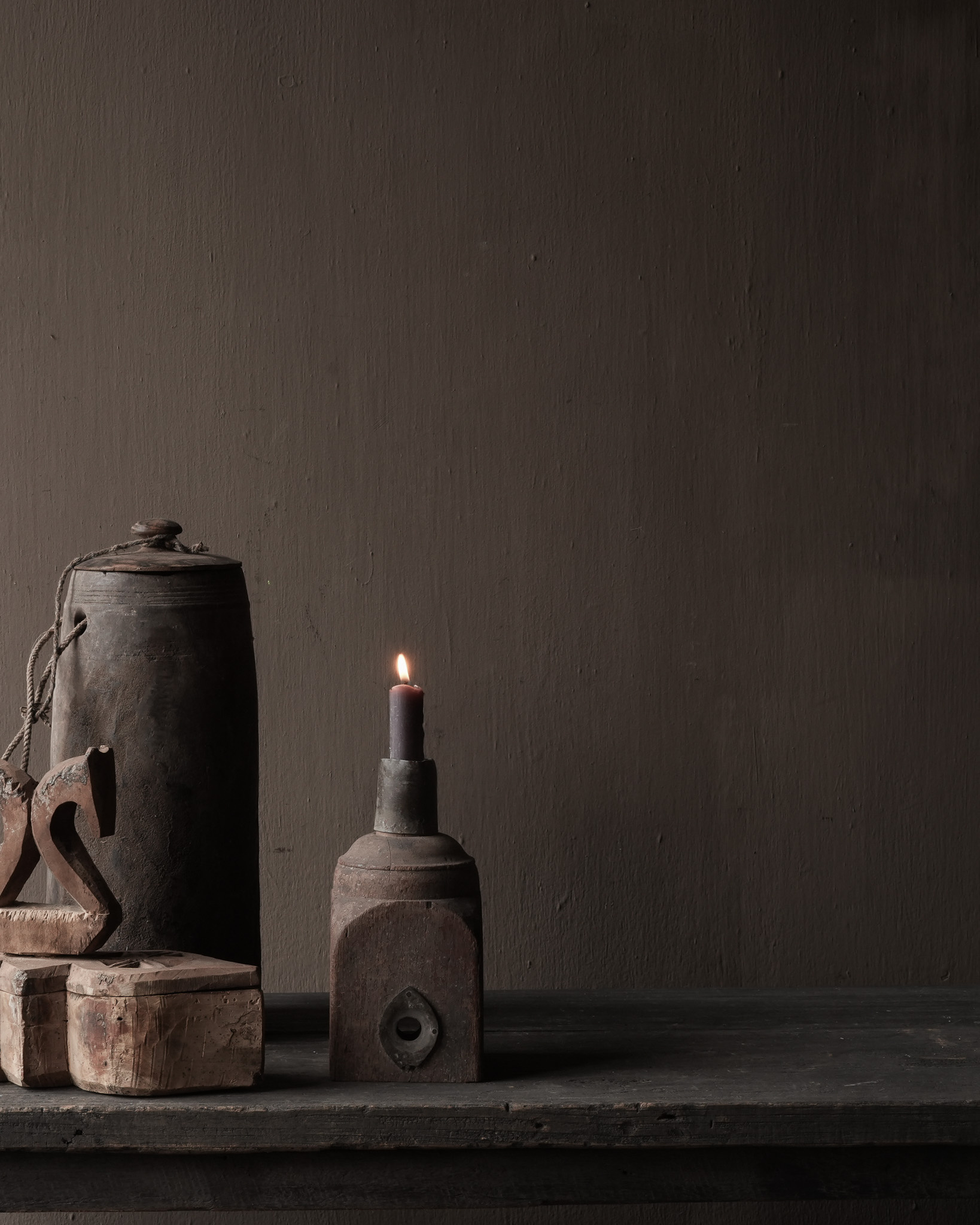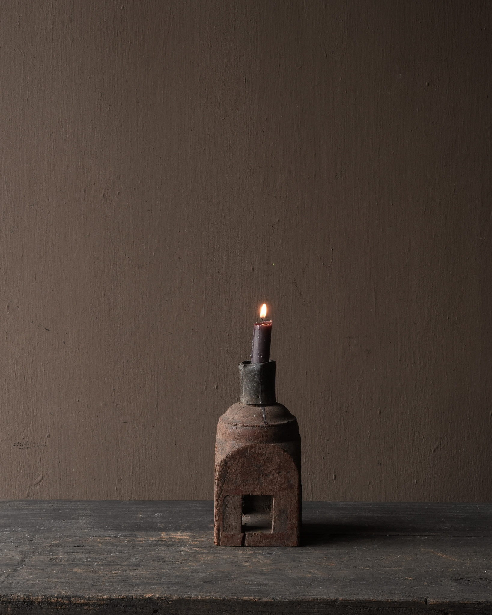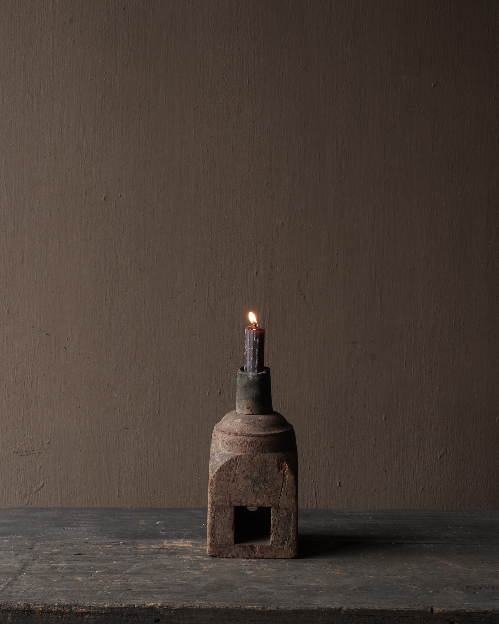 Deze houten ornament kandelaar van Aura Peeperkorn is een krachtig en puur object met karakter. De robuuste vorm, het doorleefde hout en de sobere afwerking geven dit stuk een tijdloze uitstraling.