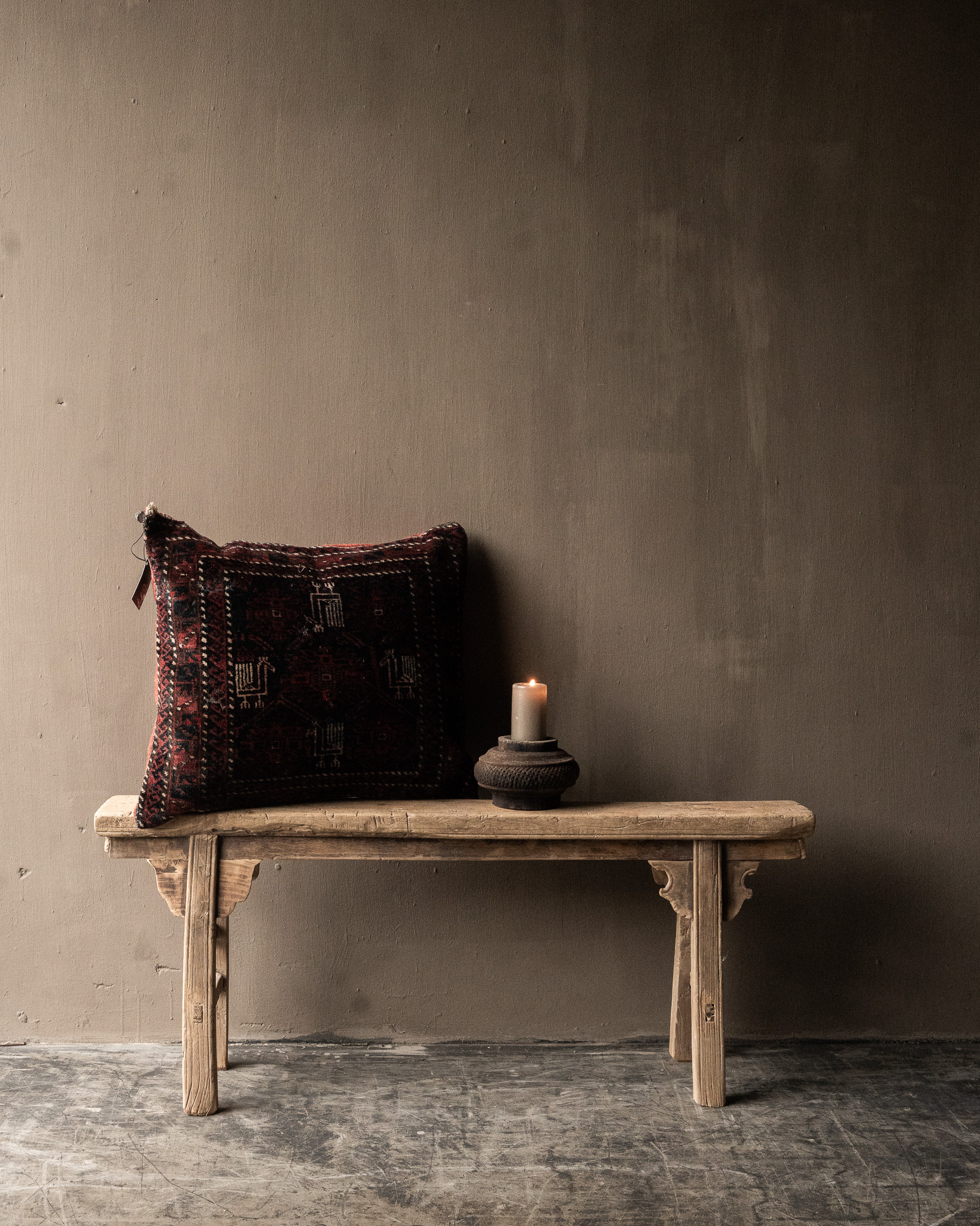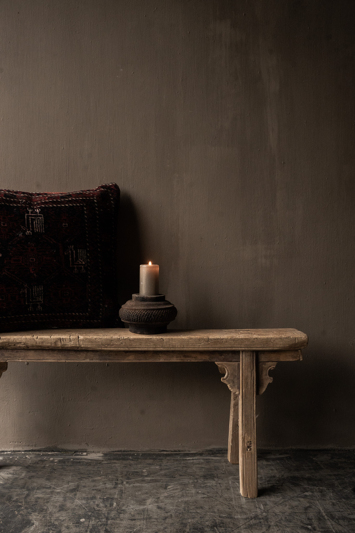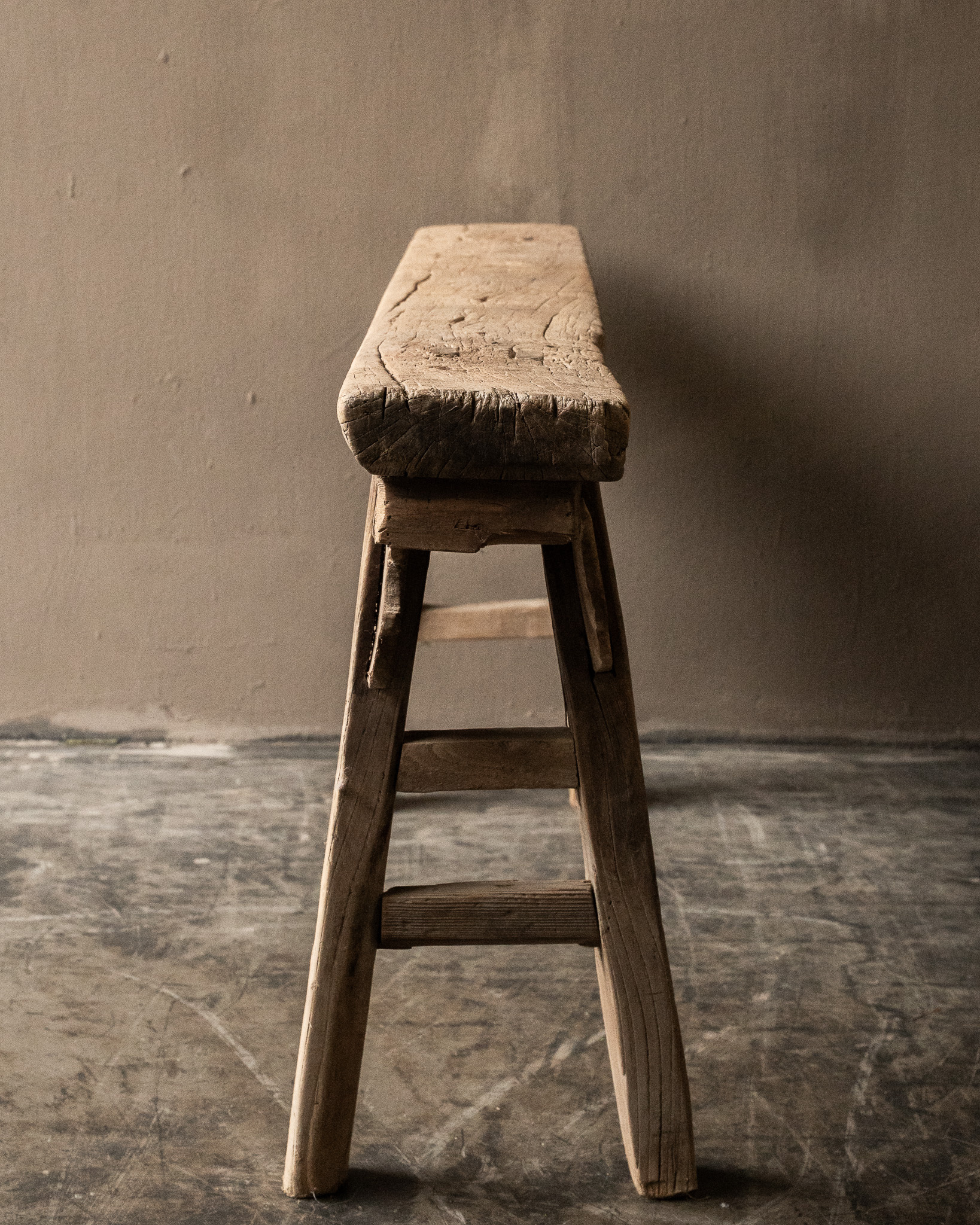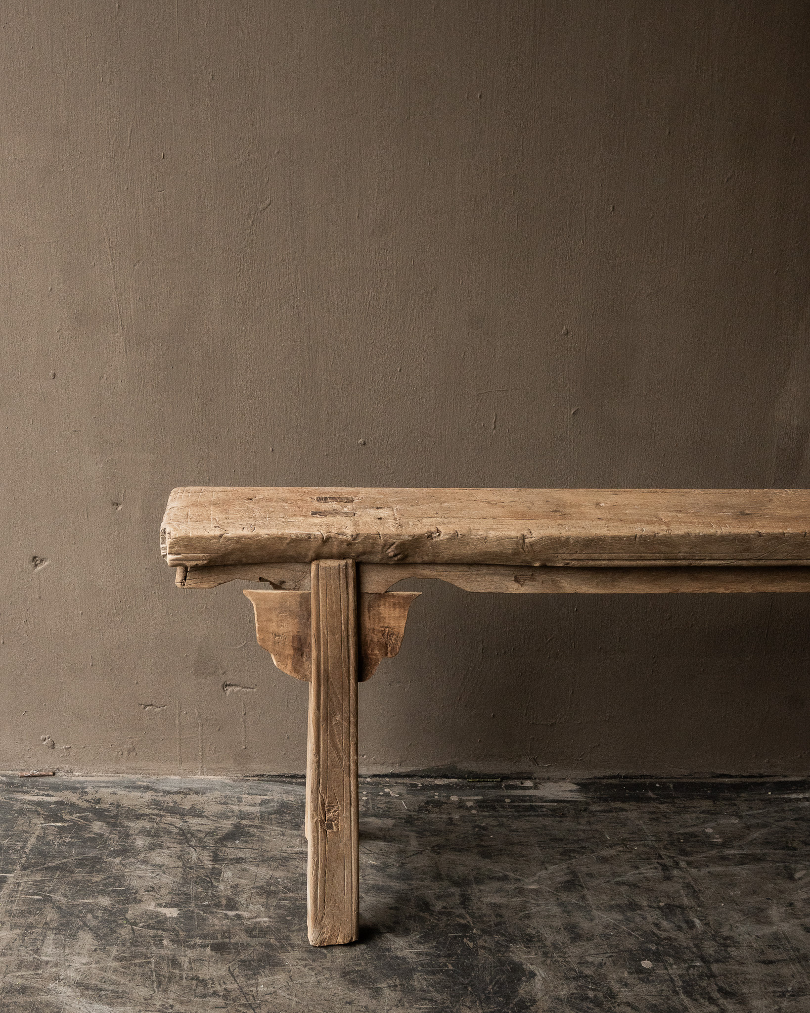 De bank is vervaardigd uit massief oud hout en heeft subtiele, sierlijk uitgesneden details aan de poten. Door zijn natuurlijke patina en eenvoudige vorm past hij moeiteloos in een stoer, sober of landelijk interieur.