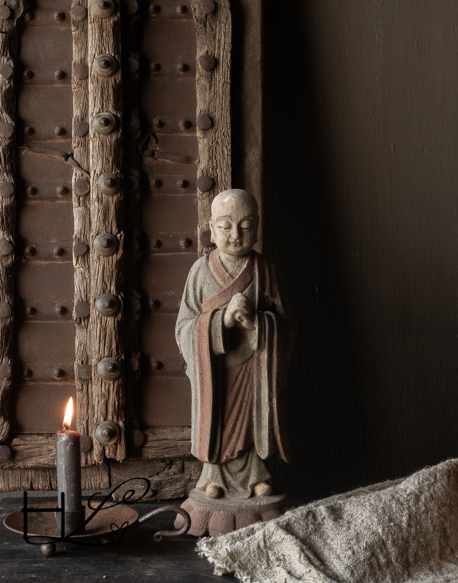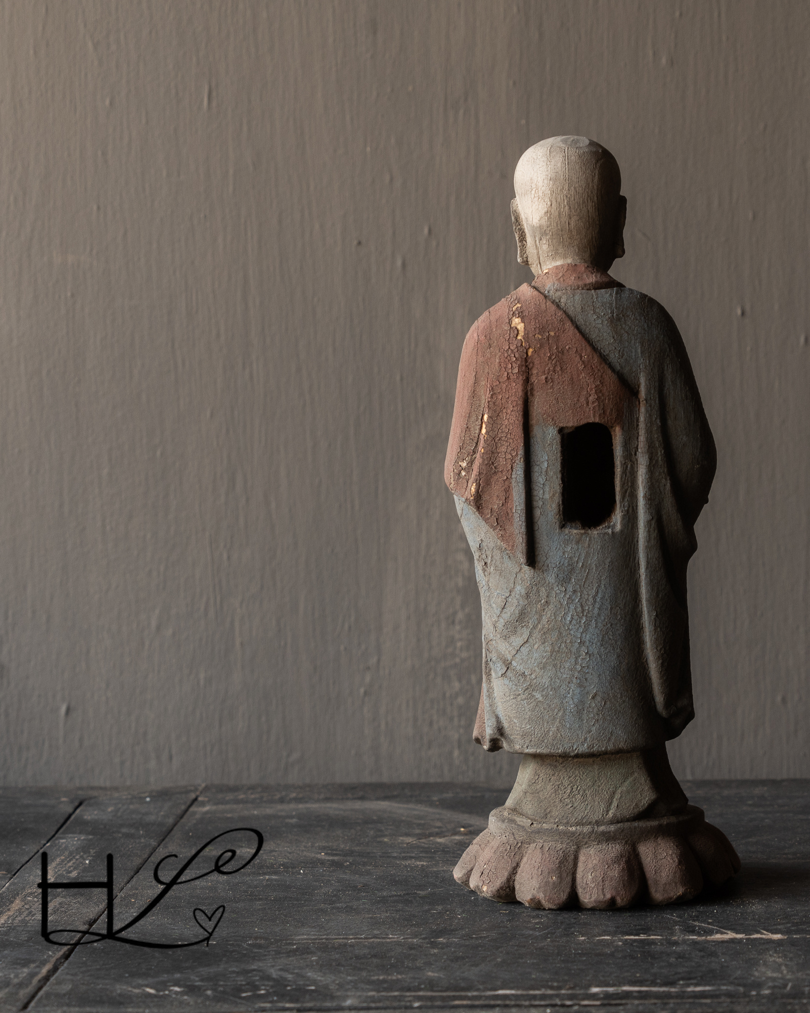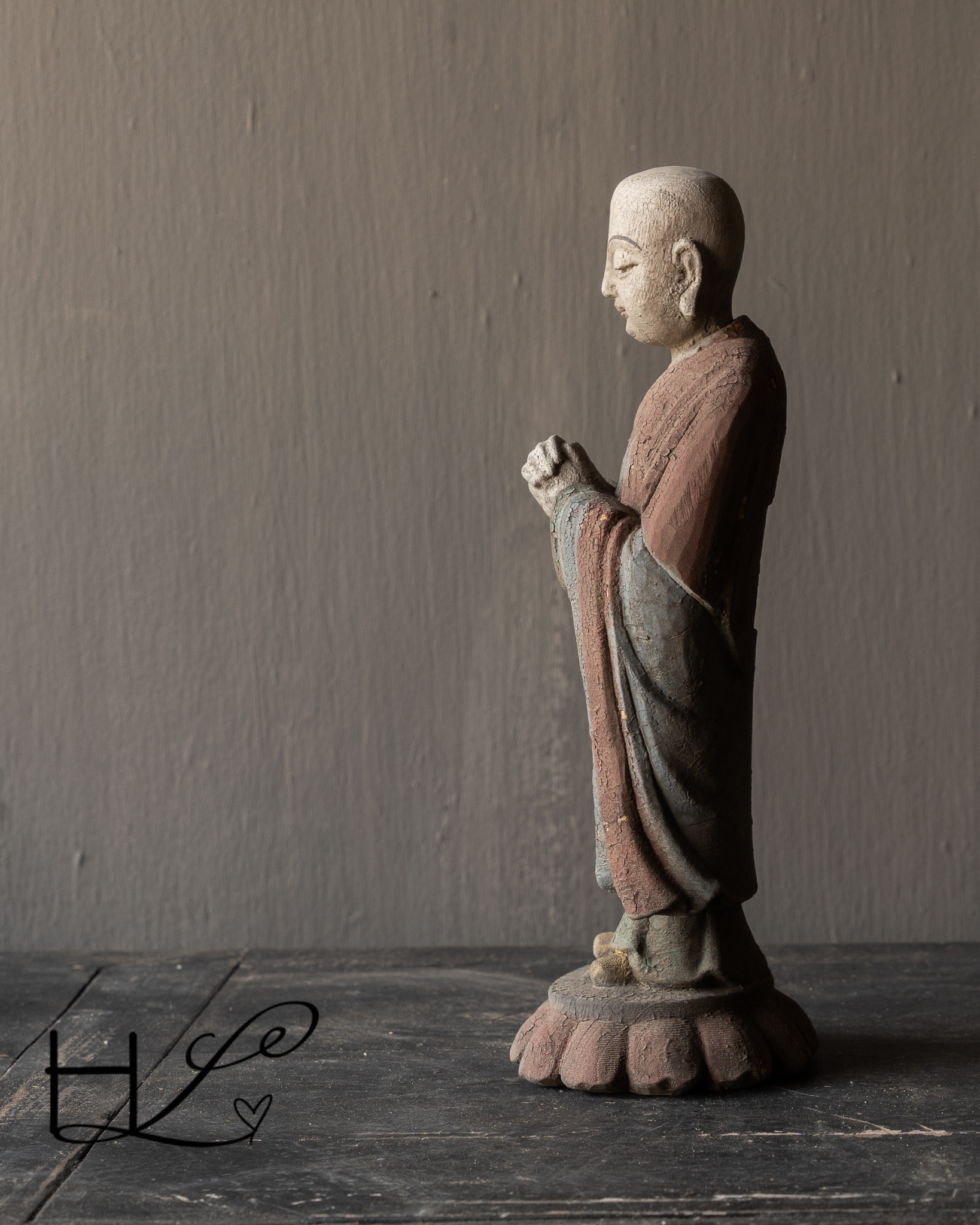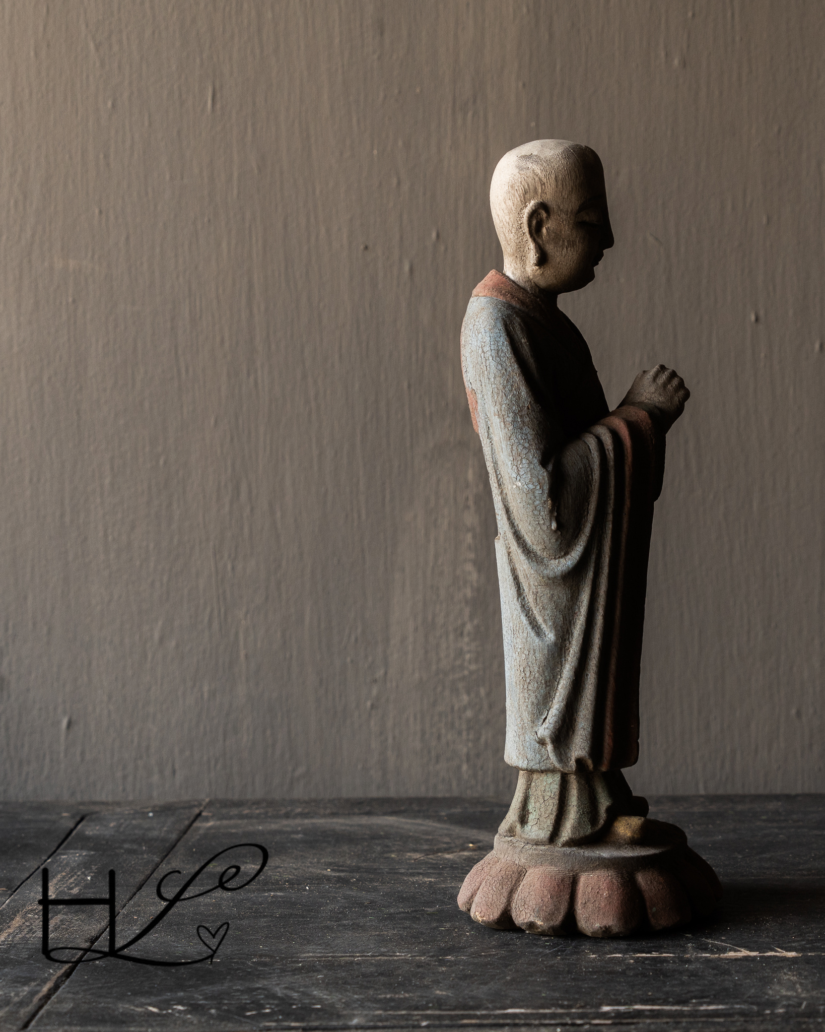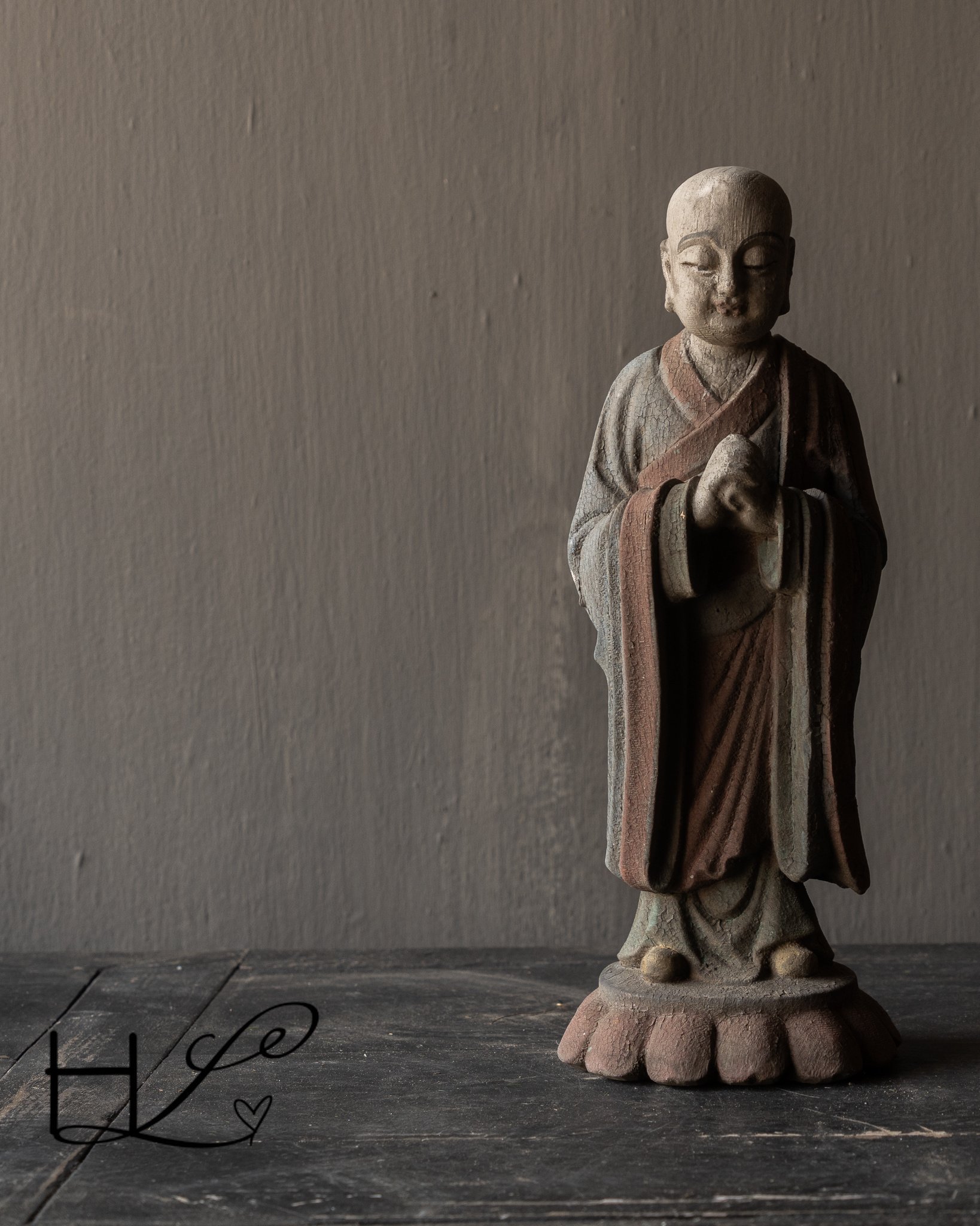 Breng rust en karakter in je interieur met dit bijzondere houten monnikbeeld. Dit beeld is met de hand gesneden uit massief hout en toont een serene boeddhistische monnik in meditatieve houding. De verweerde afwerking en subtiele restanten van oude verf geven het beeld een authentieke, doorleefde uitstraling die perfect past bij een wabi-sabi, landelijk of oosters interieur.