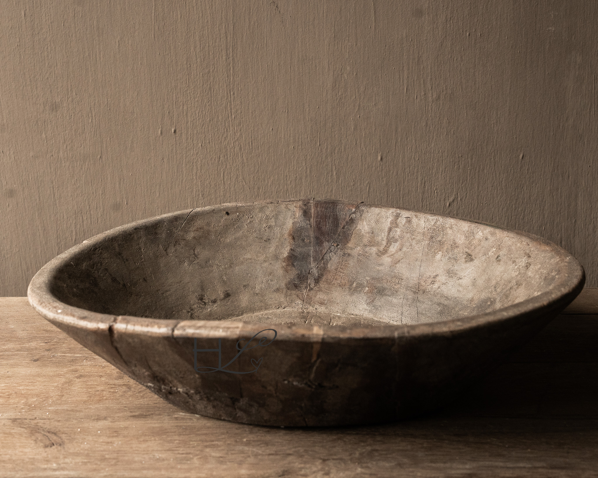 Een prachtig, doorleefde houten schaal met een pure en eenvoudige uitstraling — perfect passend binnen de Wabi Sabi-stijl. Elk exemplaar is uniek, met natuurlijke nerven, oneffenheden en sporen van gebruik die juist zijn charme bepalen.