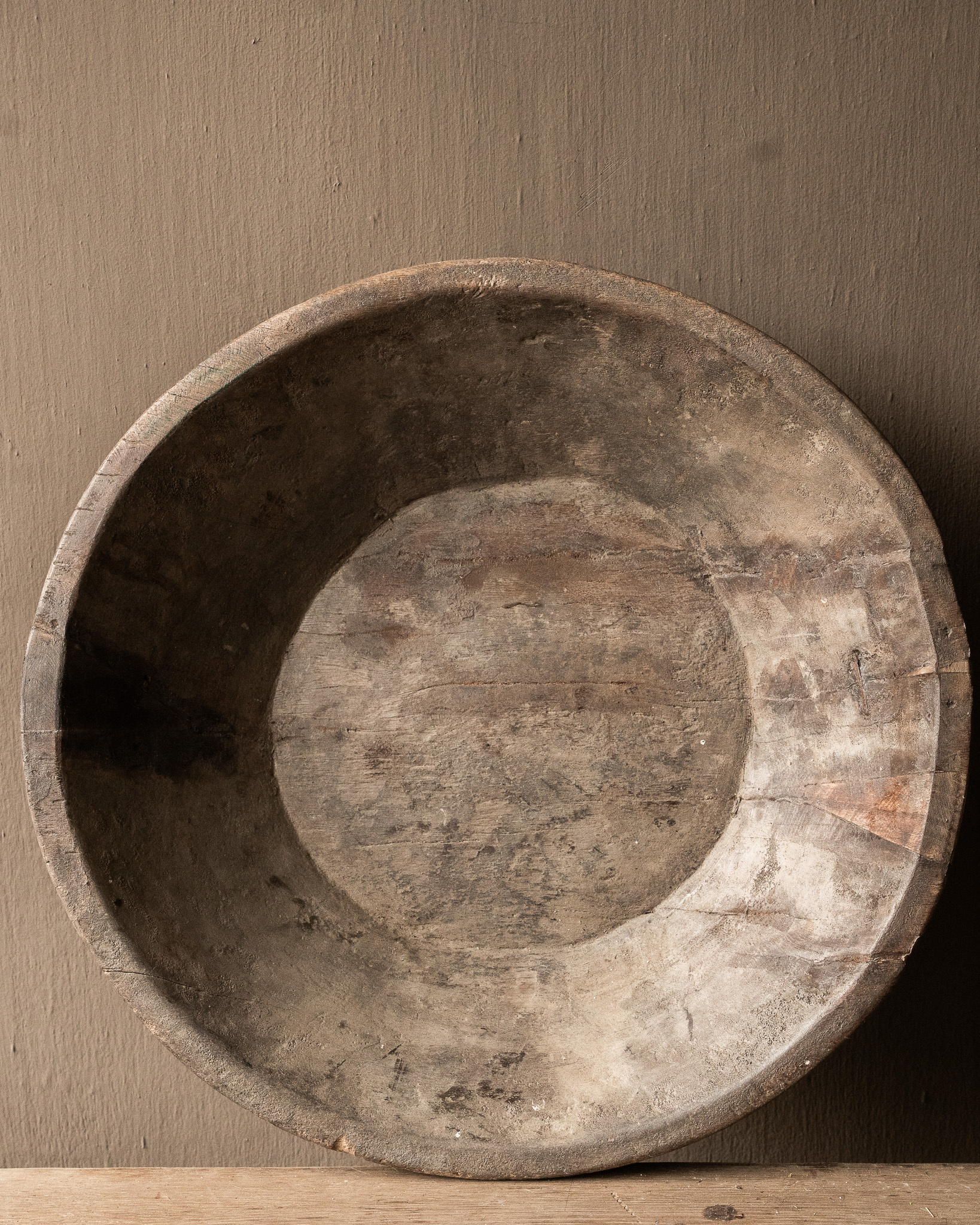 Deze prachtige oude houten schaal uit Nepal heeft een rijke geschiedenis en een doorleefd karakter. Oorspronkelijk werd dit type schaal in Nepal gebruikt voor het kneden van deeg of het bereiden van voedsel, vaak in gezinsverband. Door de jarenlange intensieve toepassing heeft het hout een diepe, warme kleur en een prachtig verweerd oppervlak gekregen.