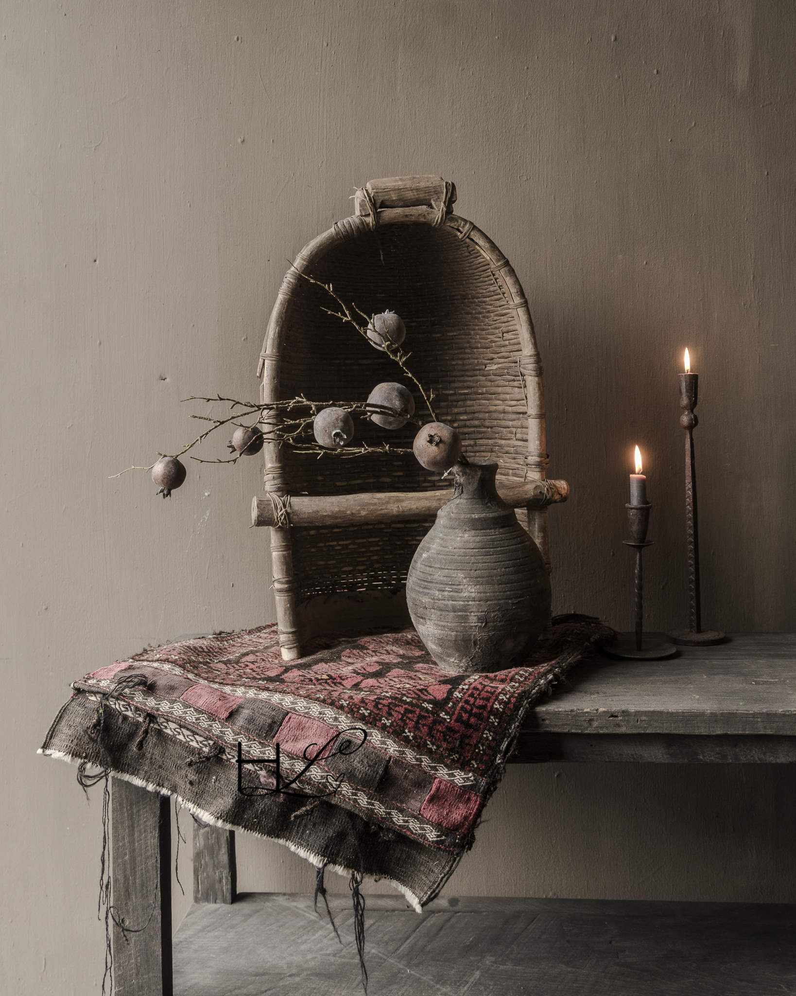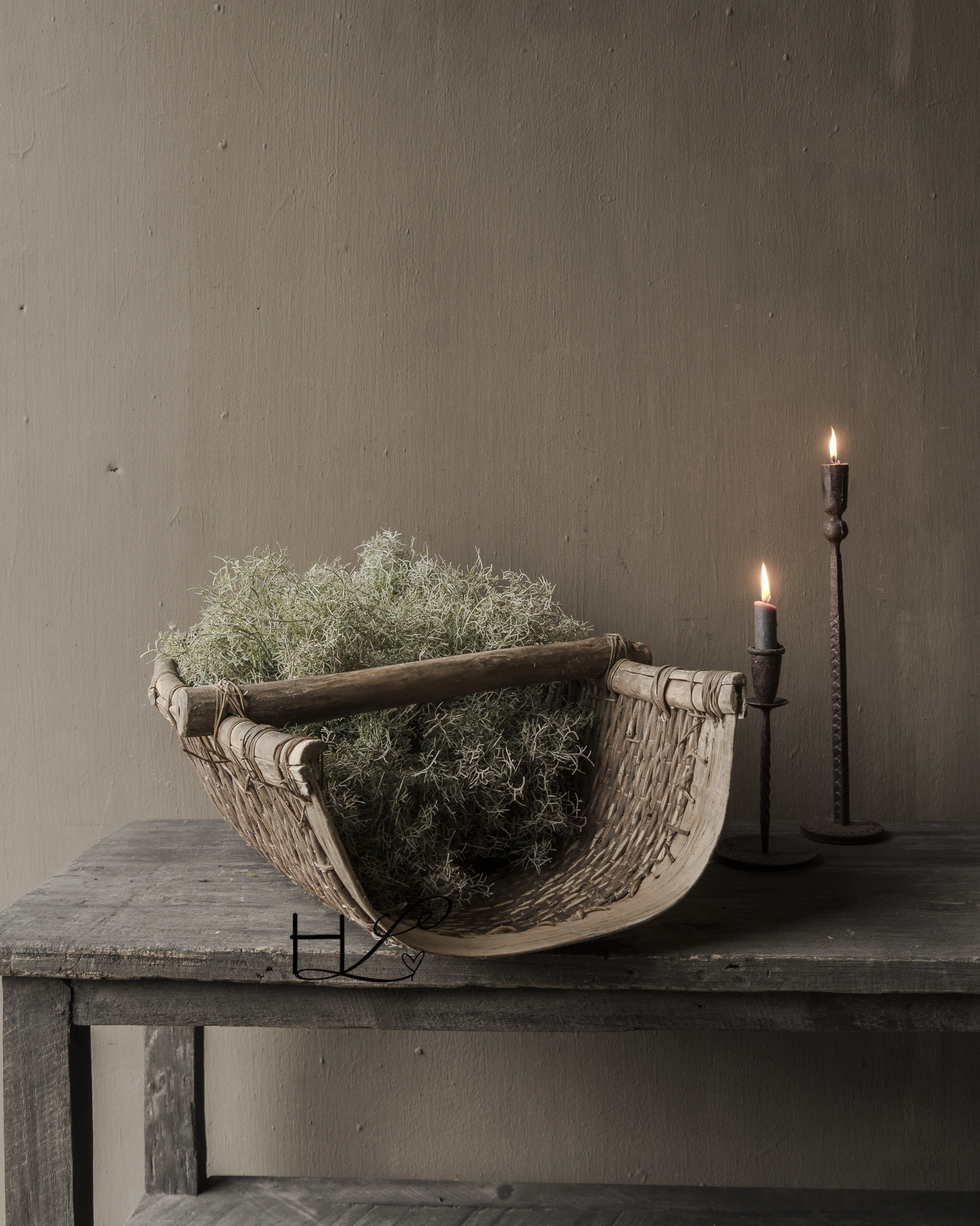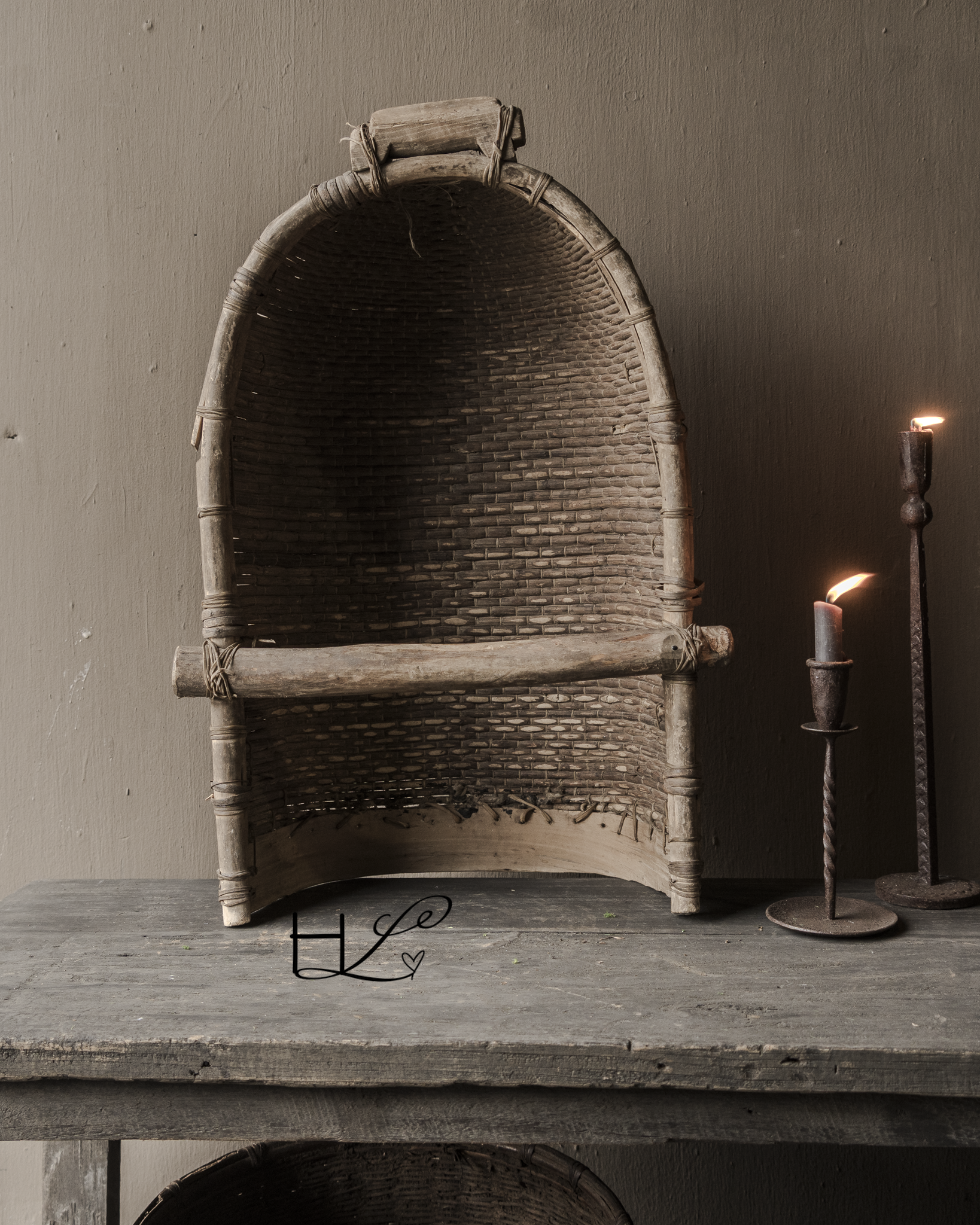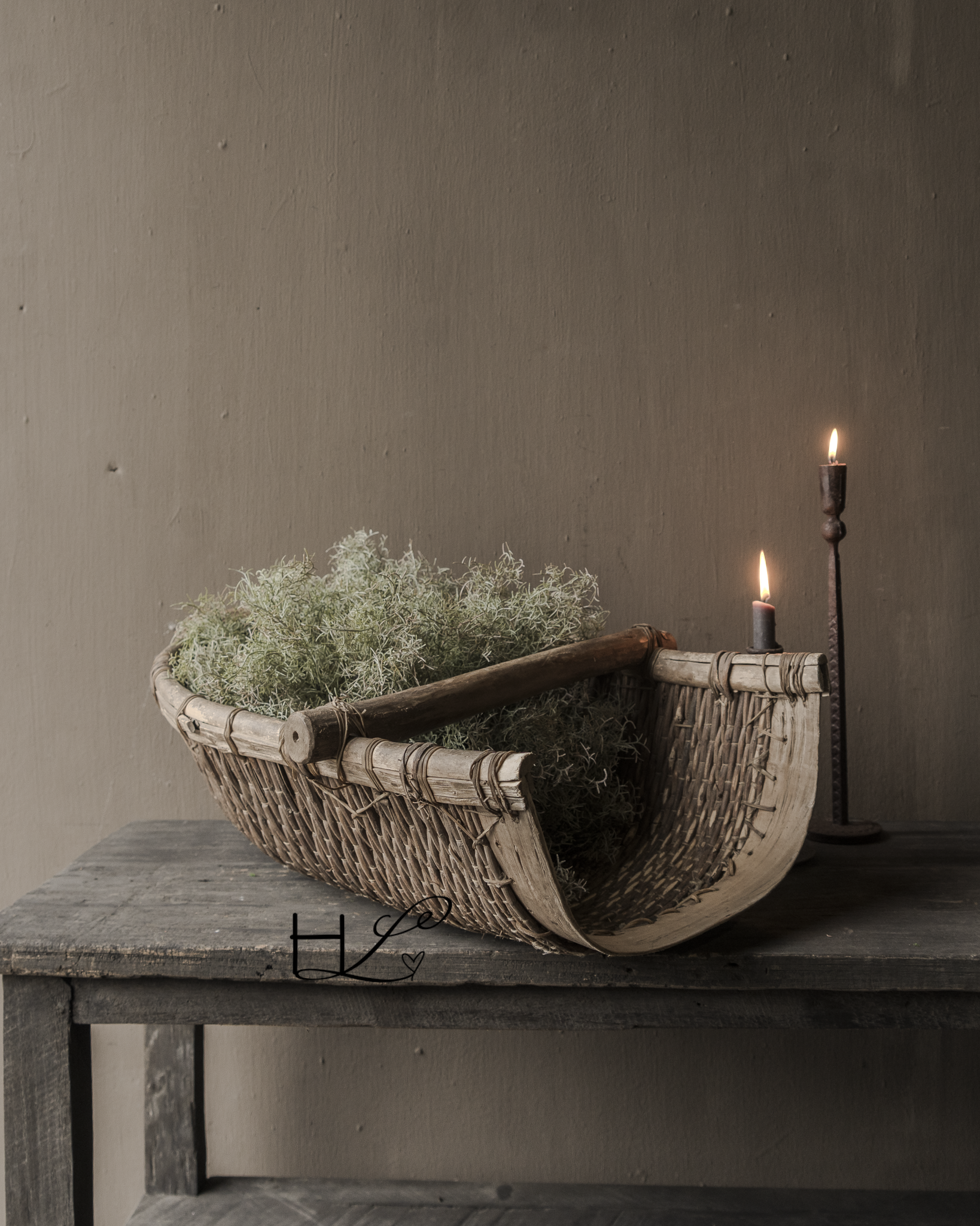 De mand is vervaardigd van gevlochten bamboe met een robuust houten frame en handgreep. De natuurlijke vergrijzing, kleine oneffenheden en subtiele gebruikssporen geven elk exemplaar een eigen verhaal. Geen enkele mand is exact gelijk – juist dat maakt haar zo bijzonder.