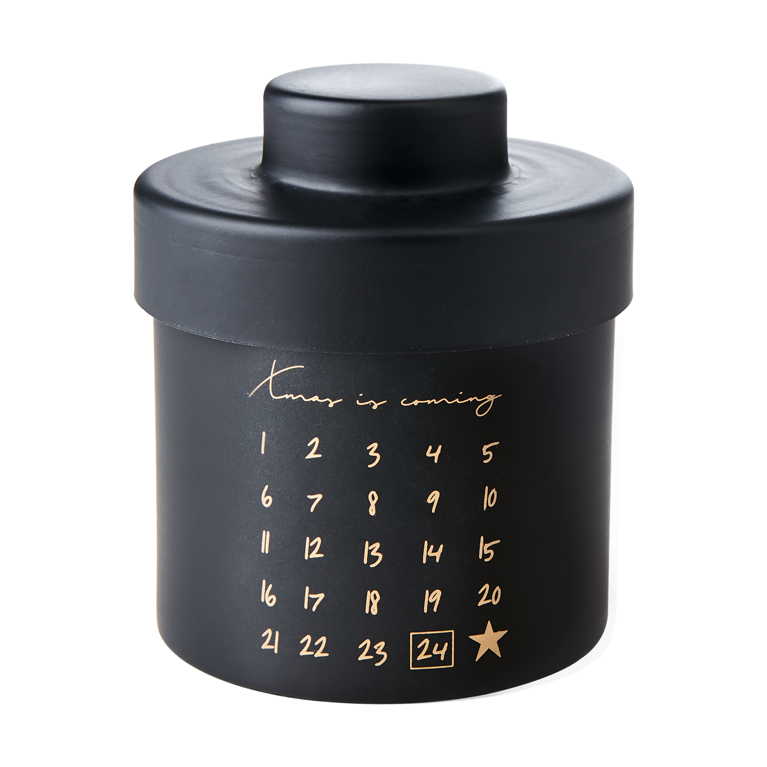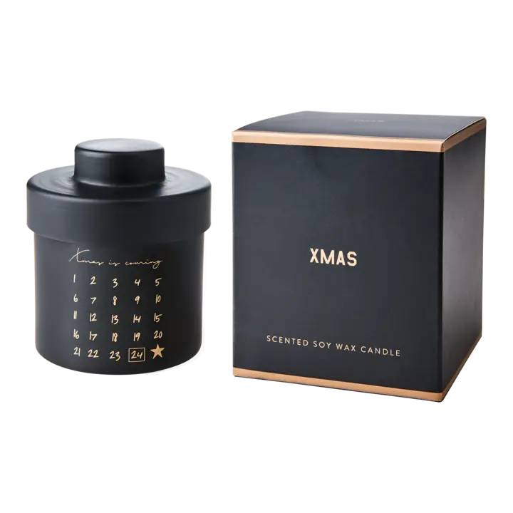 Heerlijke sojawas-geurkaars in matzwarte pot met gouden opdruk — een stijlvolle knipoog naar de decembermaand.