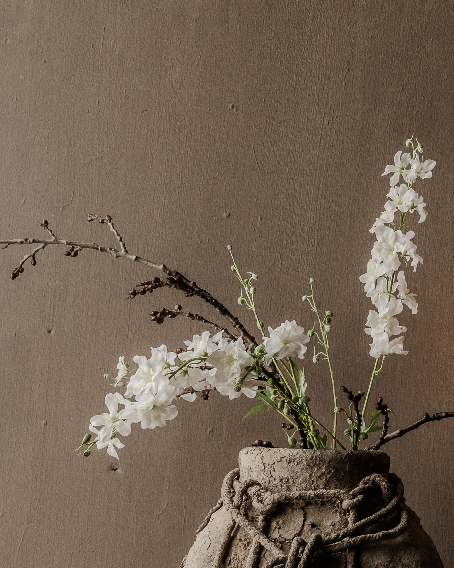 Combineer deze Delphinium tak met een ruwe, aardse pot of kruik voor een prachtig contrast tussen zacht en stoer — precies zoals op de foto’s.