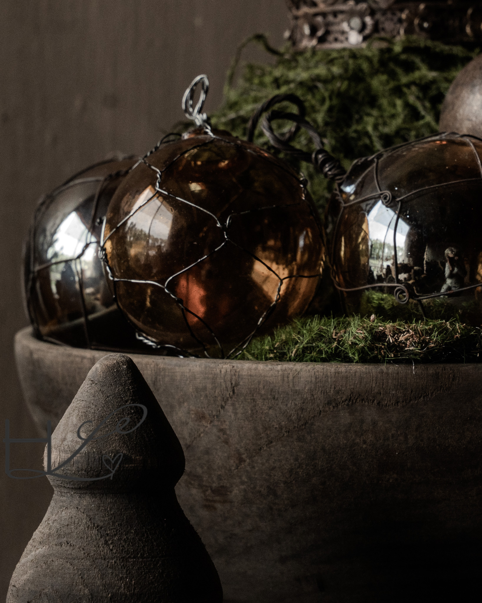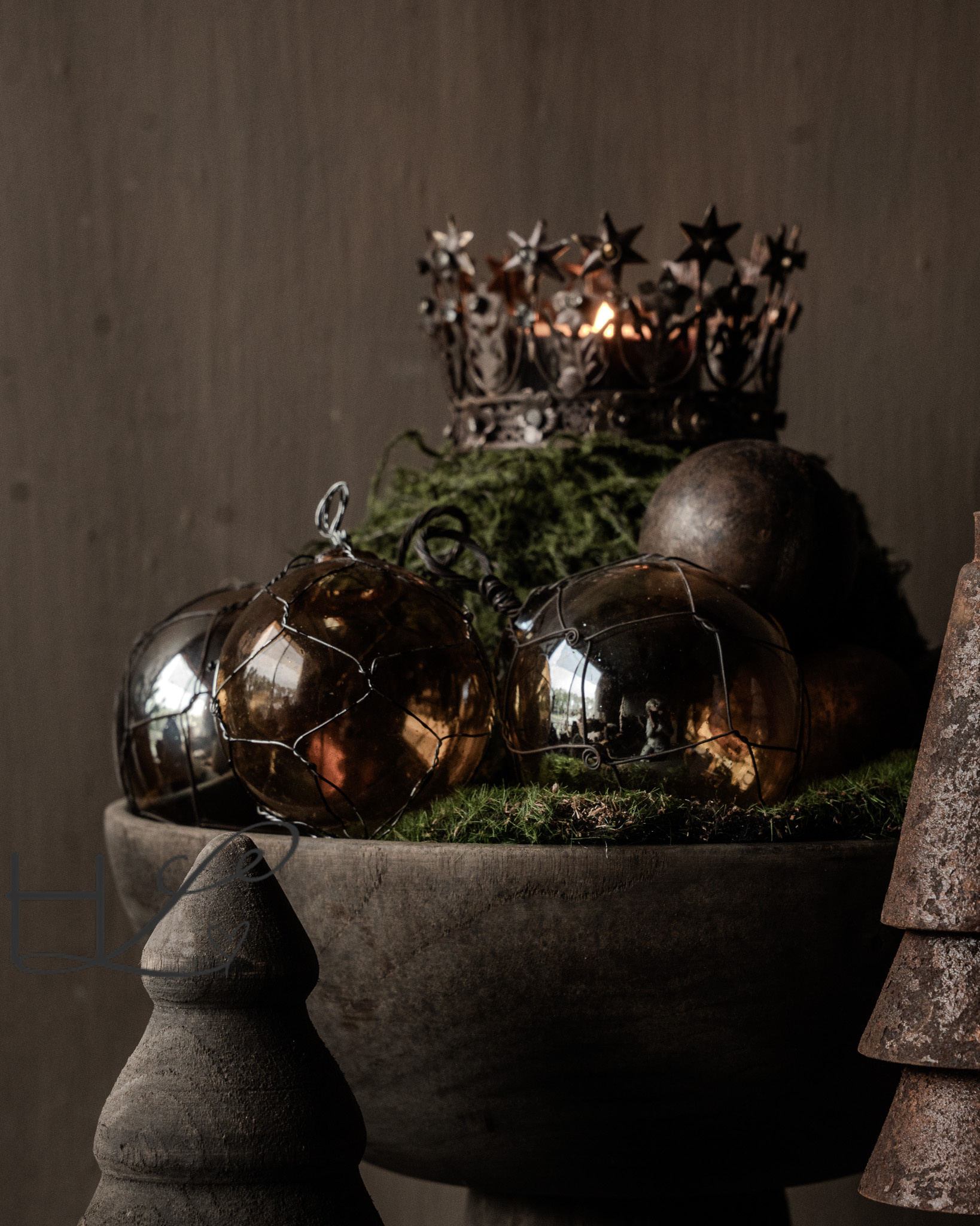 Perfect voor in de kerstboom, aan een krans of decoratief in een schaal met mos, groen en kaarslicht — zoals op de foto te zien is. De combinatie van glans en ruw metaal geeft deze bal een uniek karakter dat moeiteloos past binnen een sobere, natuurlijke kerststijl.