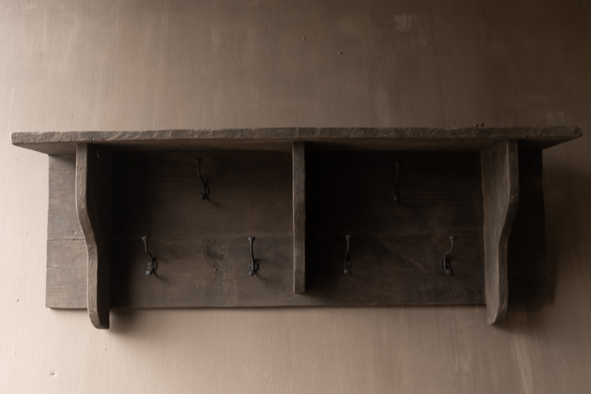 Het massieve hout toont zijn natuurlijke nerven en kleurnuances, terwijl de ijzeren haken zorgen voor een subtiele industriële touch. Deze kapstok is niet alleen functioneel, maar ook een decoratief object op zich.