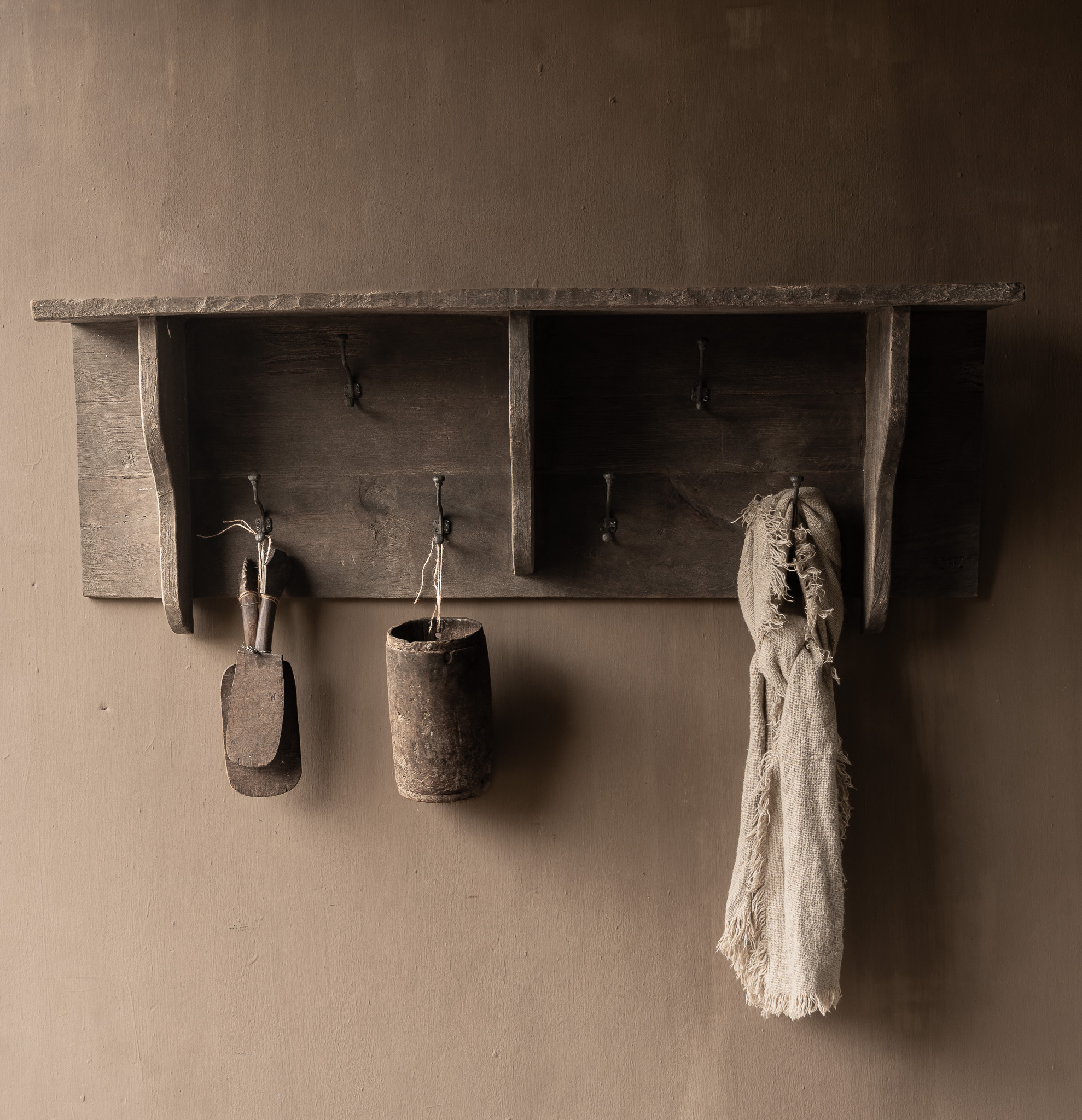 De ijzeren haken geven een stoer accent, zonder de zachtheid van het hout te verstoren. Ideaal voor in een landelijke hal, keuken of slaapkamer waar functionaliteit en sfeer samenkomen.