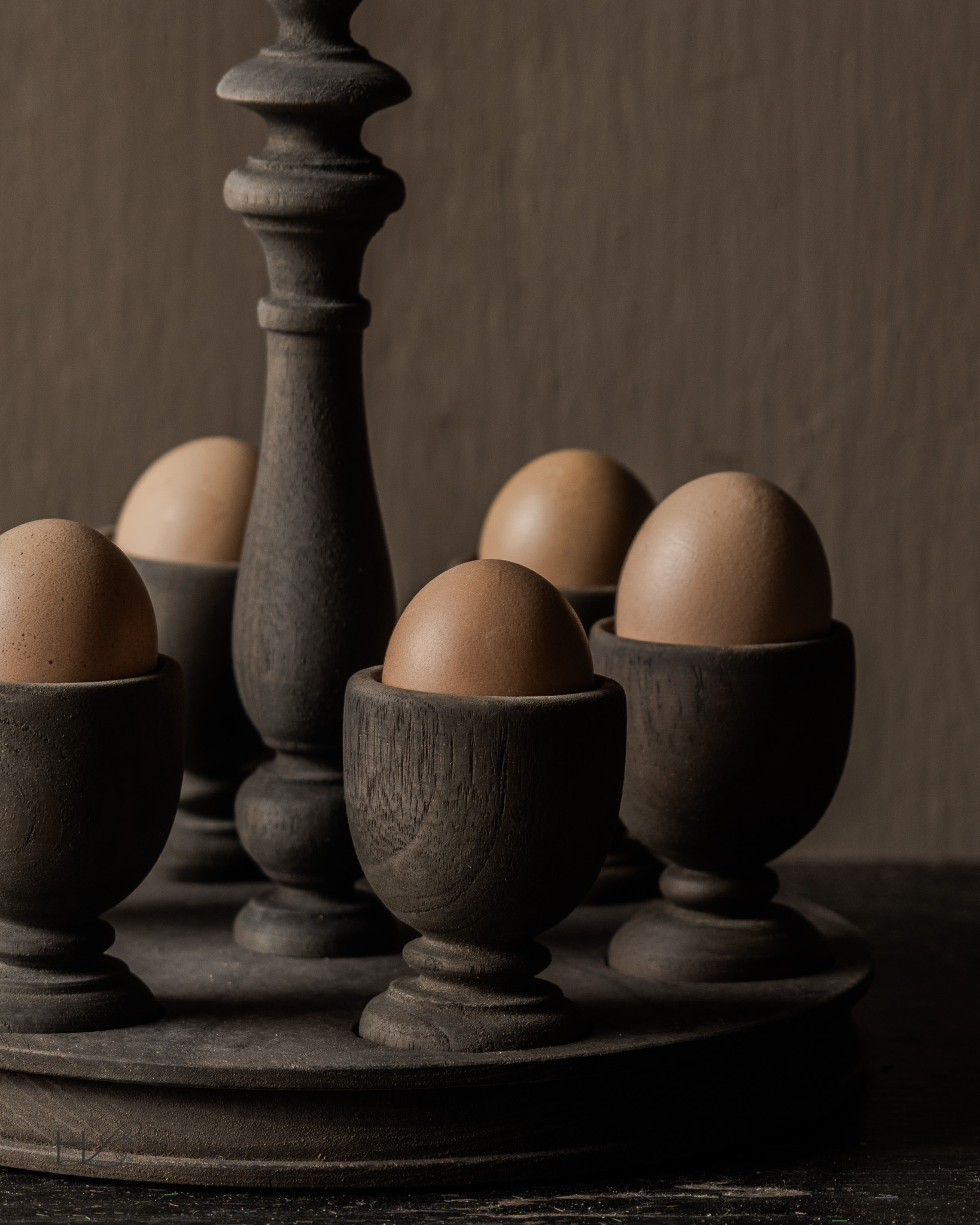 Een sfeervolle houten eierdopjeshouder met bijpassende eierdopjes, uitgevoerd in een mooie sobere, doorleefde houttint. De set heeft een ambachtelijke uitstraling en past perfect binnen een stoer, landelijk en wabi-sabi interieur.