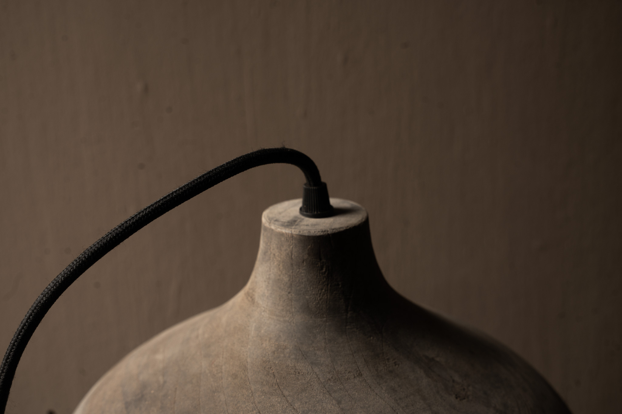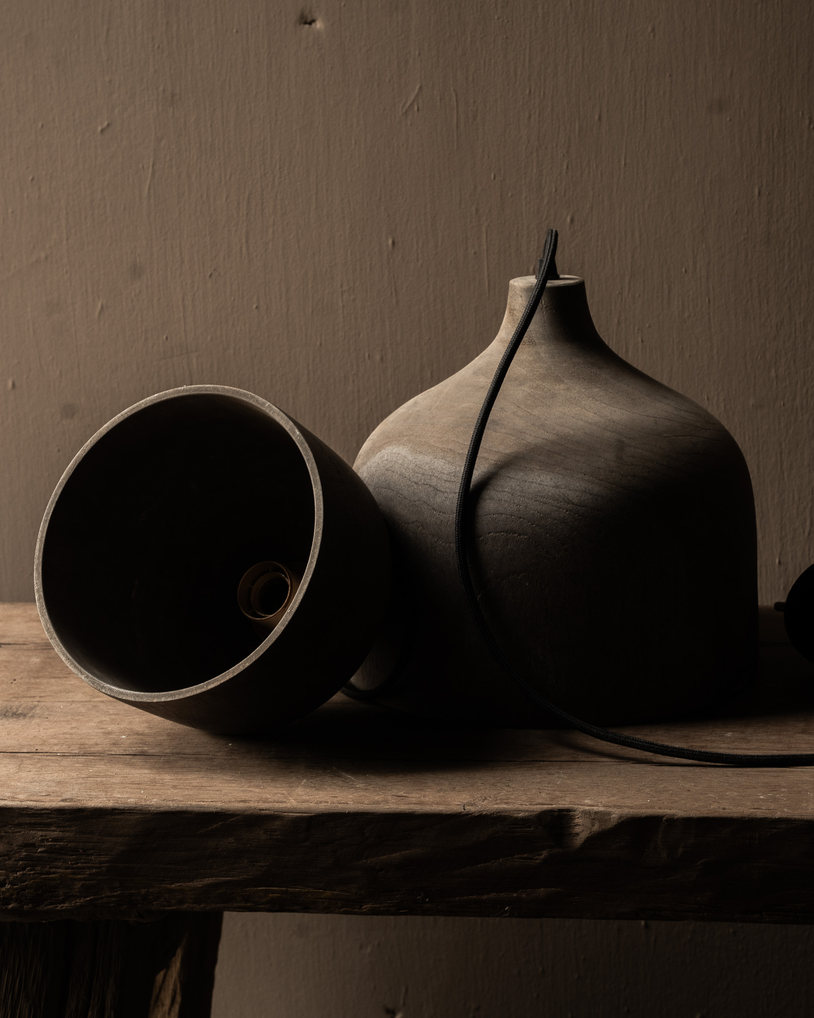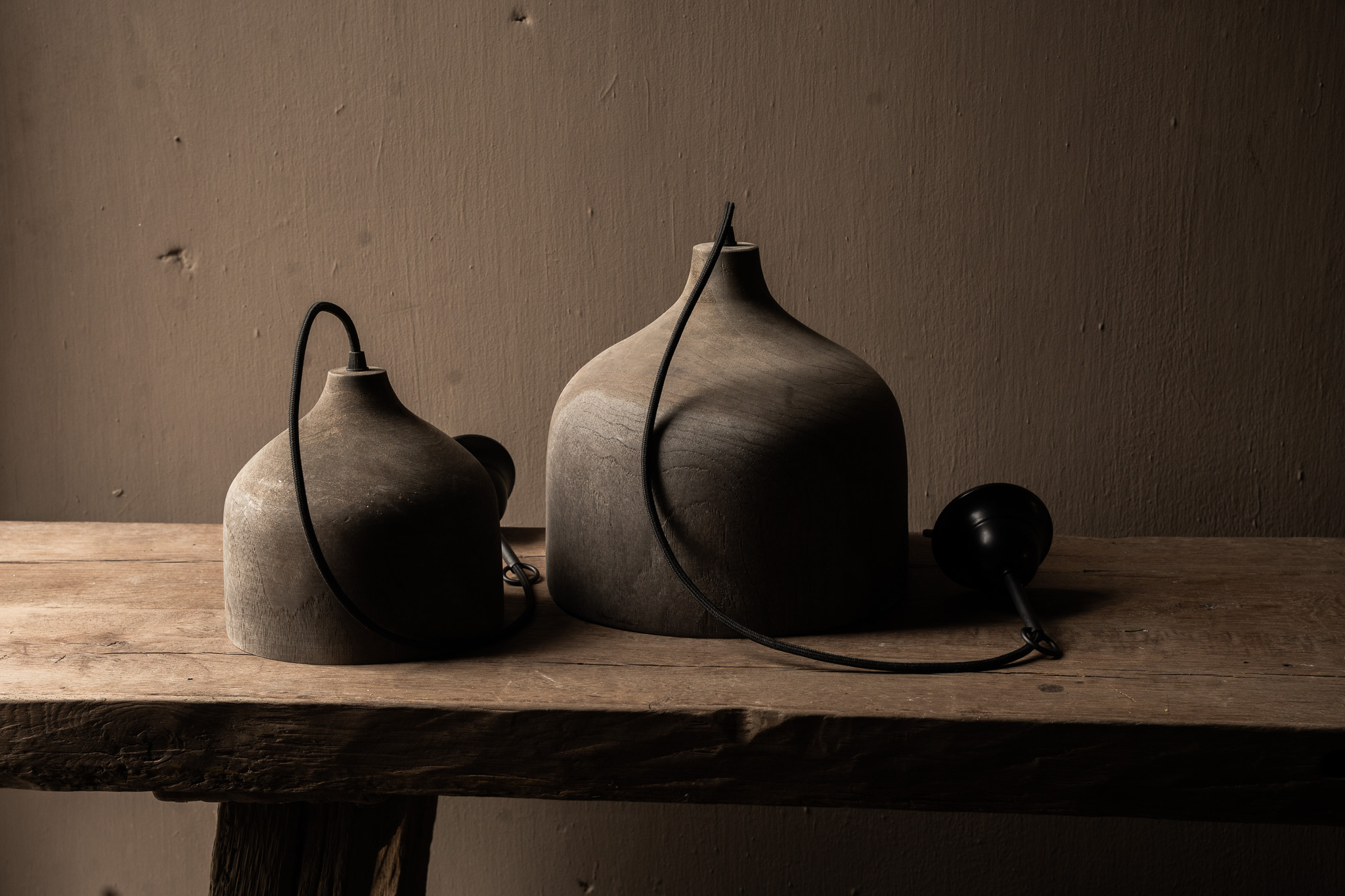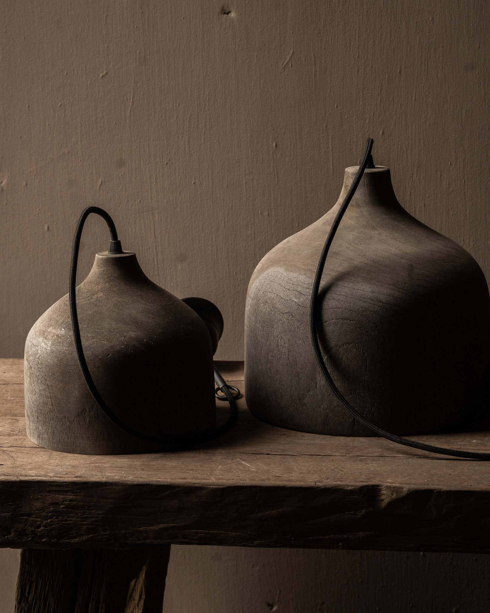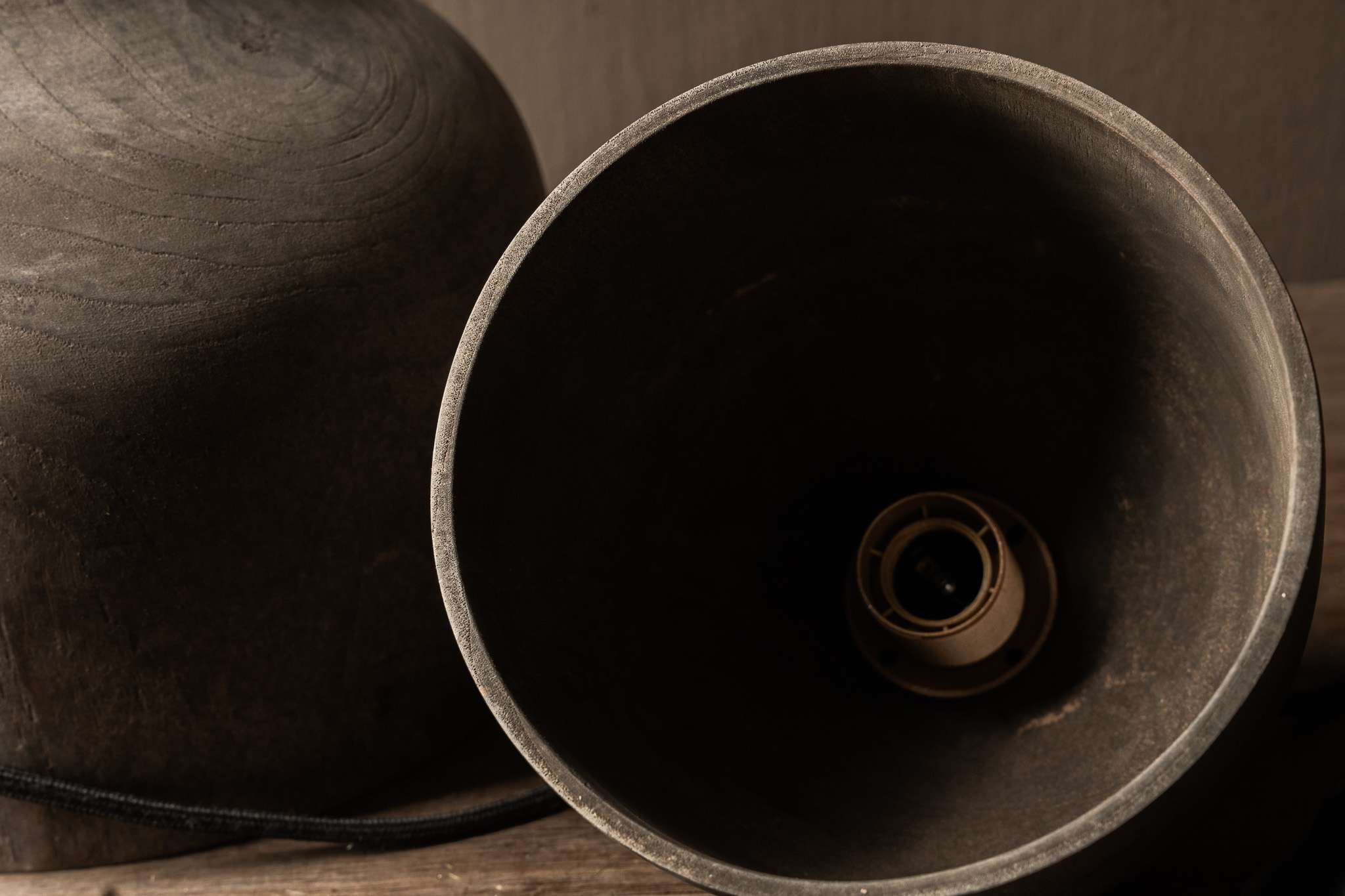 Een stoere, natuurlijke hanglamp met een pure uitstraling. Deze lamp is met de hand vervaardigd uit massief hout en heeft een matte, doorleefde afwerking die prachtig past binnen een sober, landelijk of wabi-sabi interieur.