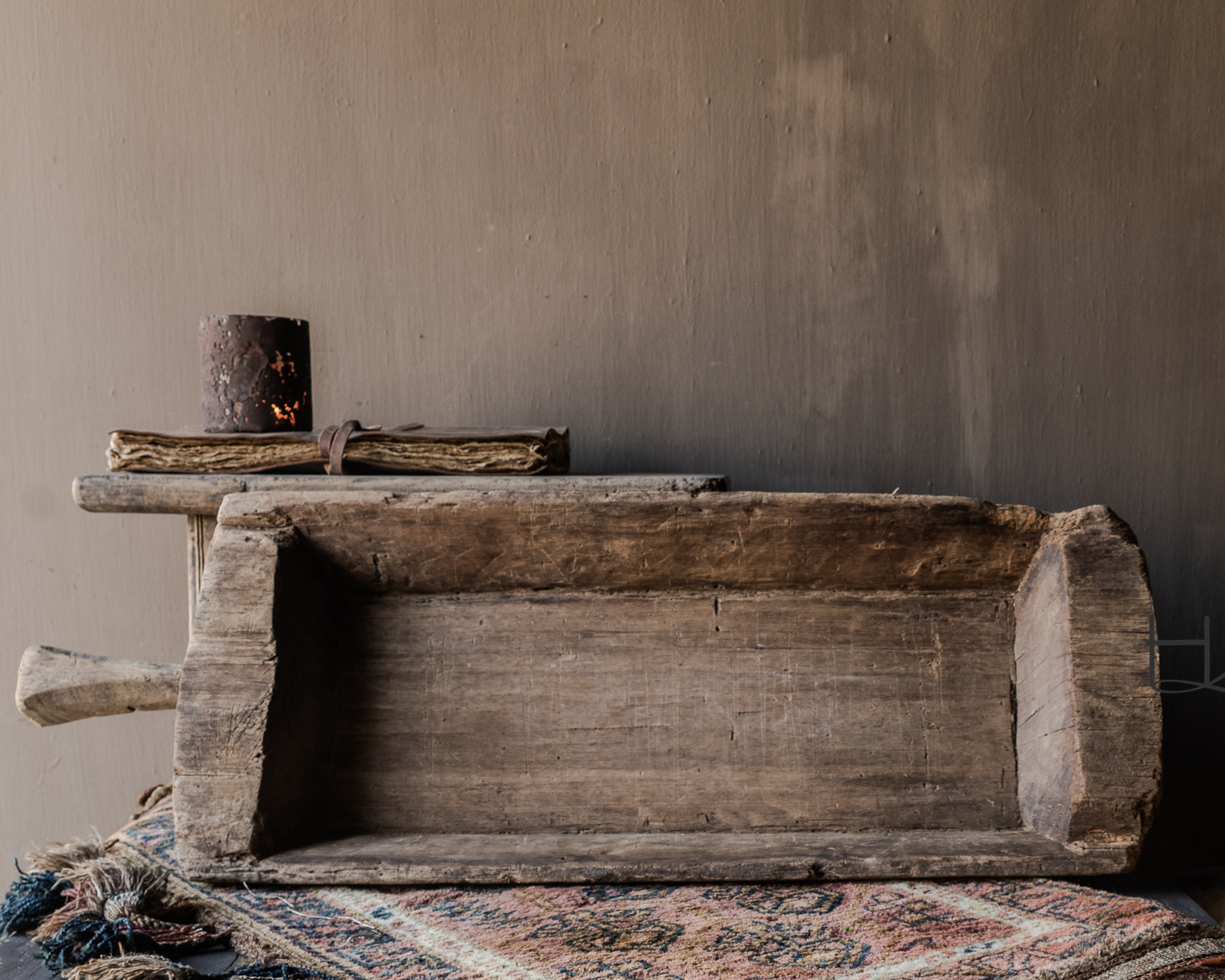 De trog is rechthoekig van vorm en voorzien van een handvat, wat het geheel een authentiek en ambachtelijk karakter geeft. Door de stevige wanden en het massieve hout voelt de bak zwaar en solide aan. Elk exemplaar is uniek; geen twee troggen zijn exact gelijk.