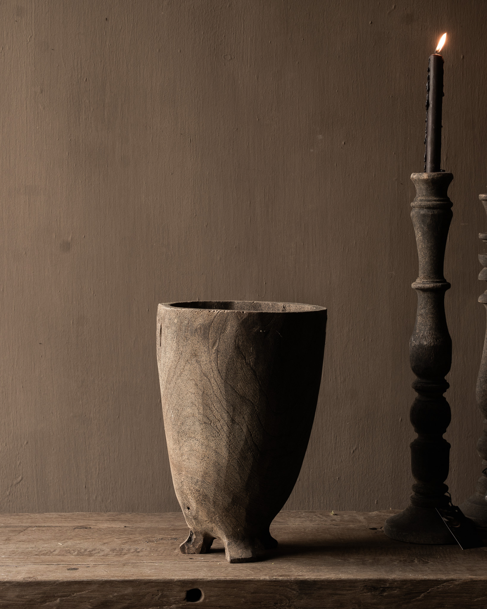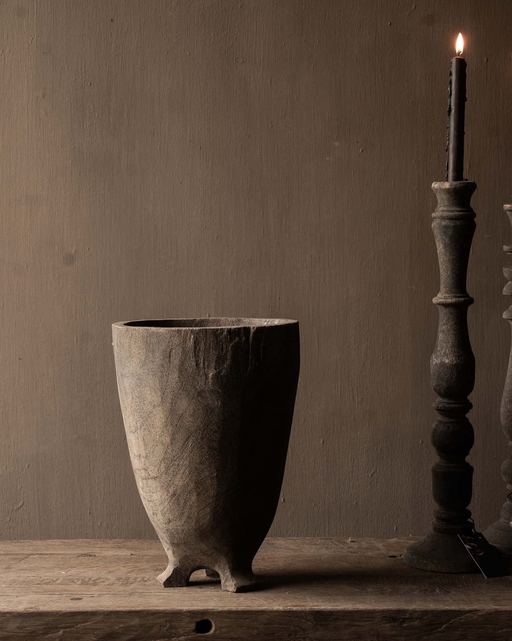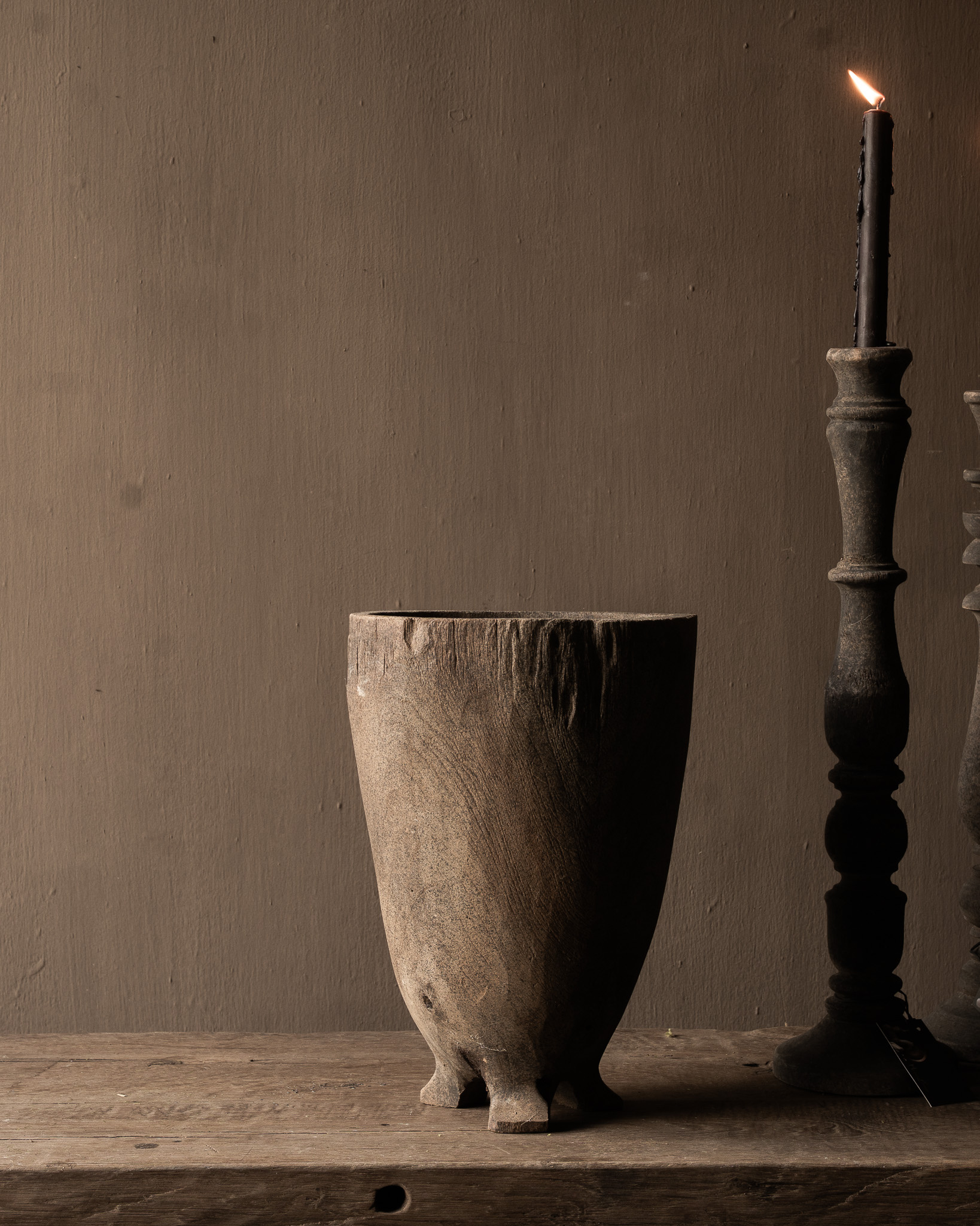Een stoer en uniek object met karakter — handgemaakt uit één massief stuk hout. Deze imperfecte houten pot rust op drie subtiele pootjes en heeft een pure, natuurlijke uitstraling die perfect past binnen een sober, landelijk of wabi-sabi interieur.