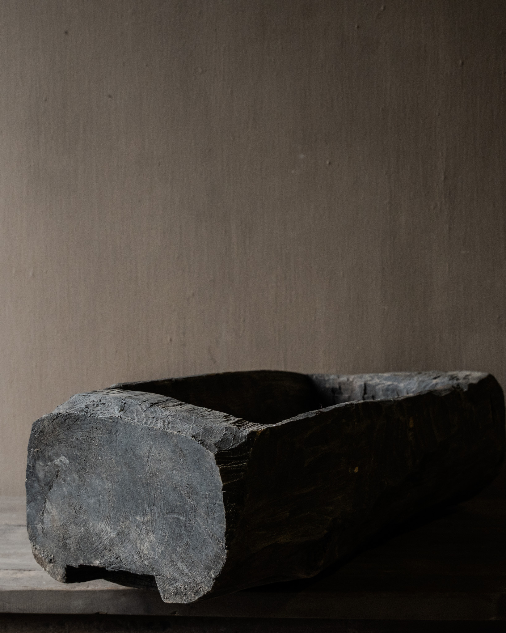 Deze prachtige, imperfecte houten trog is volledig met de hand uit één massief stuk oud hout gemaakt. De doorleefde structuur, ruwe afwerking en natuurlijke vormen geven dit object een uniek karakter dat direct warmte en sfeer toevoegt aan je interieur.