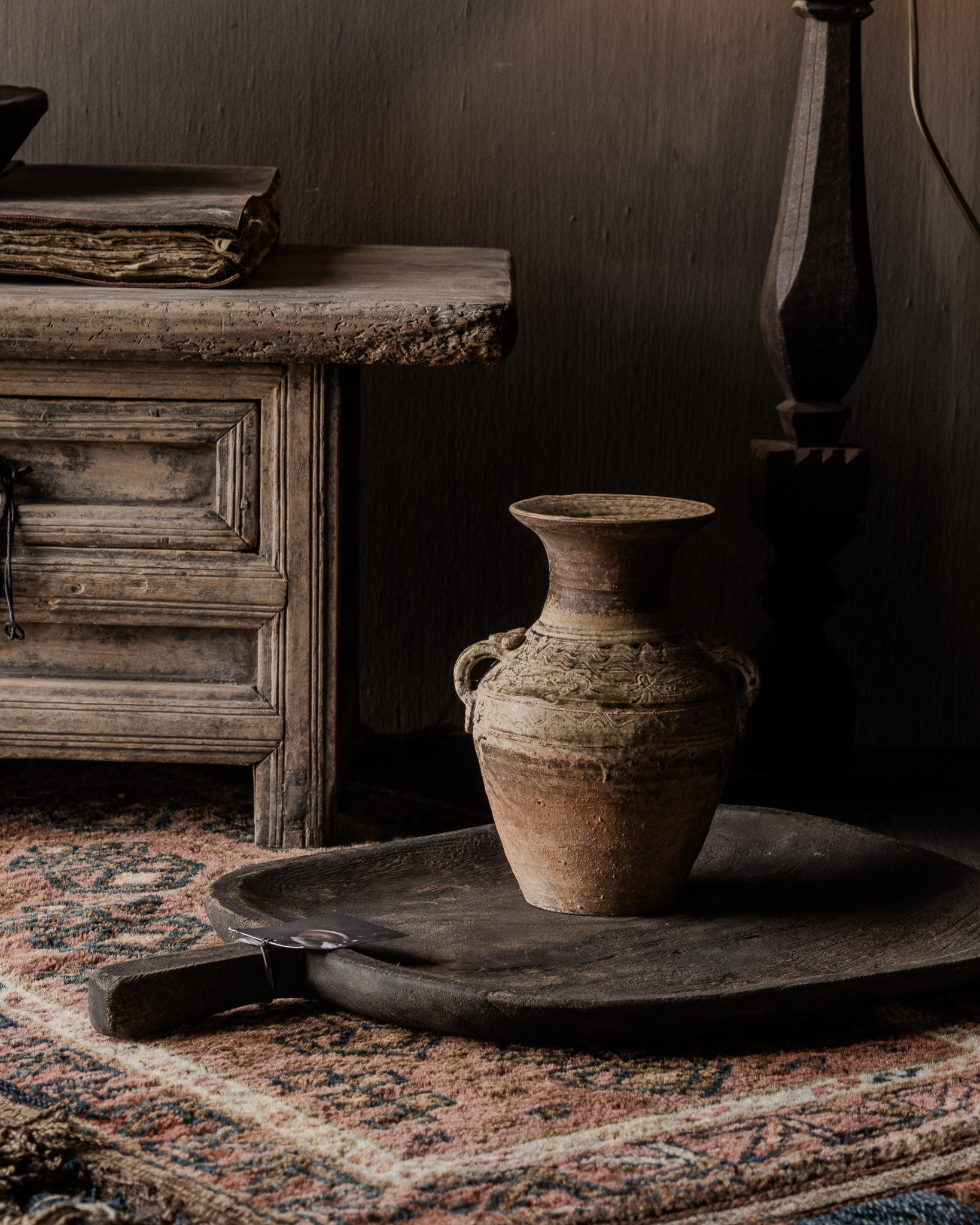Plaats de kruik op een robuuste houten tafel, een oud kastje of op een schaal met andere natuurlijke accessoires voor een warme en rustige sfeer in huis. Ook zonder inhoud vormt deze kruik een krachtig decoratief object dat direct karakter toevoegt aan een interieur.