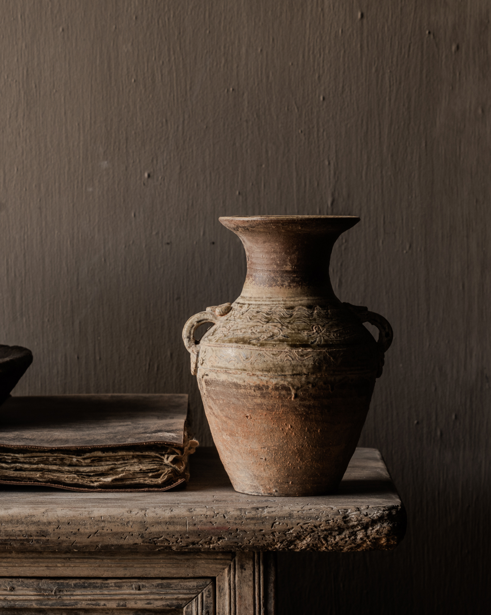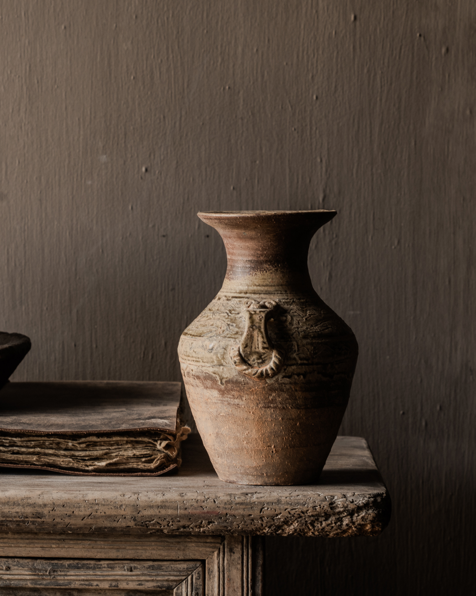 Deze oude aardewerken kruik straalt pure eenvoud en karakter uit. Het handgevormde aardewerk en de door de tijd gevormde patina geven dit stuk een authentieke uitstraling die perfect past binnen een stoer en sober interieur. De natuurlijke kleitinten, subtiele reliëfdetails en lichte onregelmatigheden maken iedere kruik uniek.