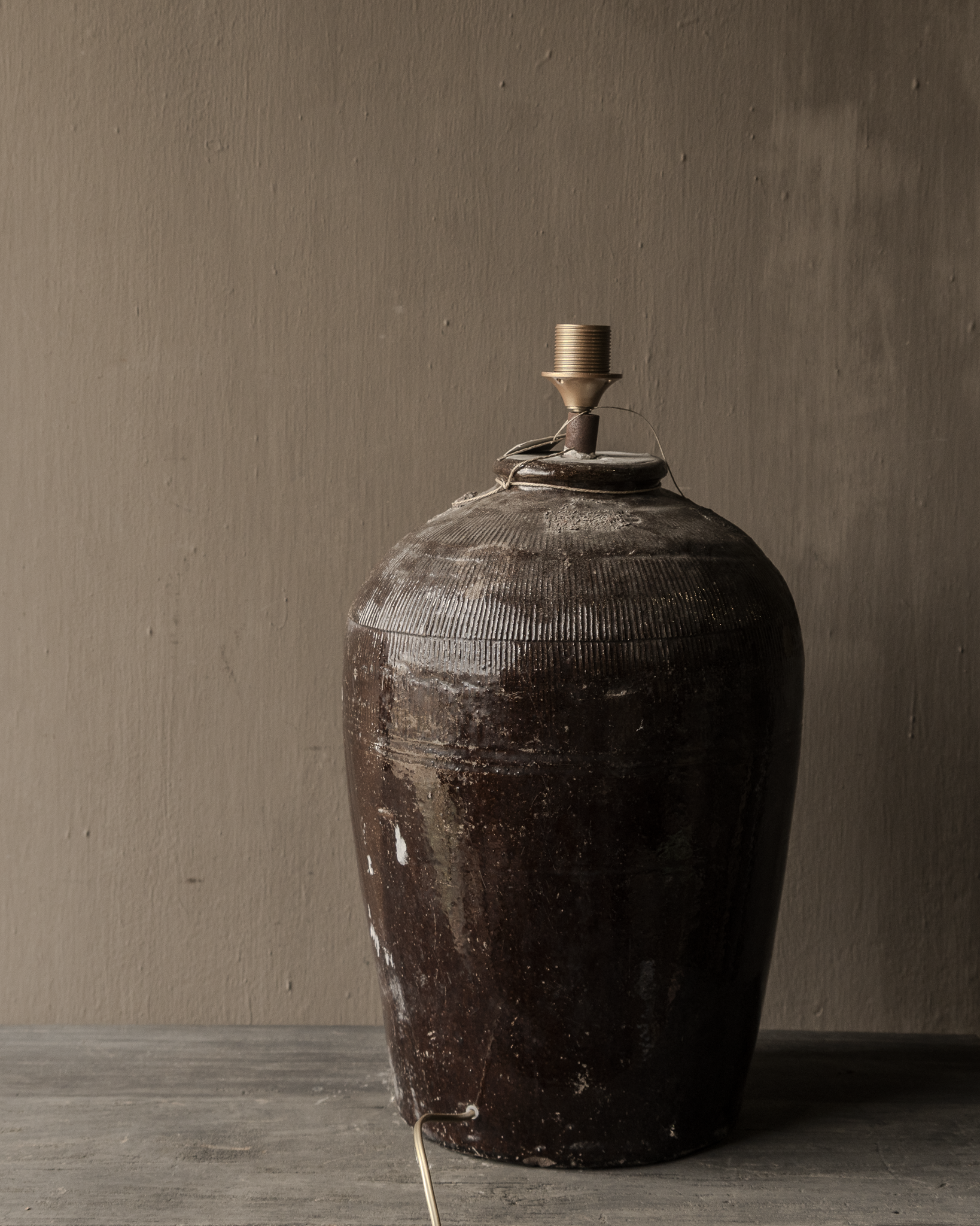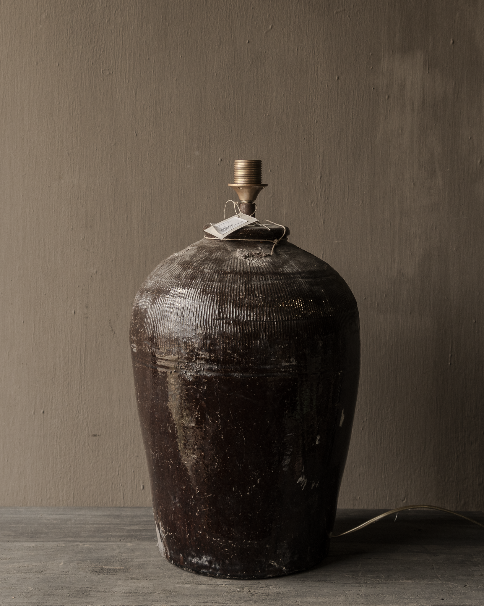 Deze bijzondere kruiklamp is vervaardigd uit een authentieke oude rijstkruik en heeft daardoor een unieke, doorleefde uitstraling. Het robuuste aardewerk met zijn donkere glazuur en subtiele patina geeft de lamp karakter en maakt ieder exemplaar één van een soort. Perfect passend binnen een stoer, sober en sfeervol interieur.