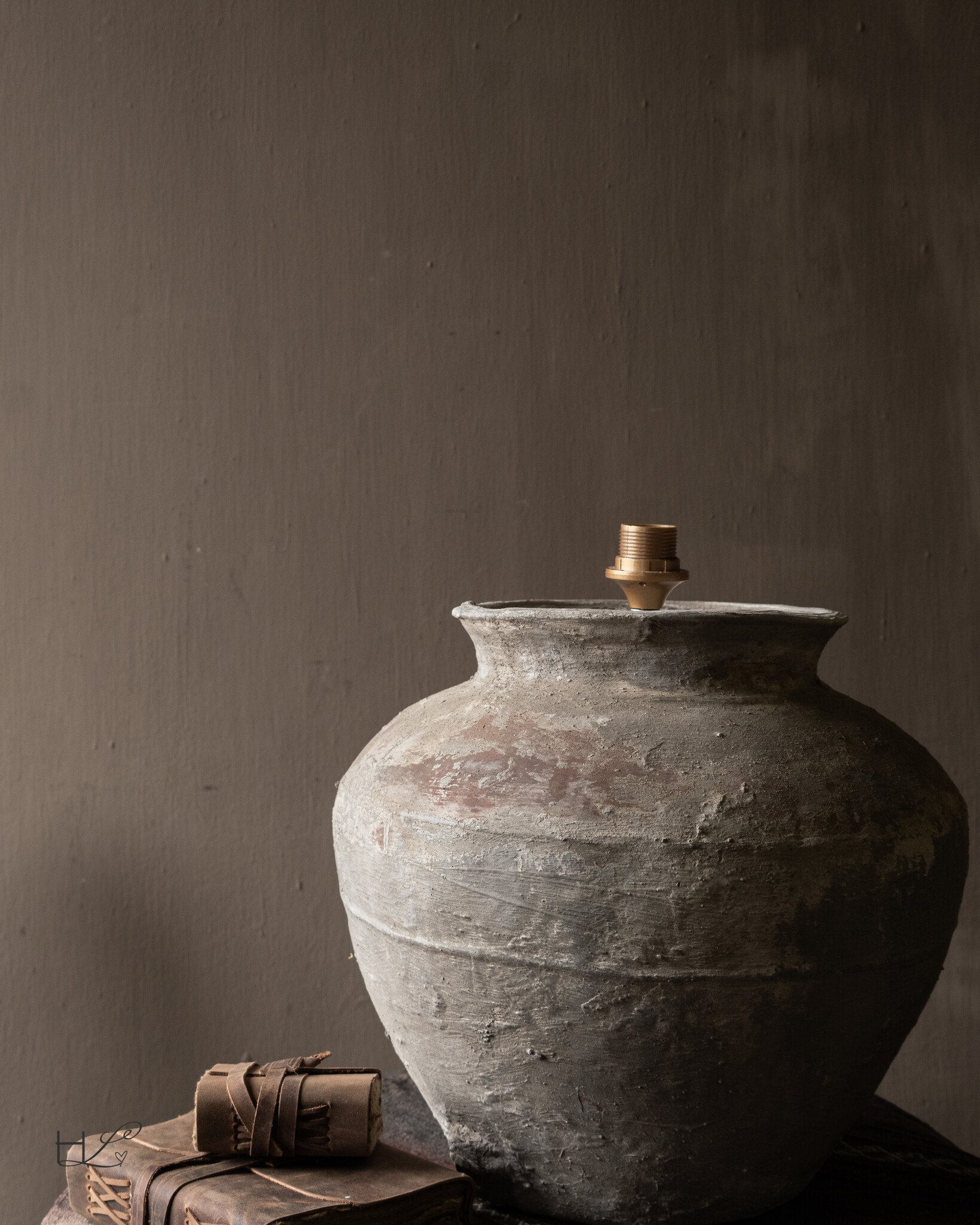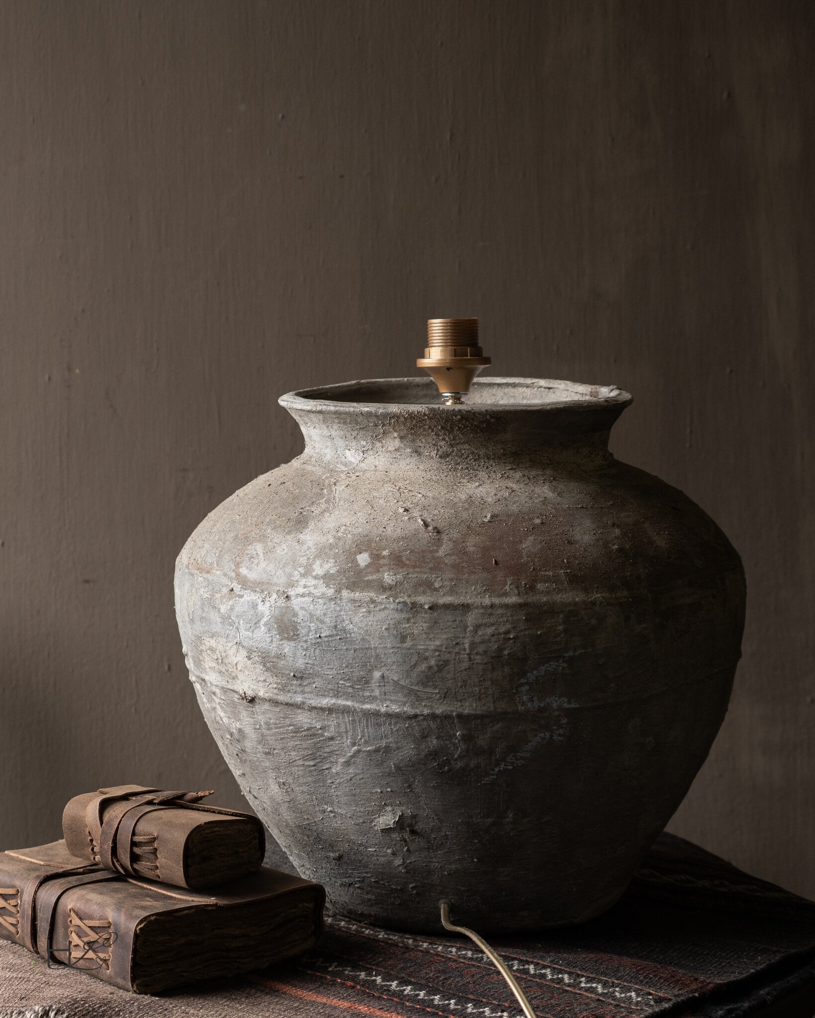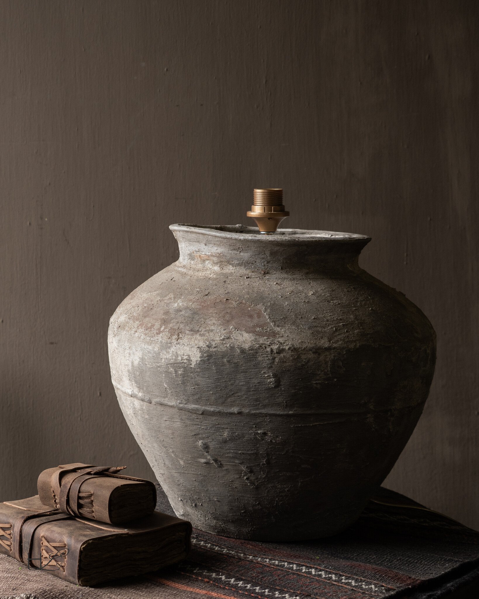 De oude pot is omgevormd tot een unieke lampvoet waarbij het authentieke karakter volledig behouden is gebleven. De organische vorm en de ruwe structuur van het aardewerk zorgen ervoor dat de lamp direct sfeer brengt in een ruimte.