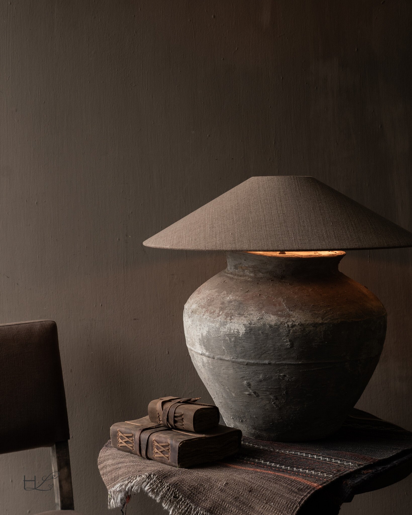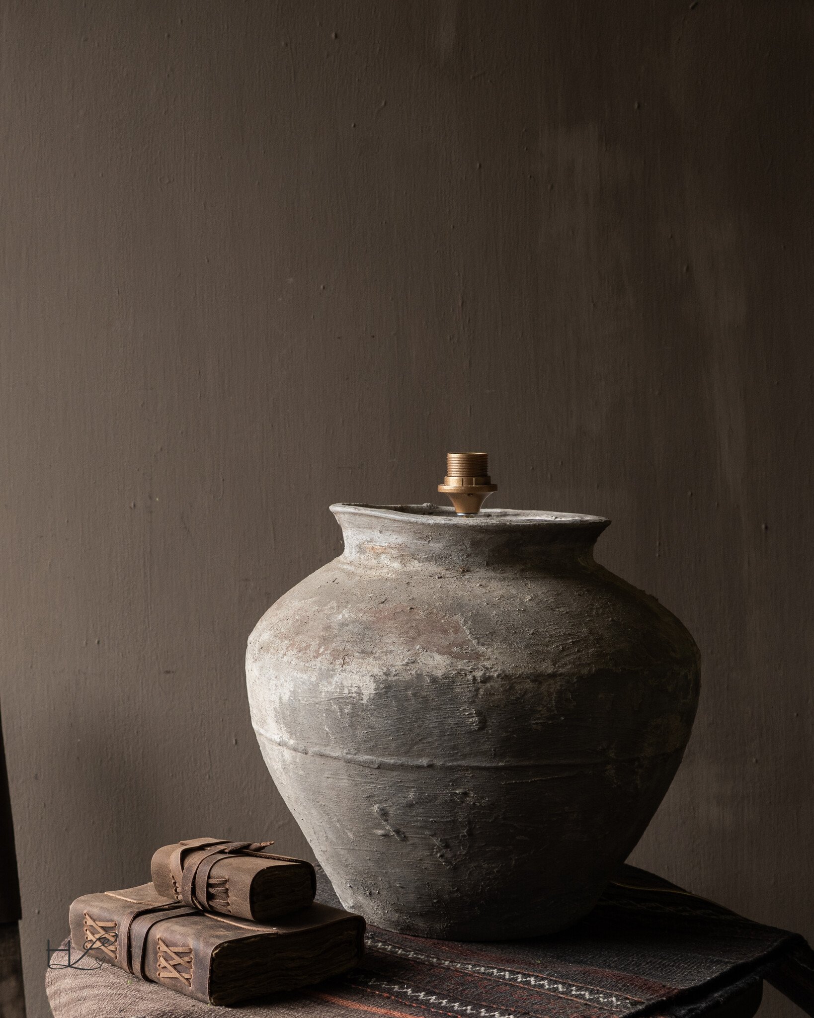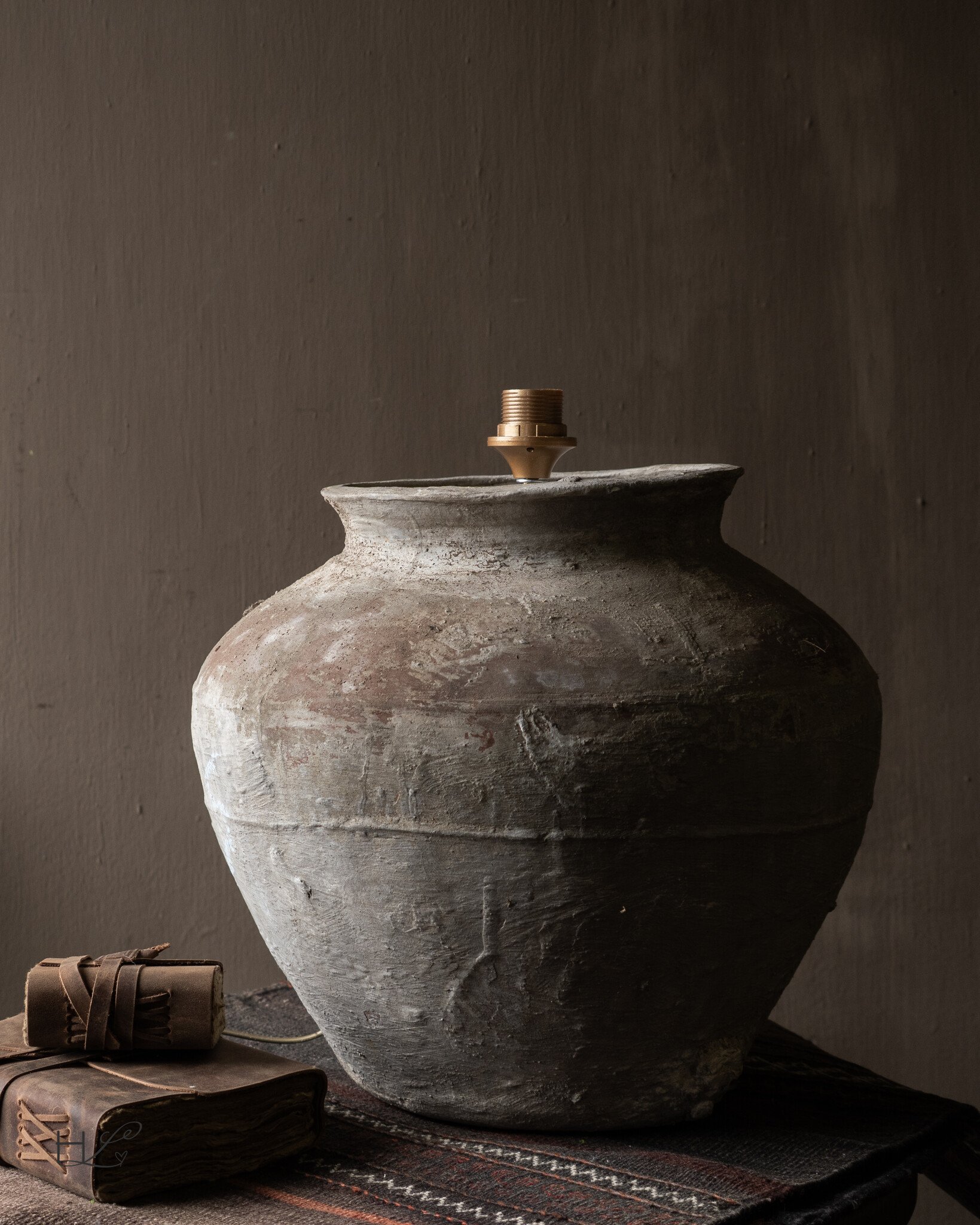 De oude pot is omgevormd tot een unieke lampvoet waarbij het authentieke karakter volledig behouden is gebleven. De organische vorm en de ruwe structuur van het aardewerk zorgen ervoor dat de lamp direct sfeer brengt in een ruimte.