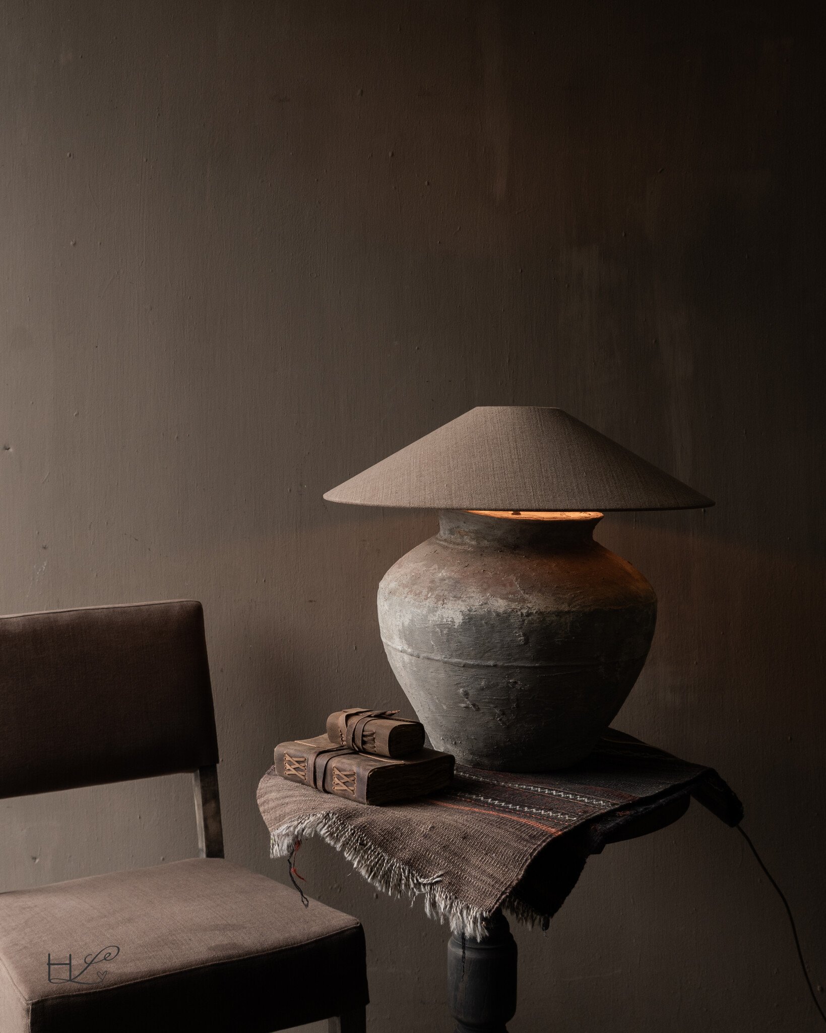 De natuurlijke kleurtinten, subtiele sporen van gebruik en de robuuste vorm geven deze lamp een krachtige en warme uitstraling. Hierdoor past dit object perfect in een stoer, sober of wabi-sabi interieur.