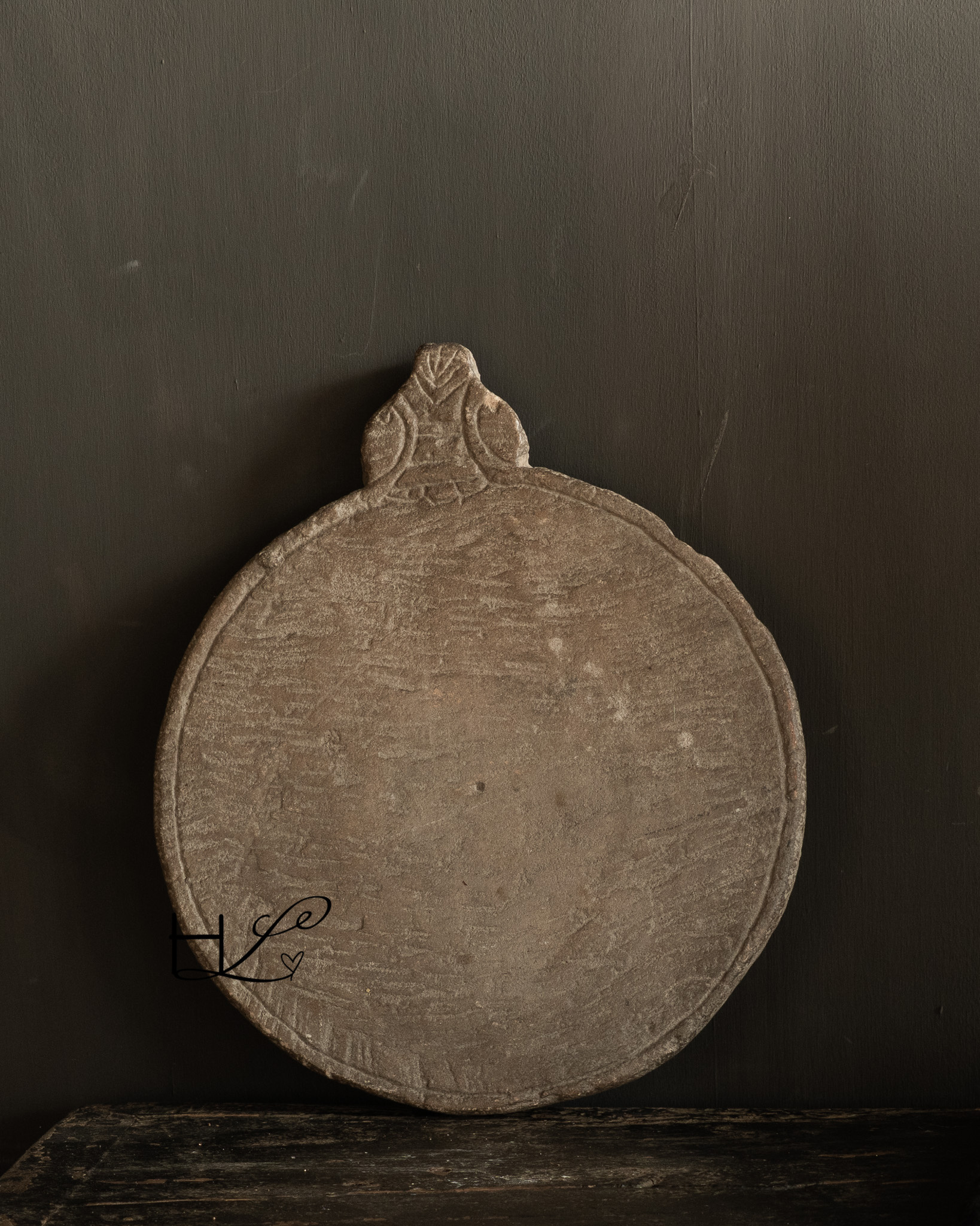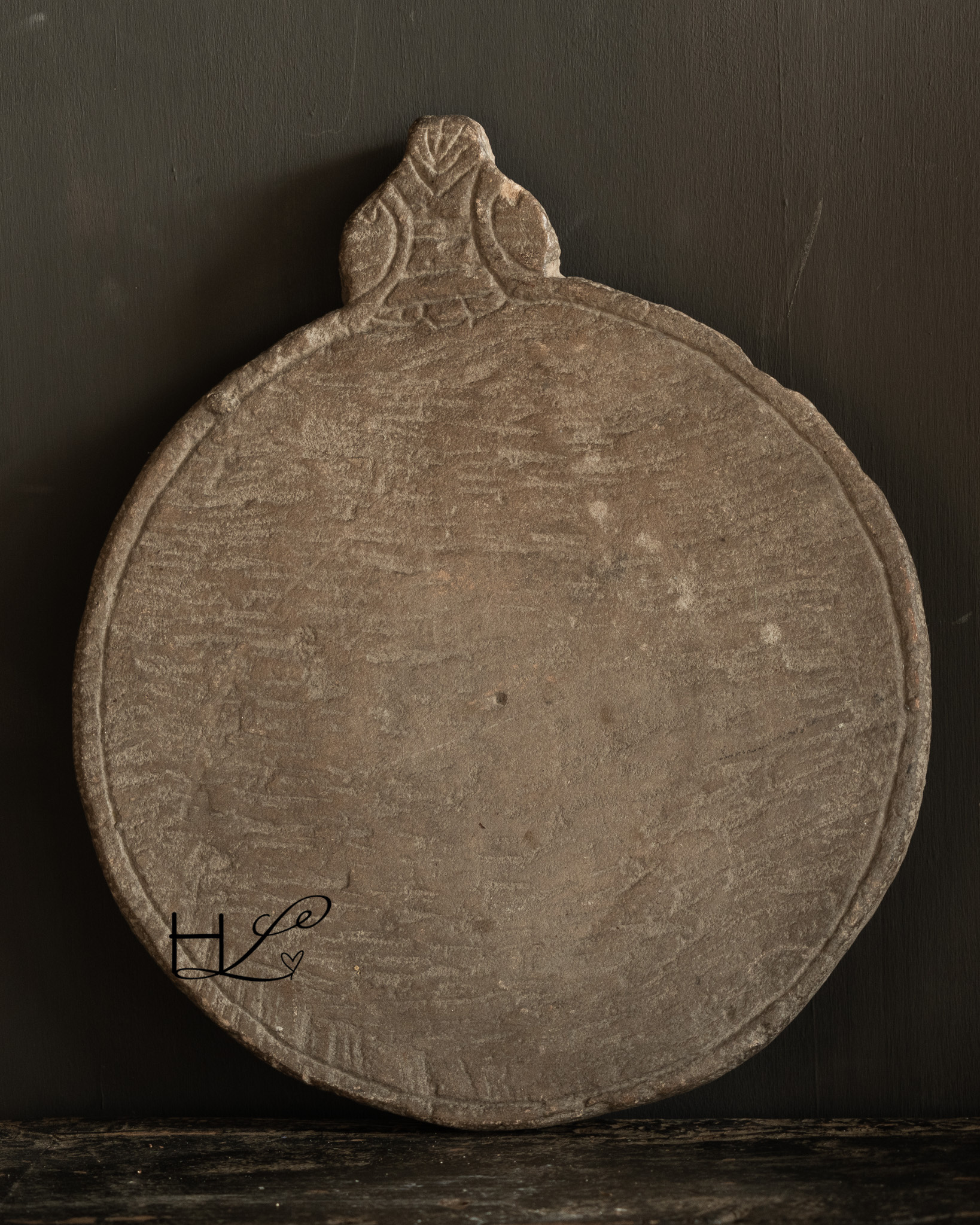Dit unieke natuurstenen chapati bord, ook wel roti bord genoemd, is een bijzonder authentiek object uit India. Oorspronkelijk werd dit zware stenen bord gebruikt in de keuken om deeg uit te rollen voor chapati of roti – traditionele platte broden.