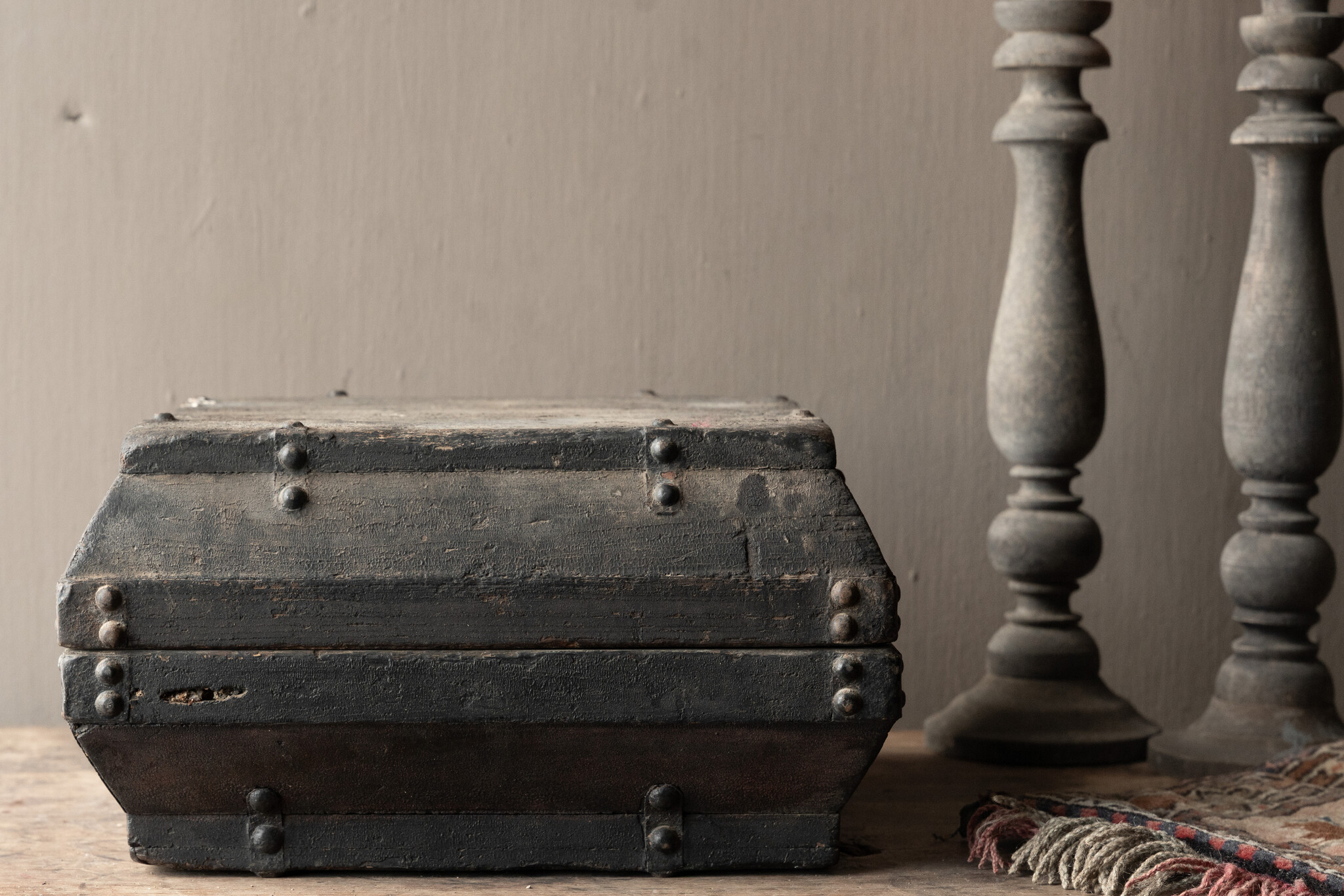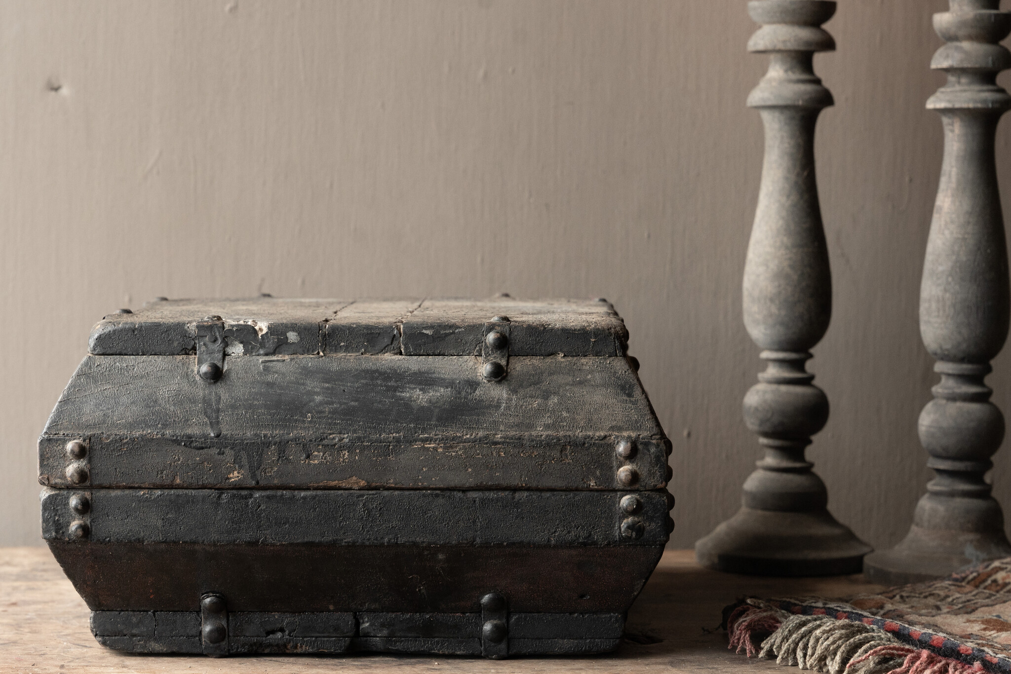 De kist heeft de kenmerkende brede vorm met licht afgeschuinde zijkanten en is rijk afgewerkt met originele, handgesmede metalen nagels en beslag. De zwarte, verweerde patina geeft hem precies die stoere, sobere uitstraling die perfect past binnen een landelijke of wabi-sabi inrichting.