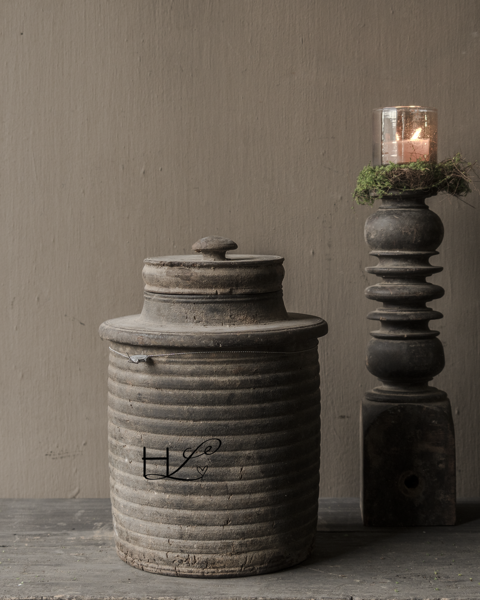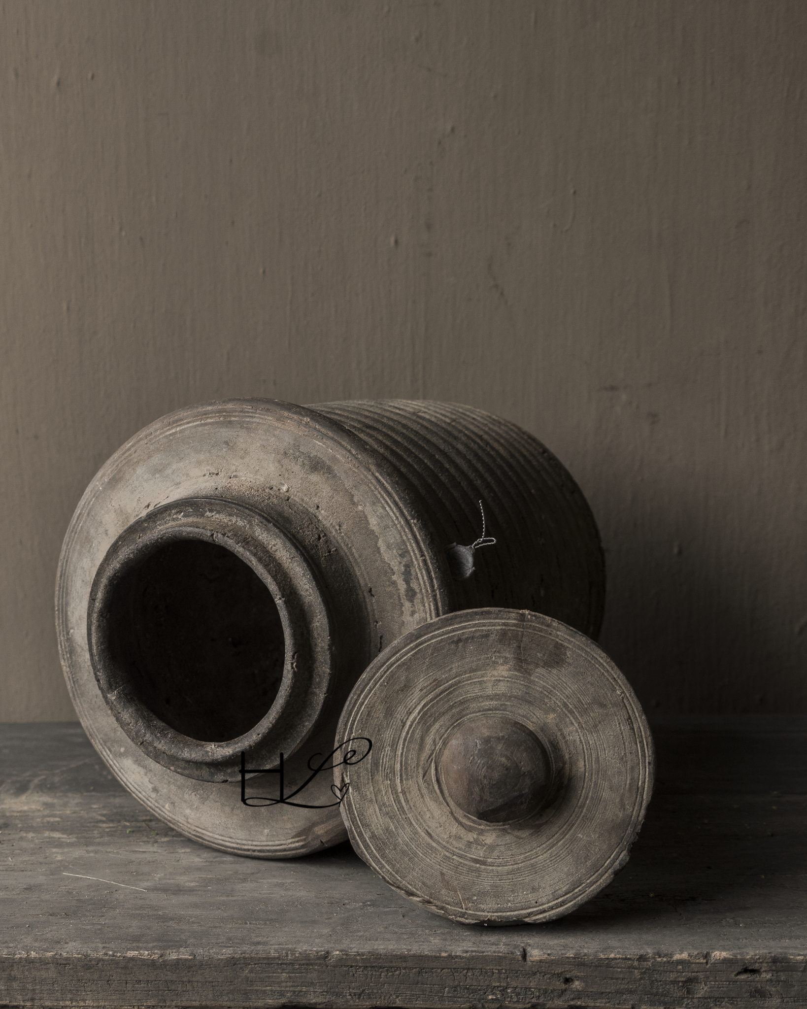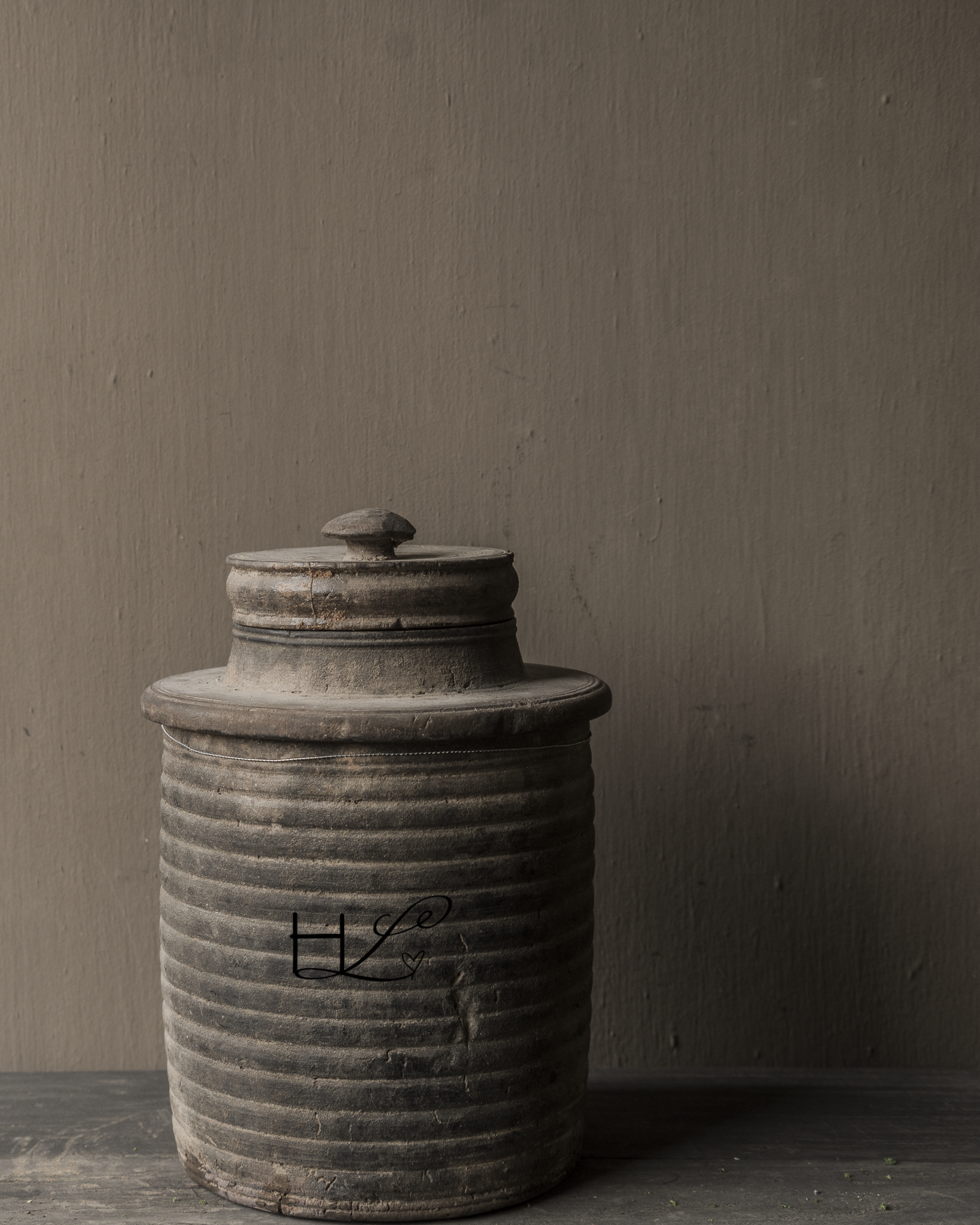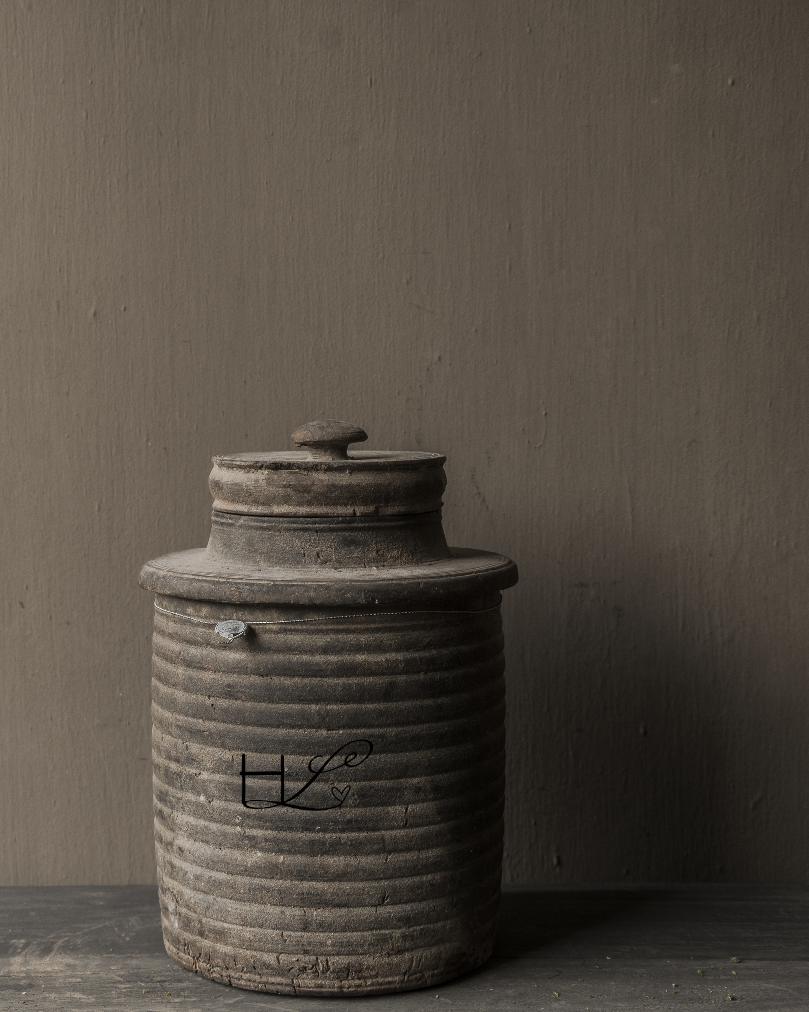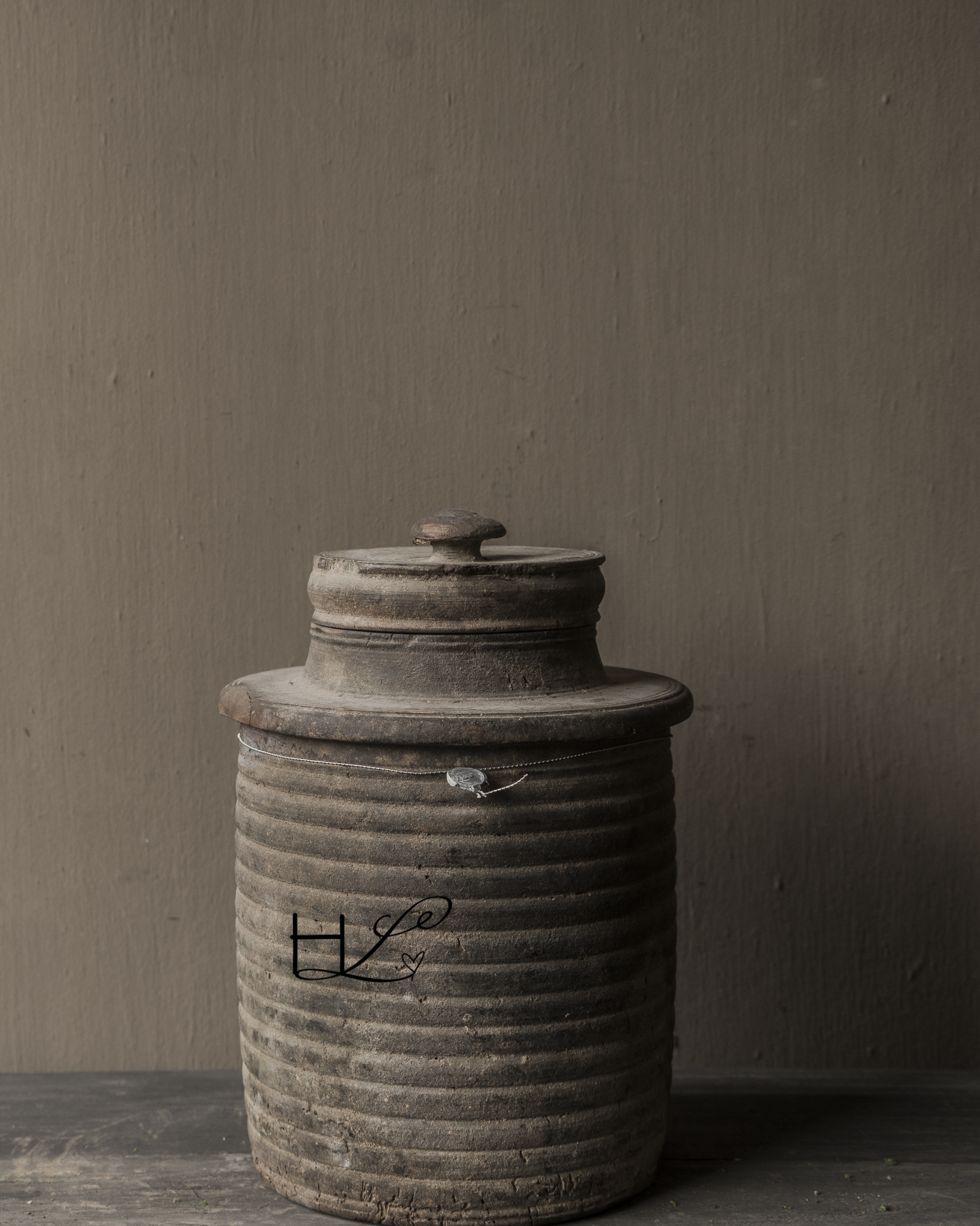 De ribbelstructuur rondom geeft de kruik een stoer en ambachtelijk karakter. De bijpassende deksel maakt het geheel compleet en benadrukt het oorspronkelijke gebruik. Elk detail – van de verkleuringen tot de kleine barstjes – vertelt iets van zijn verleden.