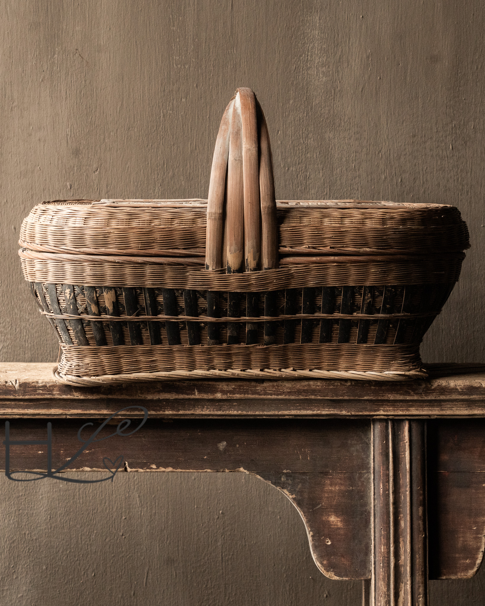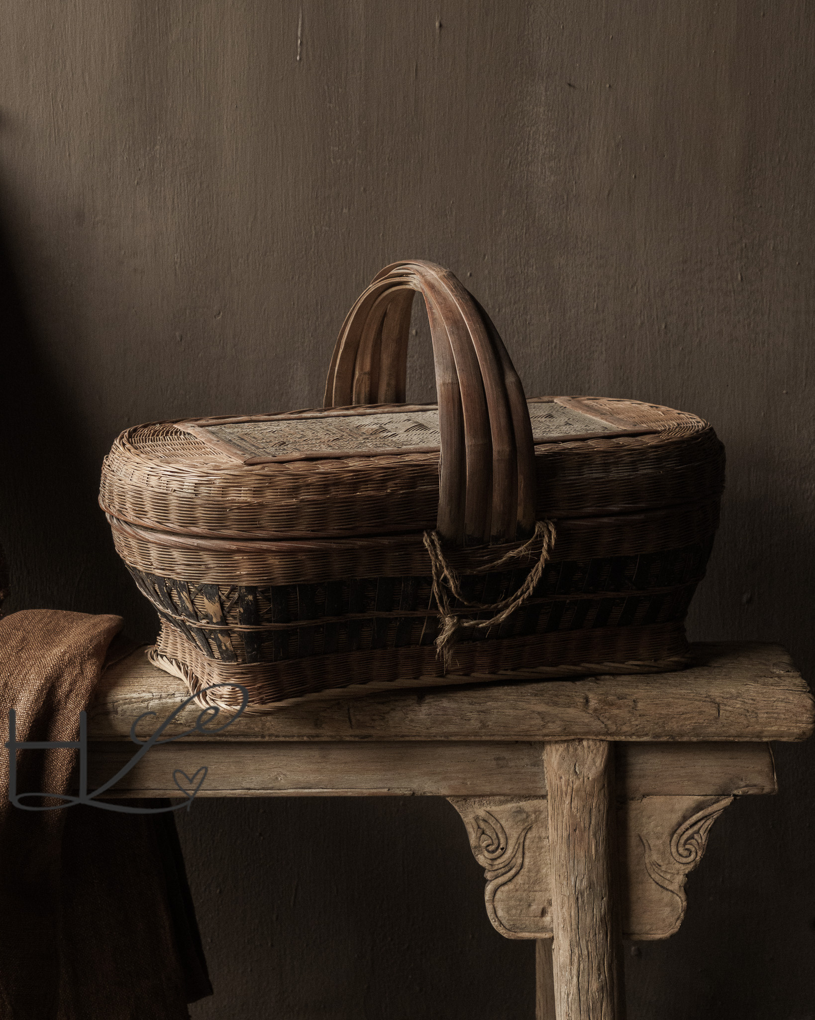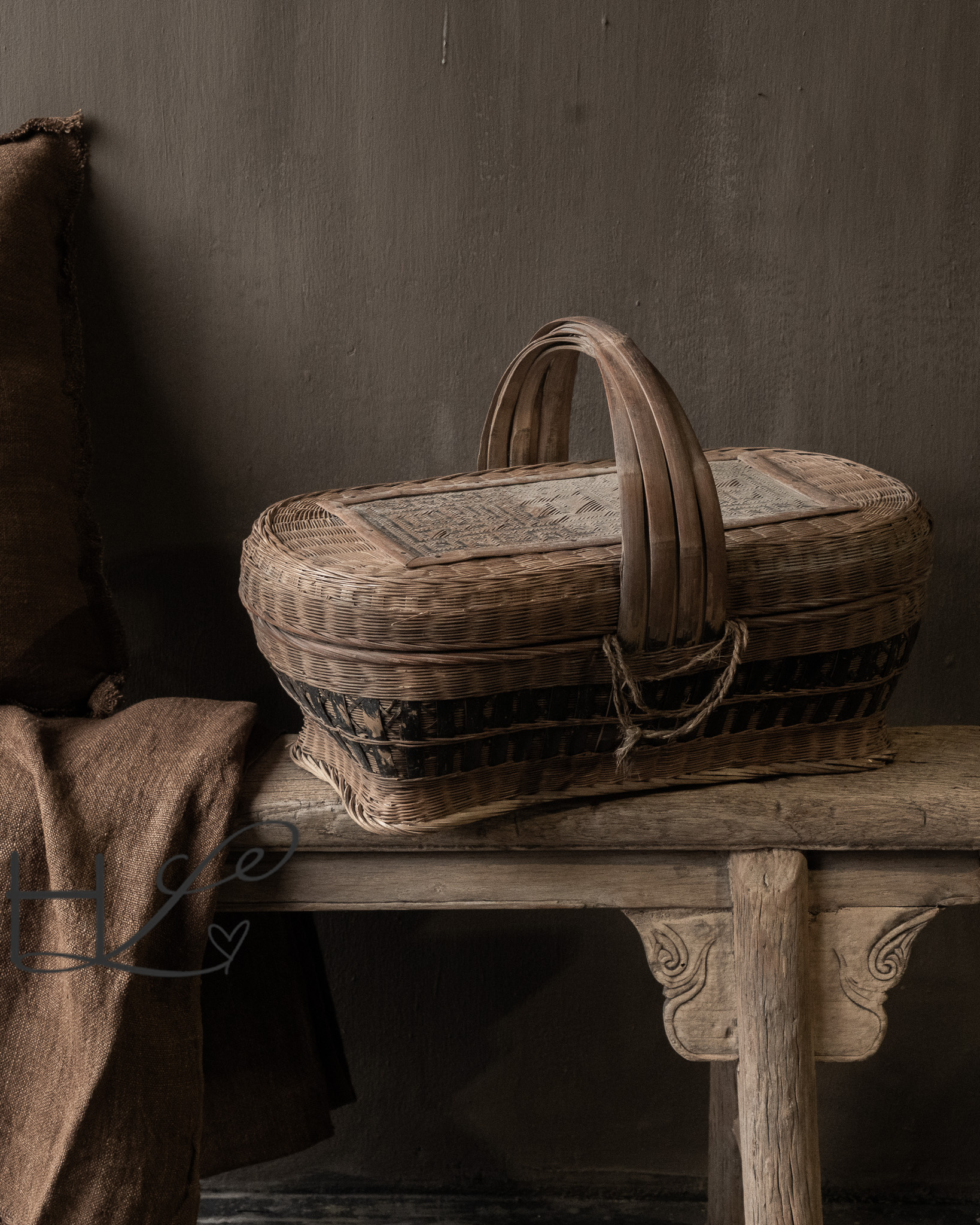 Deze authentieke rieten mand is met de hand gevlochten en draagt de sporen van tijd en gebruik, wat hem zijn prachtige, doorleefde uitstraling geeft. De dubbele houten handgrepen en het fijn gevlochten patroon op het deksel maken elk exemplaar bijzonder.