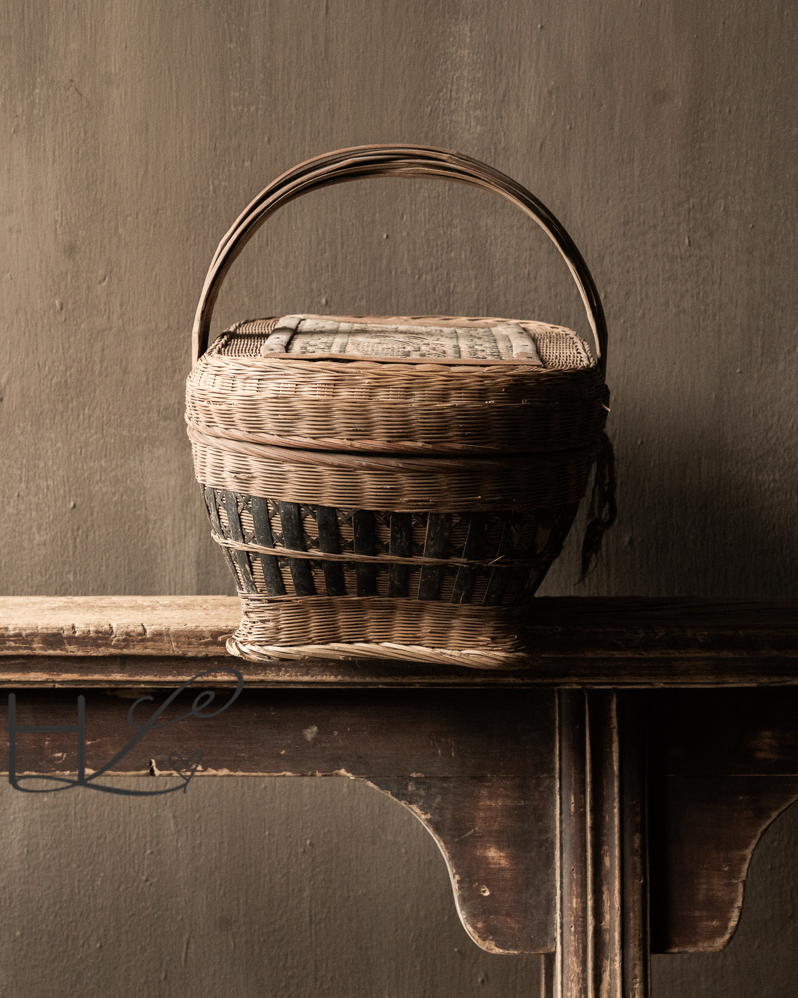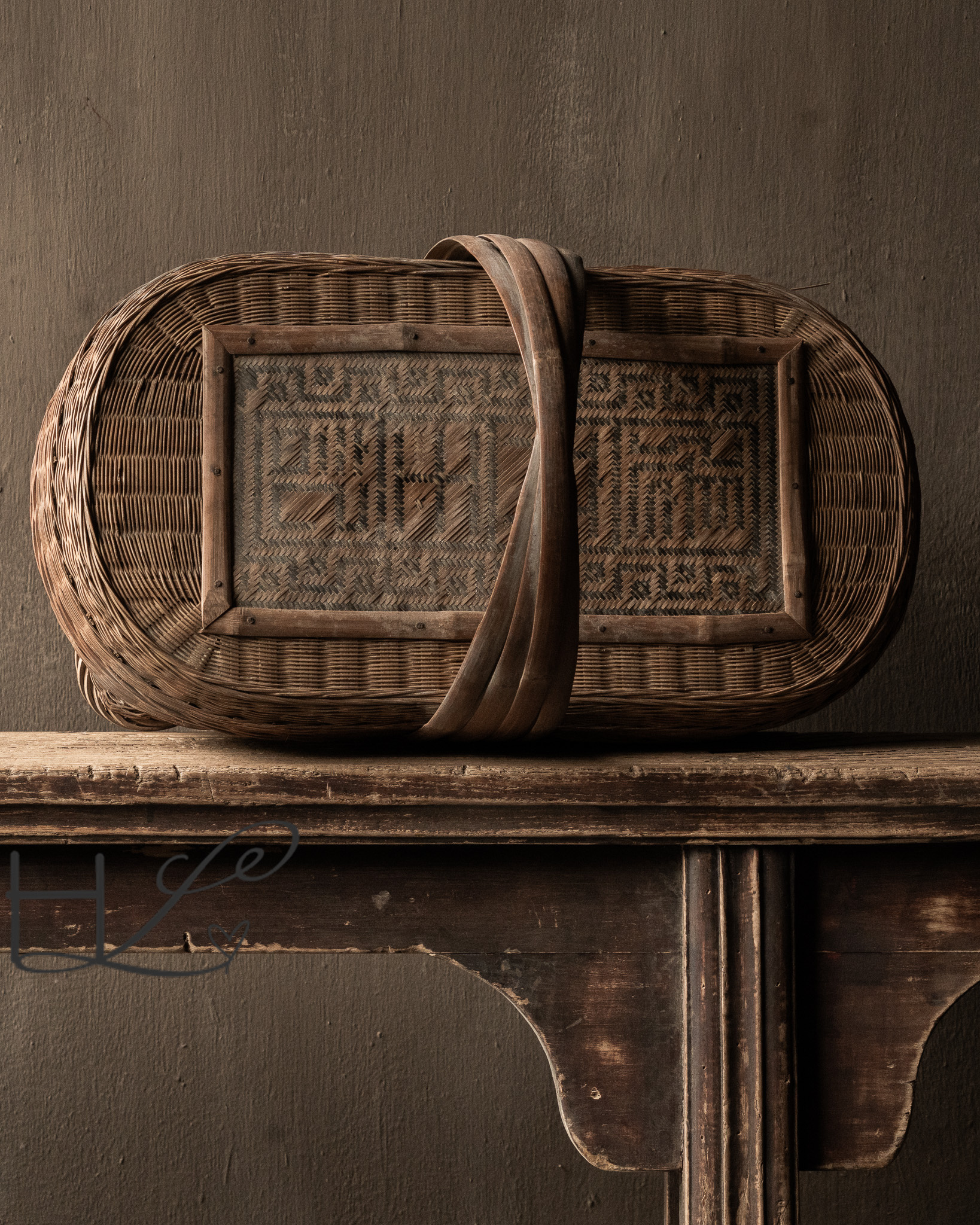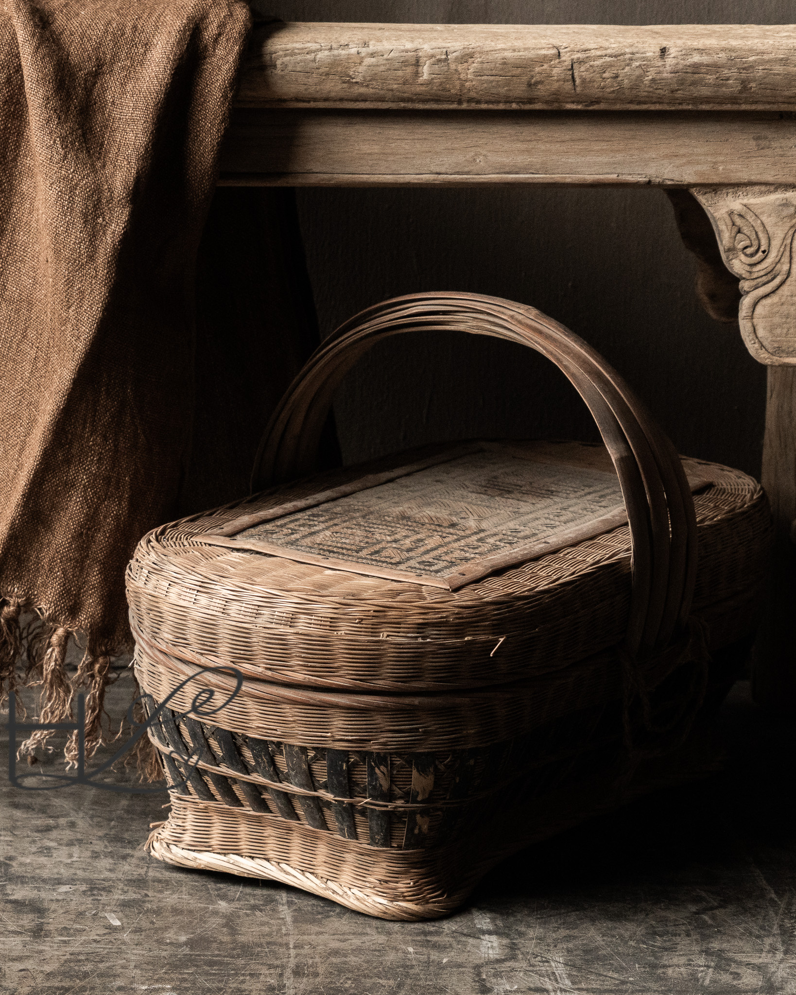 Deze authentieke rieten mand is met de hand gevlochten en draagt de sporen van tijd en gebruik, wat hem zijn prachtige, doorleefde uitstraling geeft. De dubbele houten handgrepen en het fijn gevlochten patroon op het deksel maken elk exemplaar bijzonder.