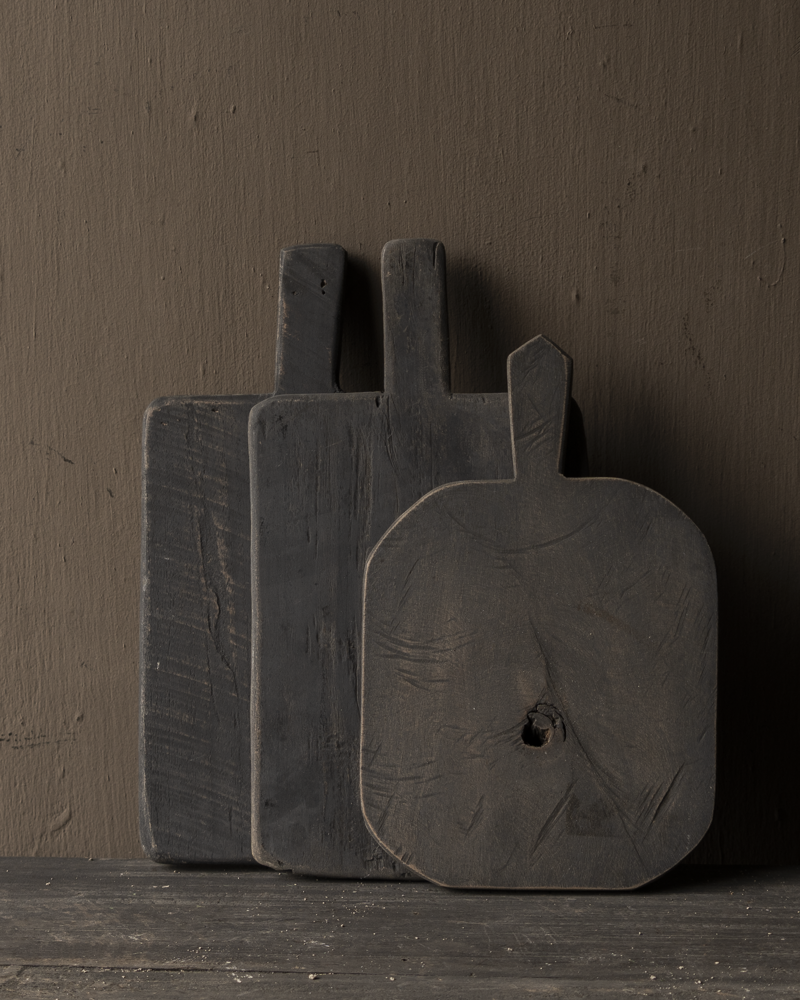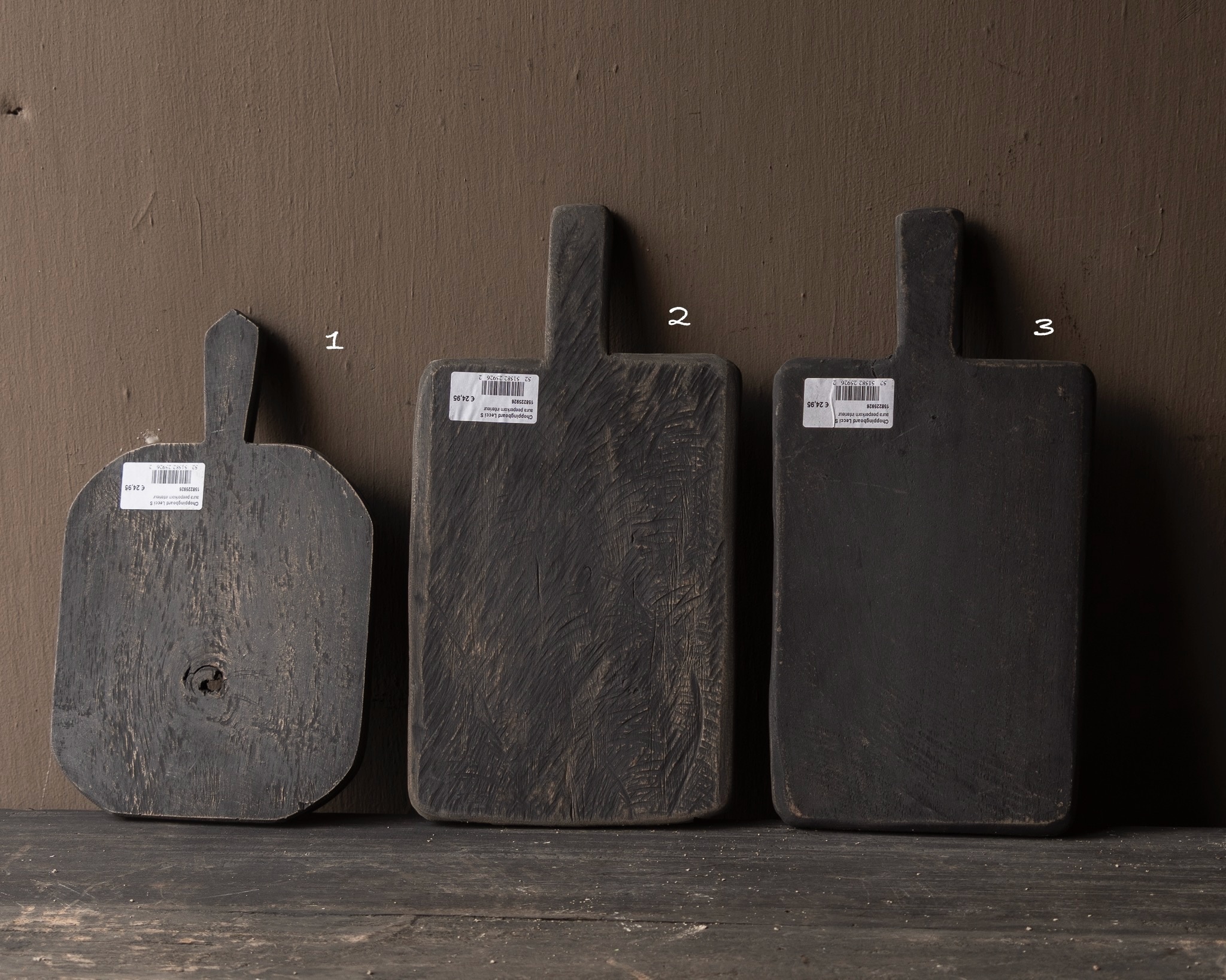 Gebruik de planken om brood of hapjes op te serveren, of zet ze decoratief tegen de keukenwand voor een stoere, landelijke look. Het donkere hout, de natuurlijke nerven en de unieke afwerking maken elke plank een bijzonder item met karakter.