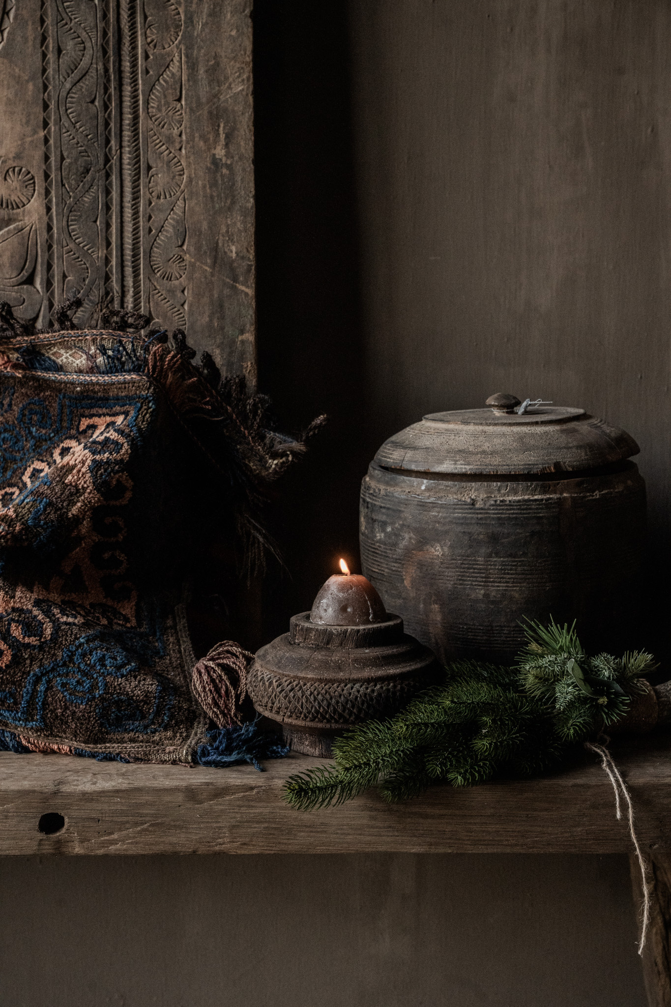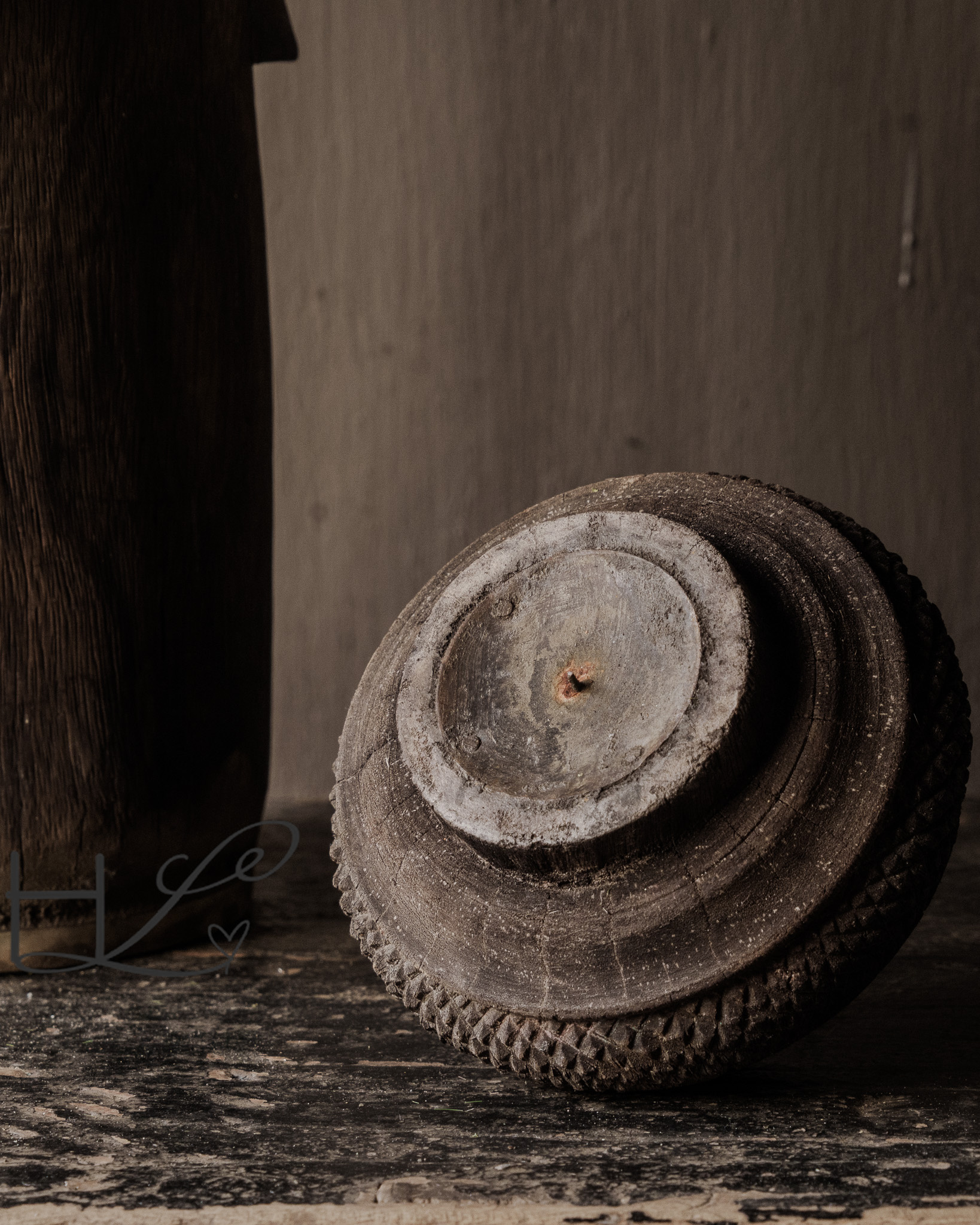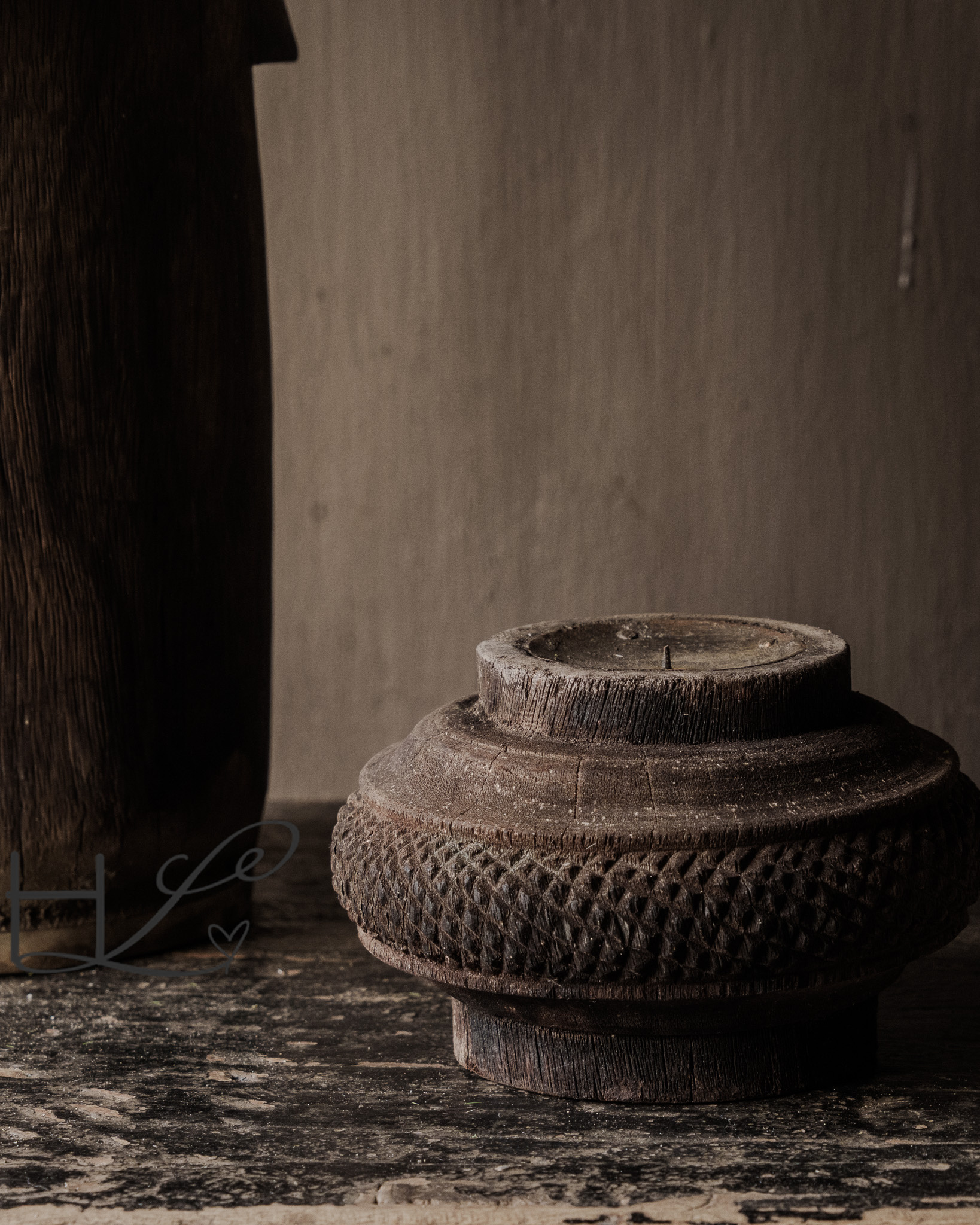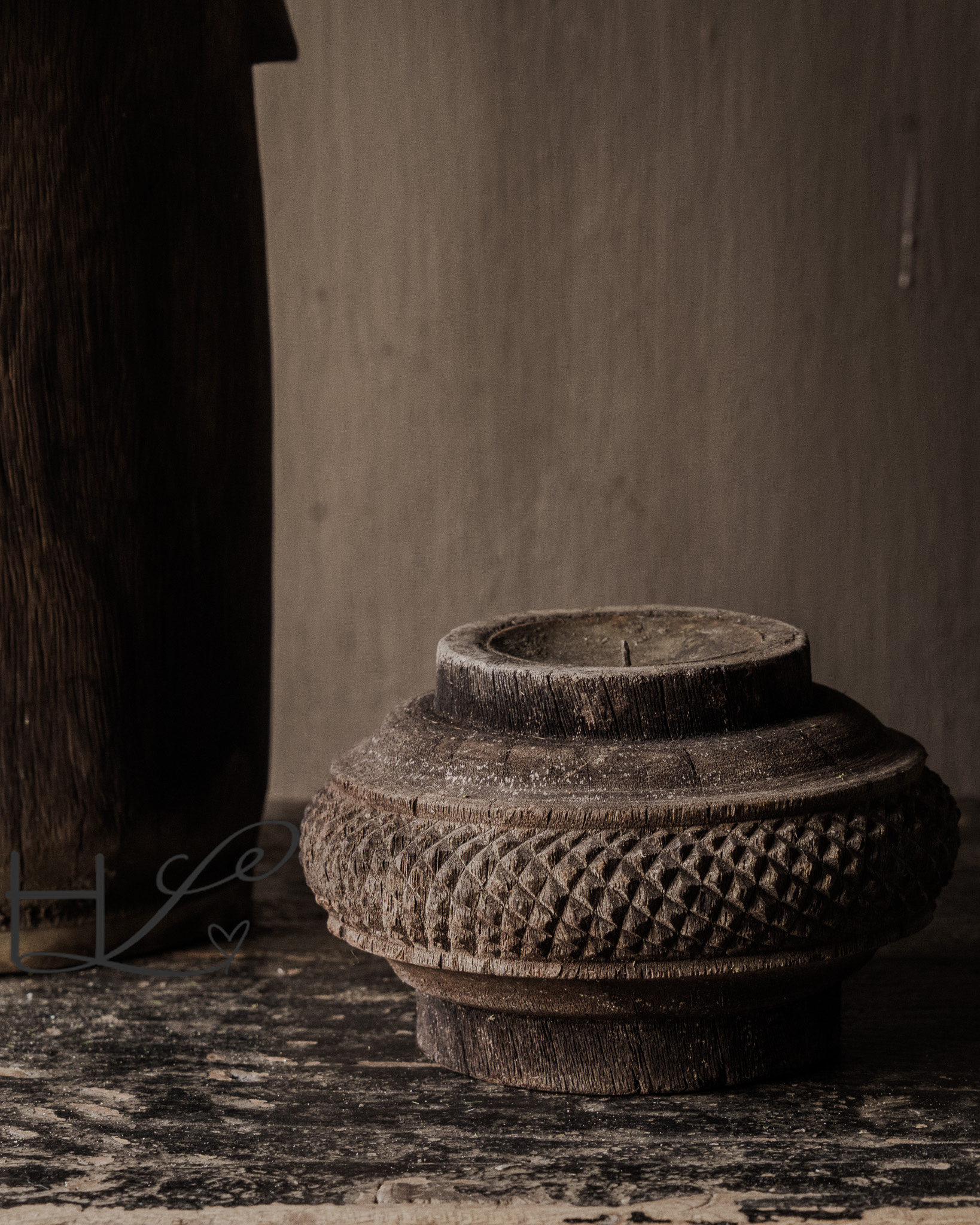 Met zijn ronde vormen en doorleefde houtstructuur vertelt deze authentieke houten sokkel een verhaal van vroeger. Het stuk vindt zijn oorsprong in India, waar het ooit werd gebruikt als bouwfragment in een traditioneel huis of tempel. De sporen van tijd en gebruik geven het hout een warme, karaktervolle uitstraling die perfect past bij een sober en stoer interieur.