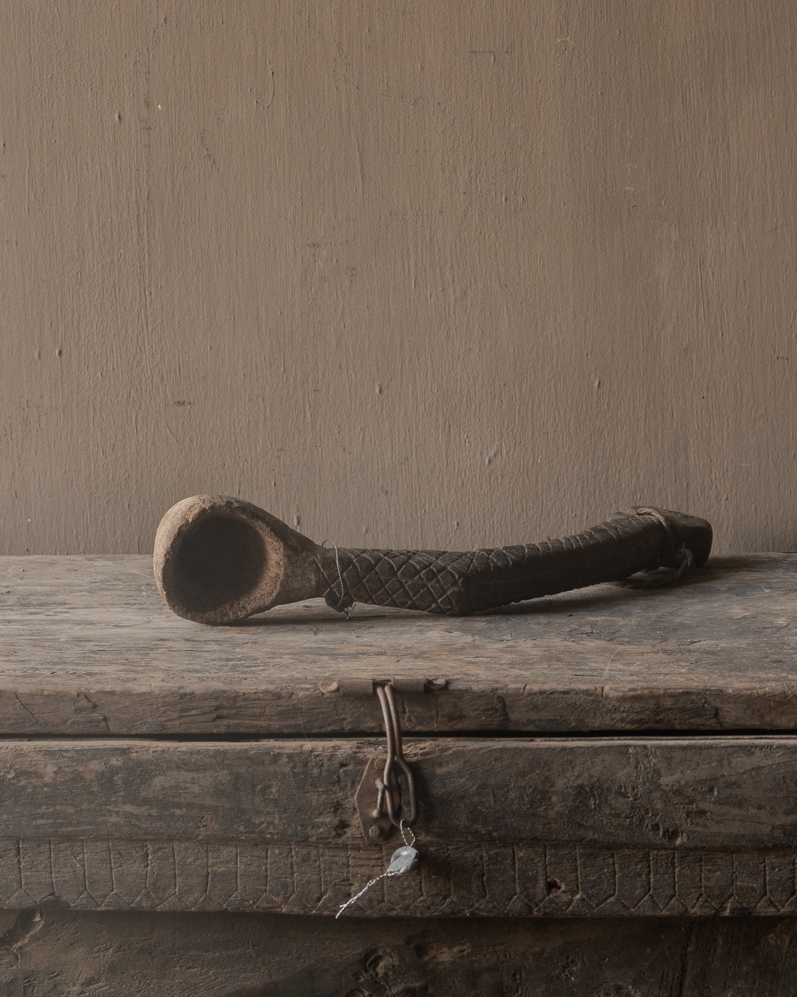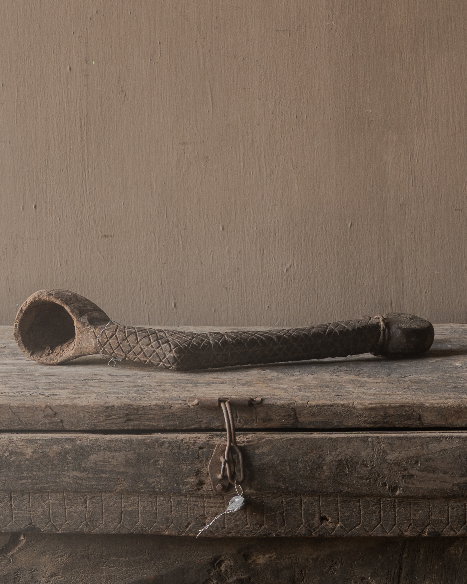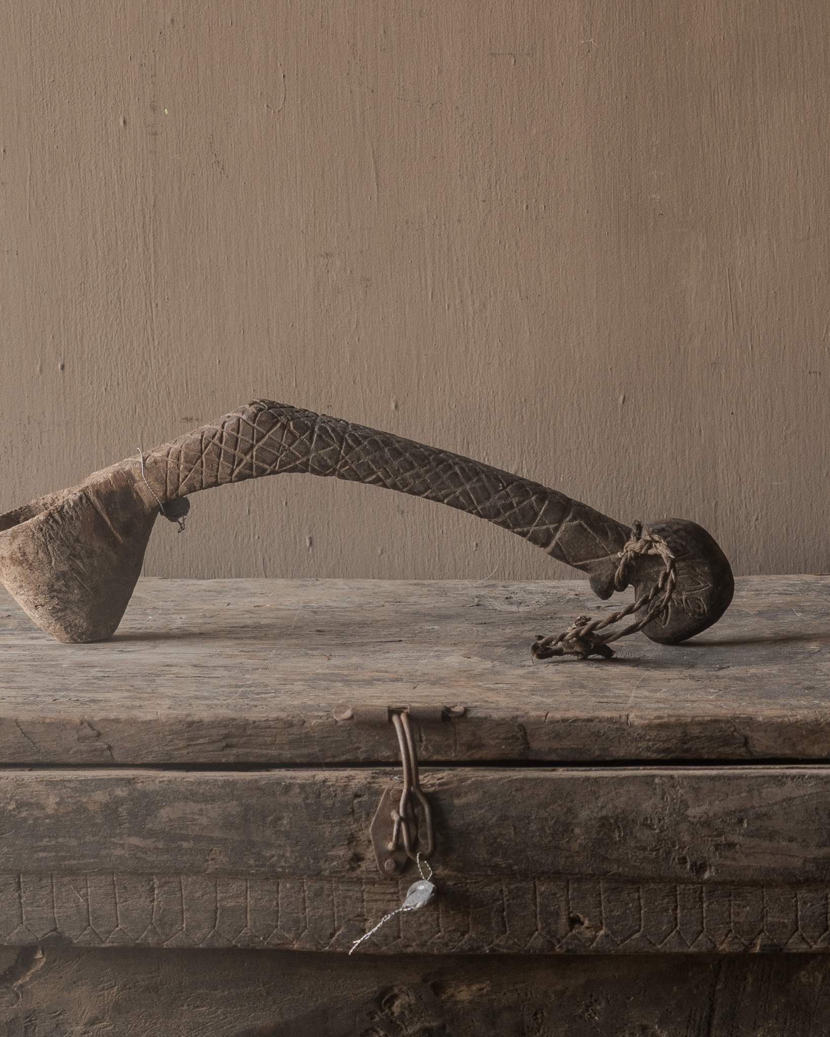 Deze bijzondere oude houten lepel is een puur stukje vakmanschap uit Nepal. Doorleefd, robuust en vol karakter. Geen perfecte lijnen, maar juist de schoonheid van het onvolmaakte – precies wat dit object zo uniek maakt.