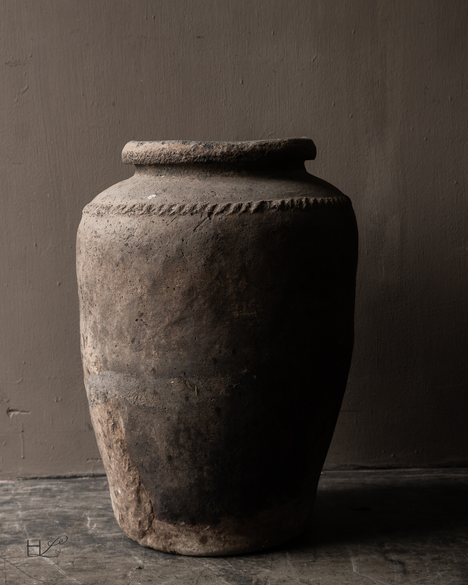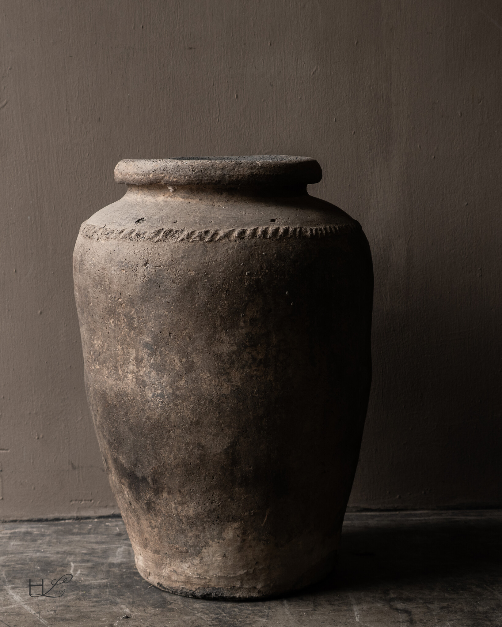 Deze oude aardewerken kruik uit India is een prachtig decoratief object met een door de tijd gevormde uitstraling. De kruik heeft een robuuste, verweerde structuur en een warme aardse kleur die perfect past binnen een landelijk, sober en wabi-sabi interieur.