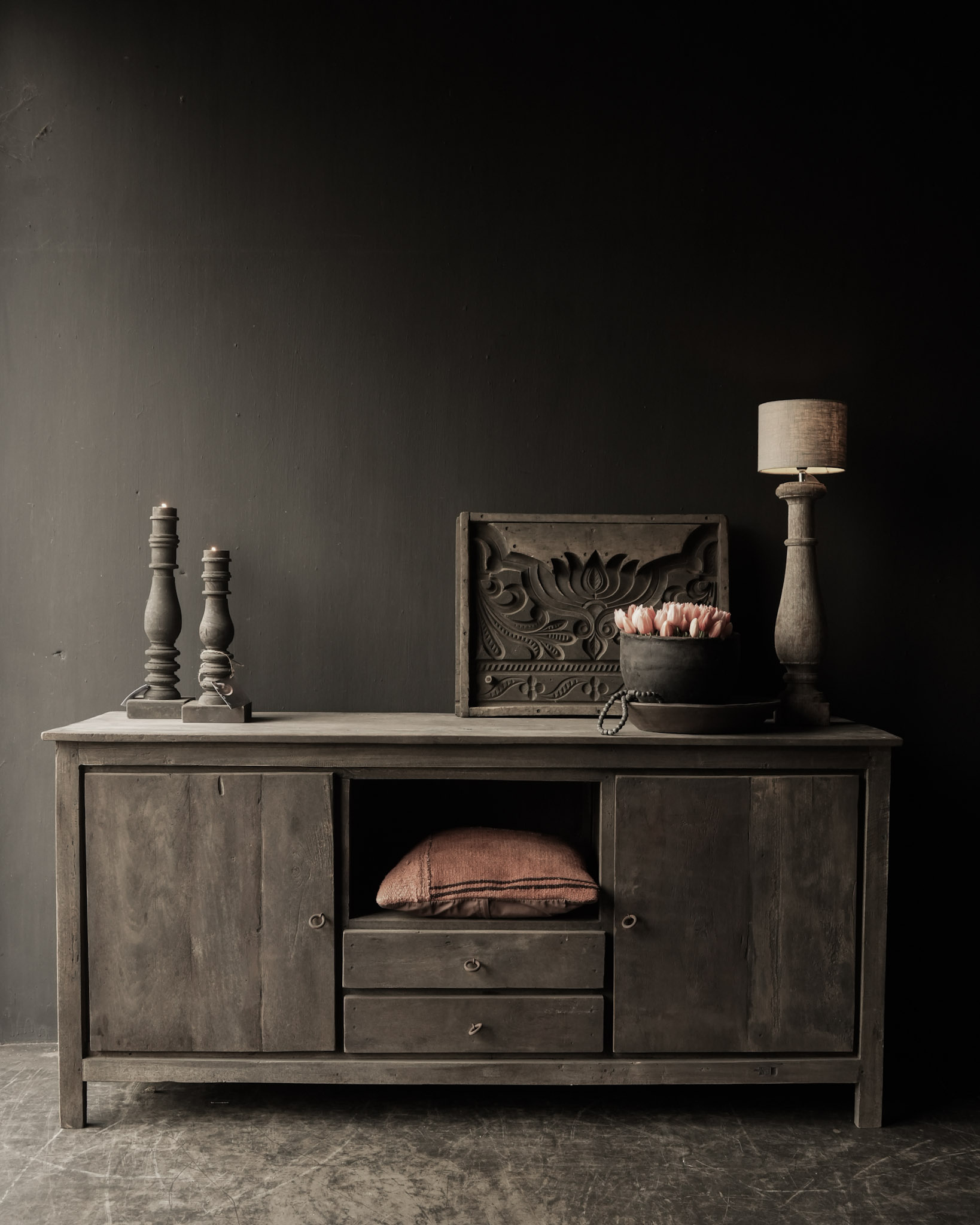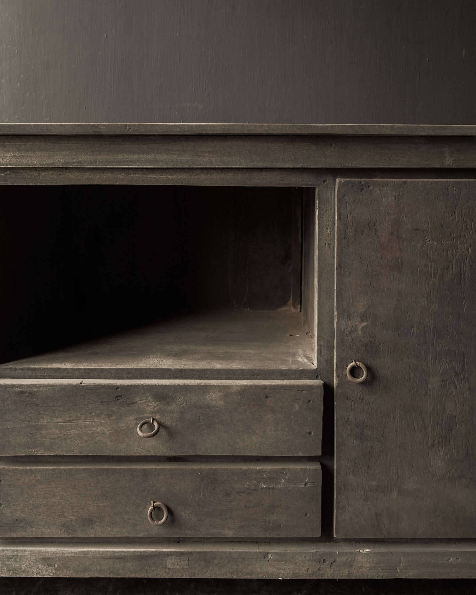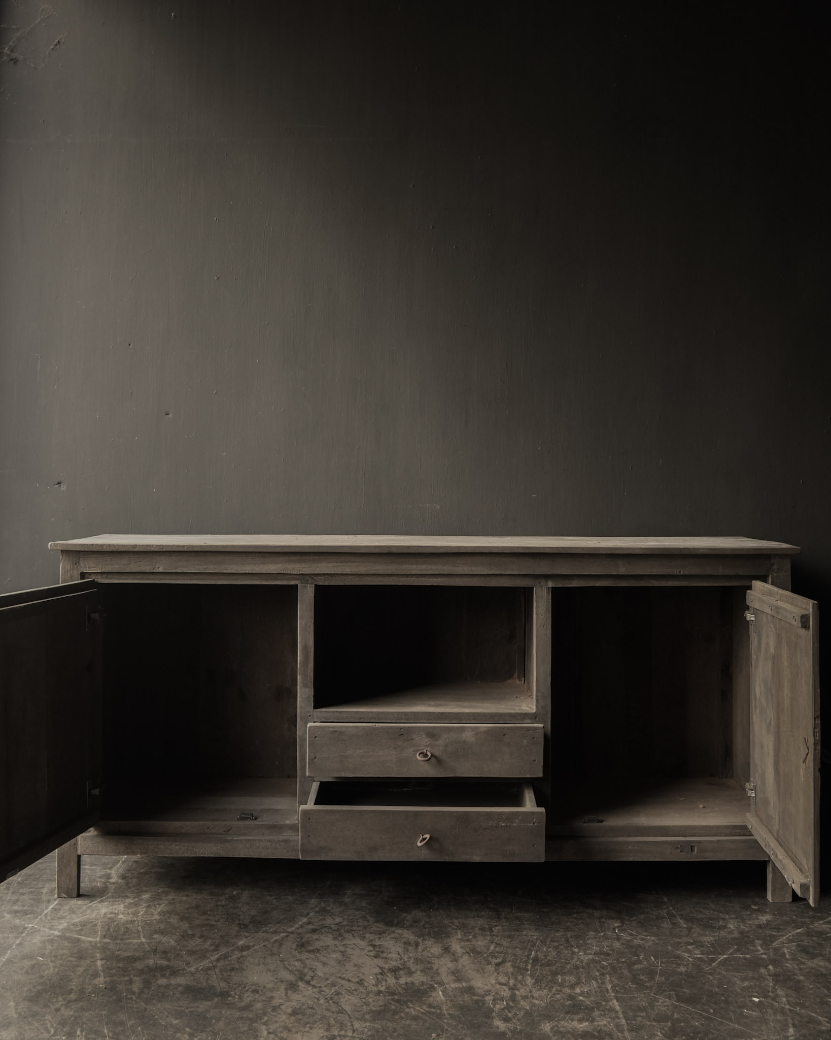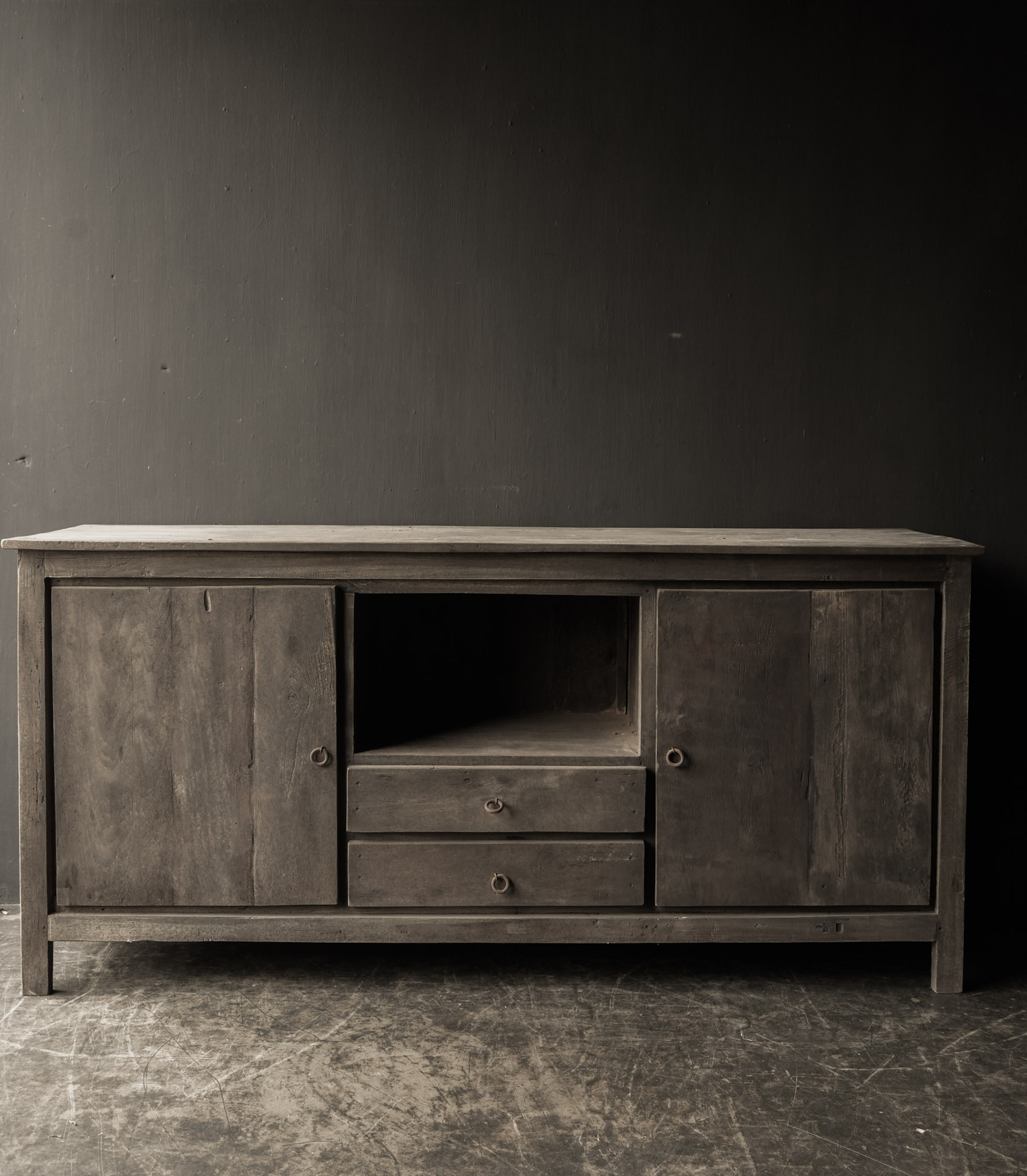 Een prachtig stoer dressoir, vervaardigd uit oud, doorleefd hout met een natuurlijke matte afwerking. De kast heeft twee deuren, twee ruime lades en een open vak in het midden — ideaal voor het opbergen van servies, linnengoed of stijlvolle accessoires.