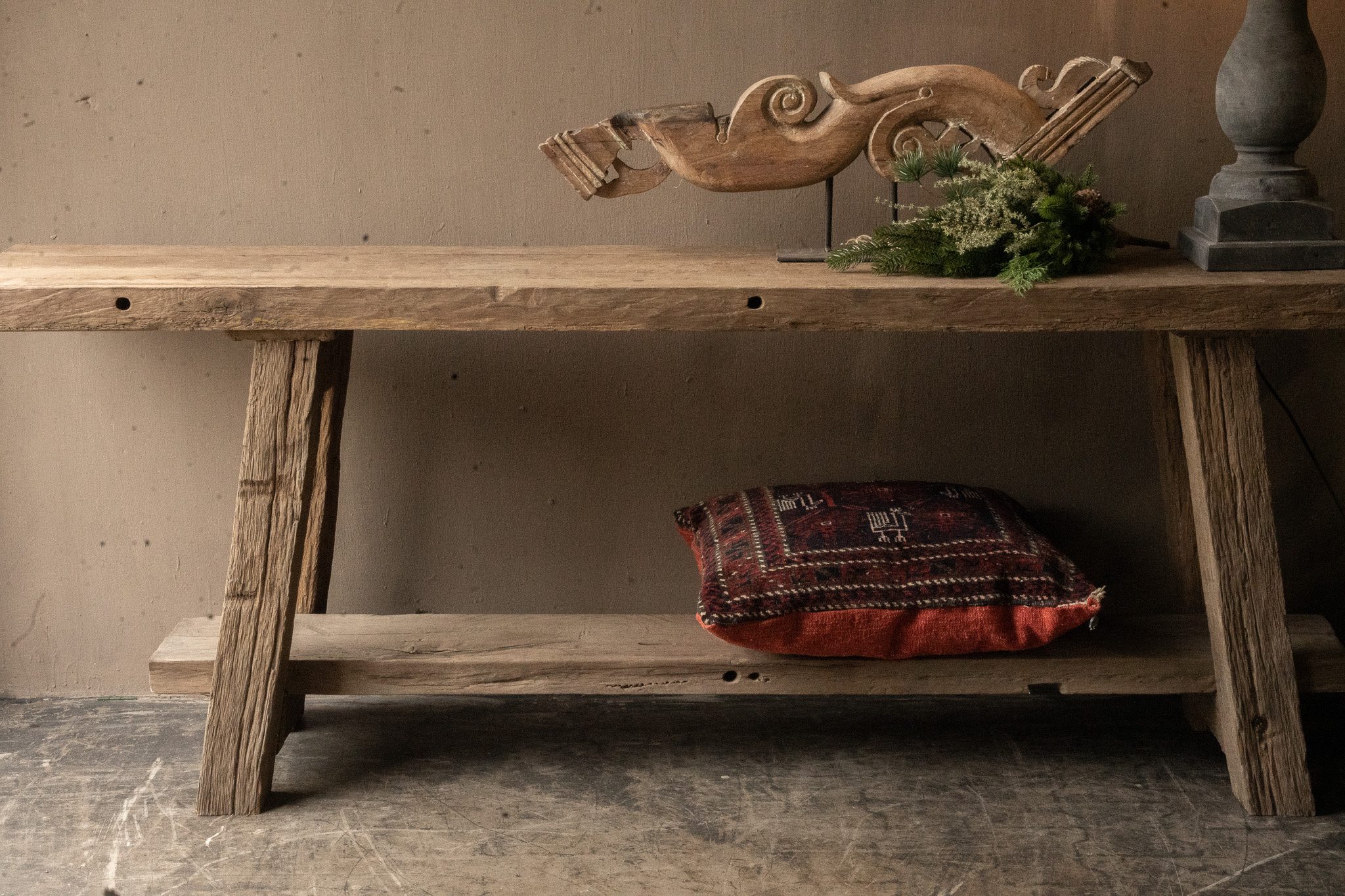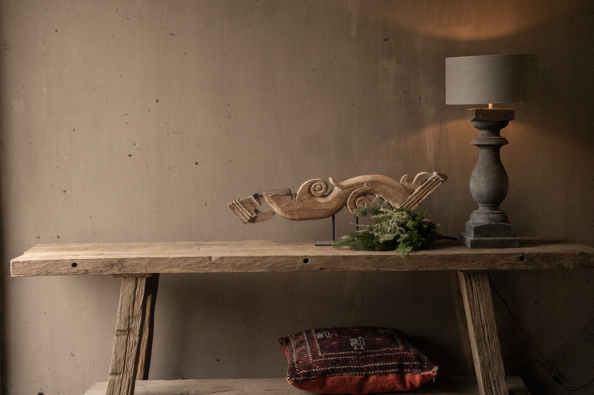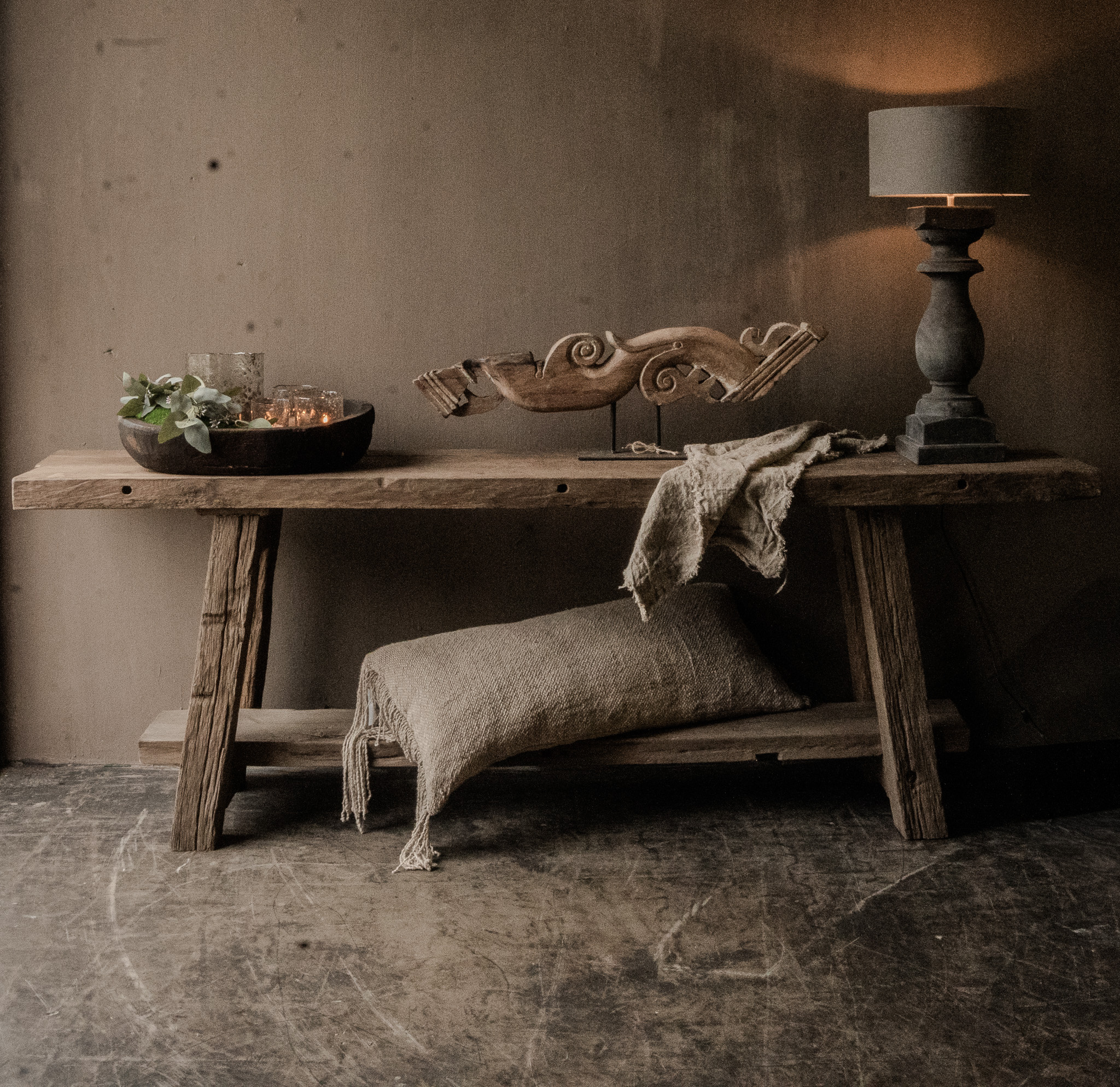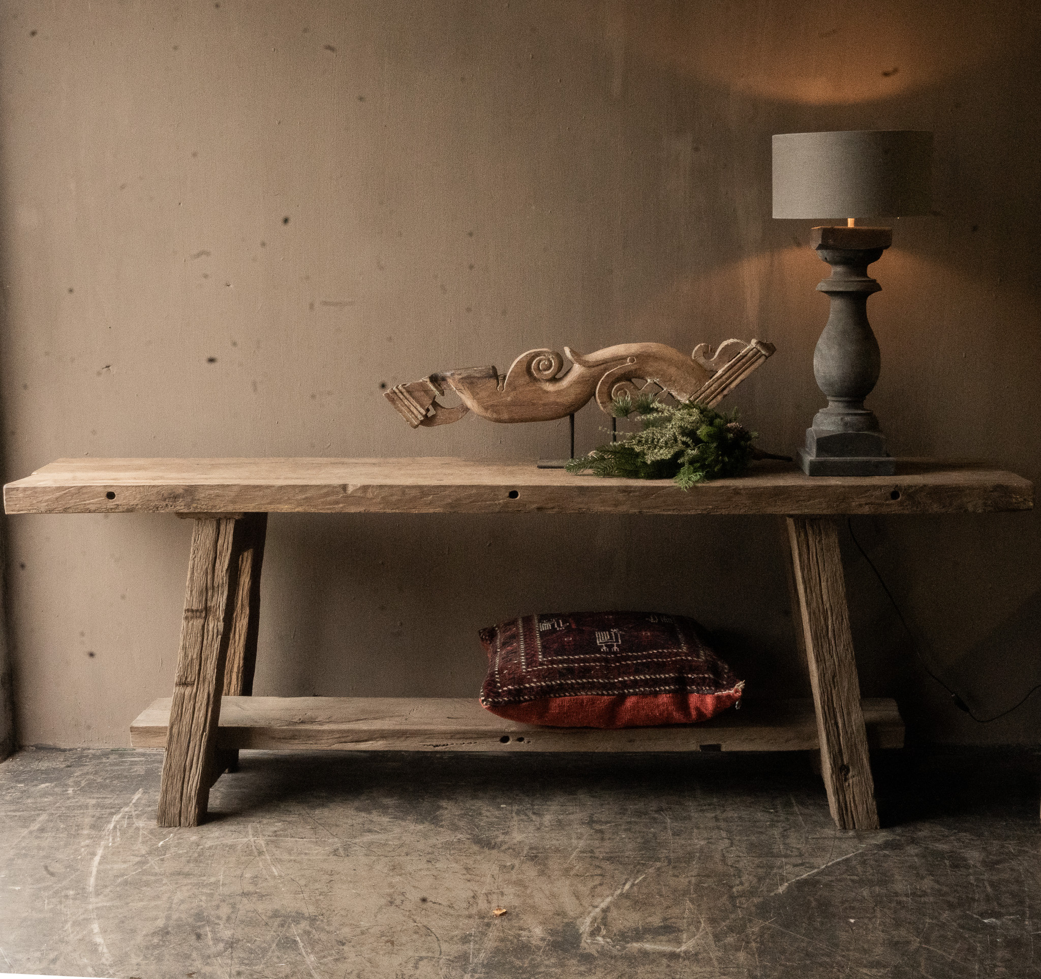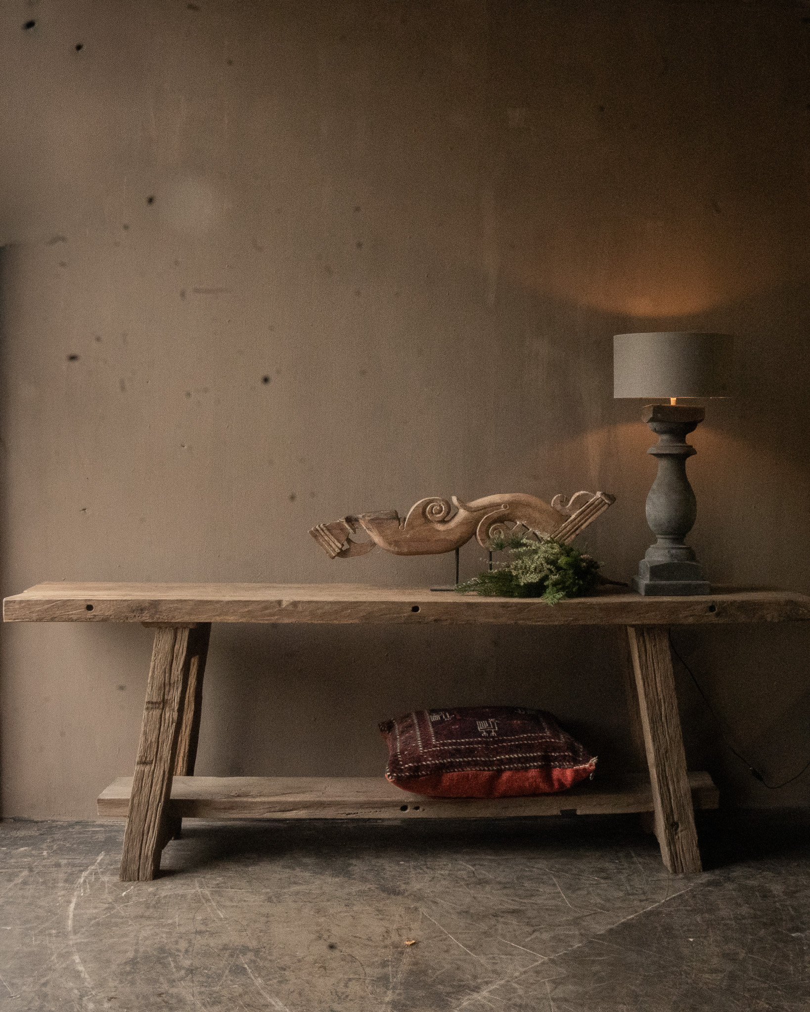 De stevige, eenvoudige constructie met schuin geplaatste poten en royale legplank ademt ambacht en rust. Een tijdloos ontwerp dat moeiteloos past binnen een sober, landelijk of wabi-sabi interieur.
