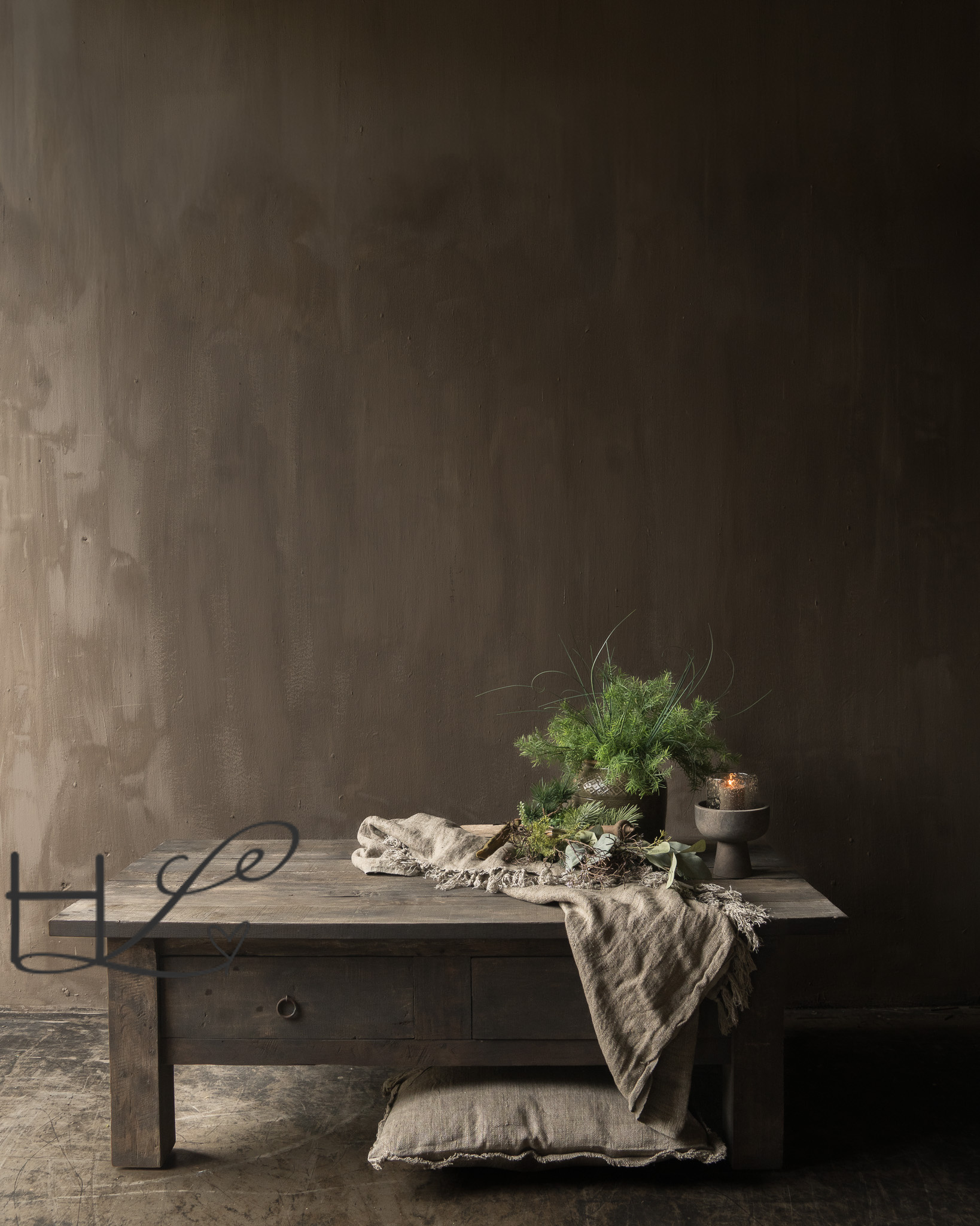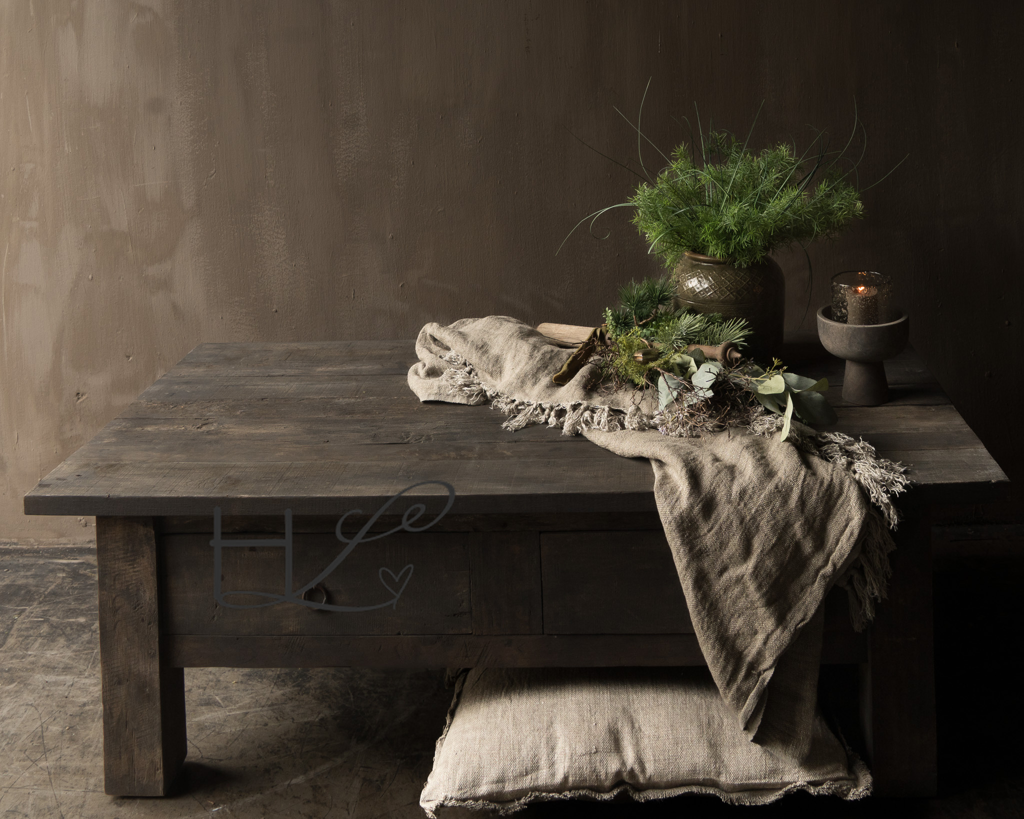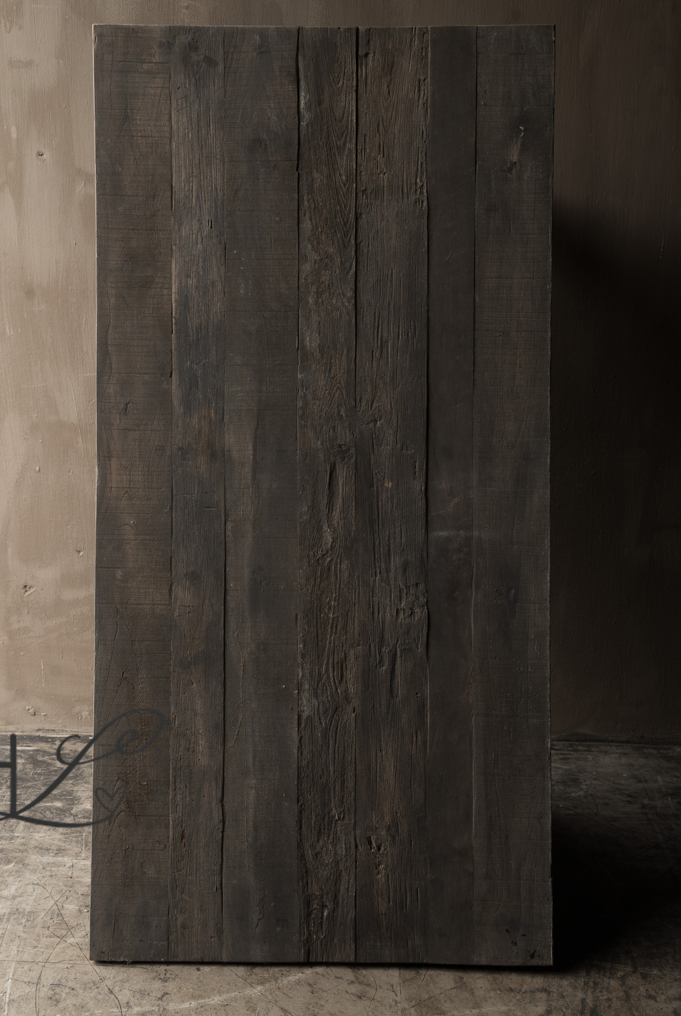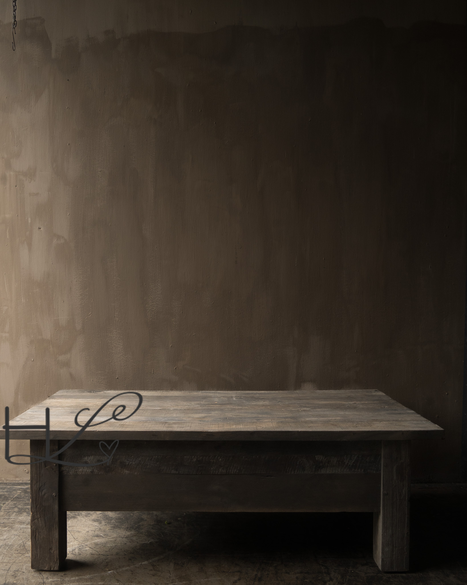 Deze stoere salontafel is gemaakt van donker oud, rustiek hout en ademt karakter en authenticiteit. Het robuuste blad en de doorleefde uitstraling geven de tafel een unieke charme die perfect past in een sfeervol, sober en landelijk interieur.