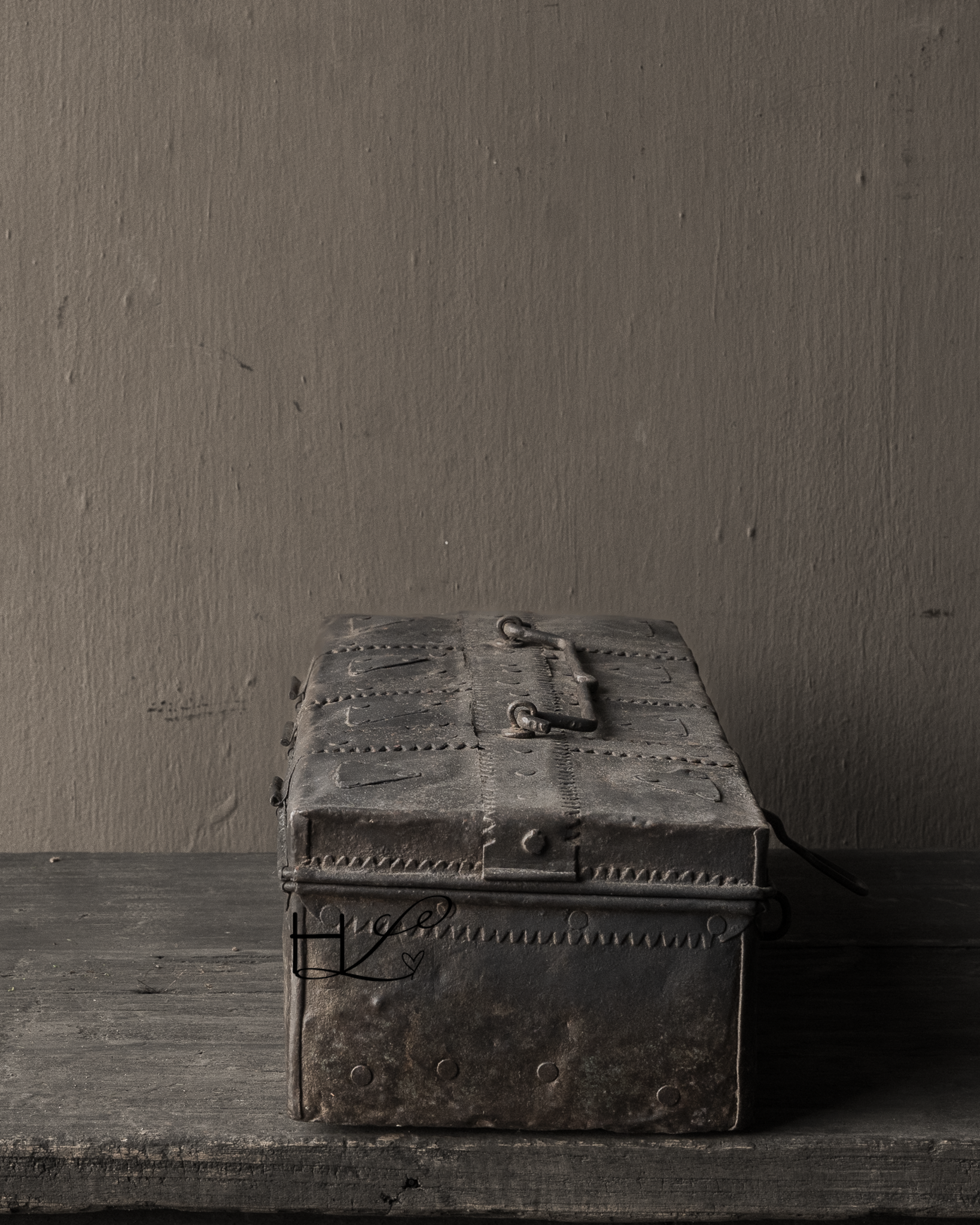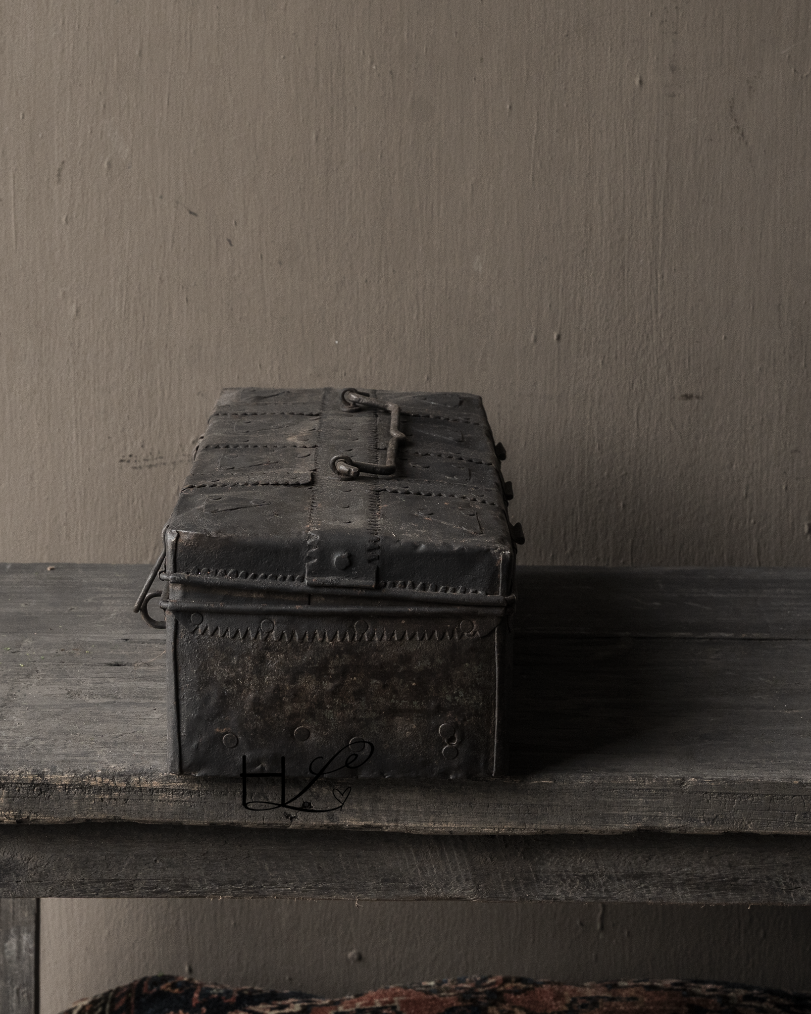 Dit karaktervolle oude ijzeren kistje is een prachtig decoratief item met een doorleefde uitstraling. De robuuste afwerking, klinknagels en het verweerde metaal geven het kistje een puur en authentiek karakter.