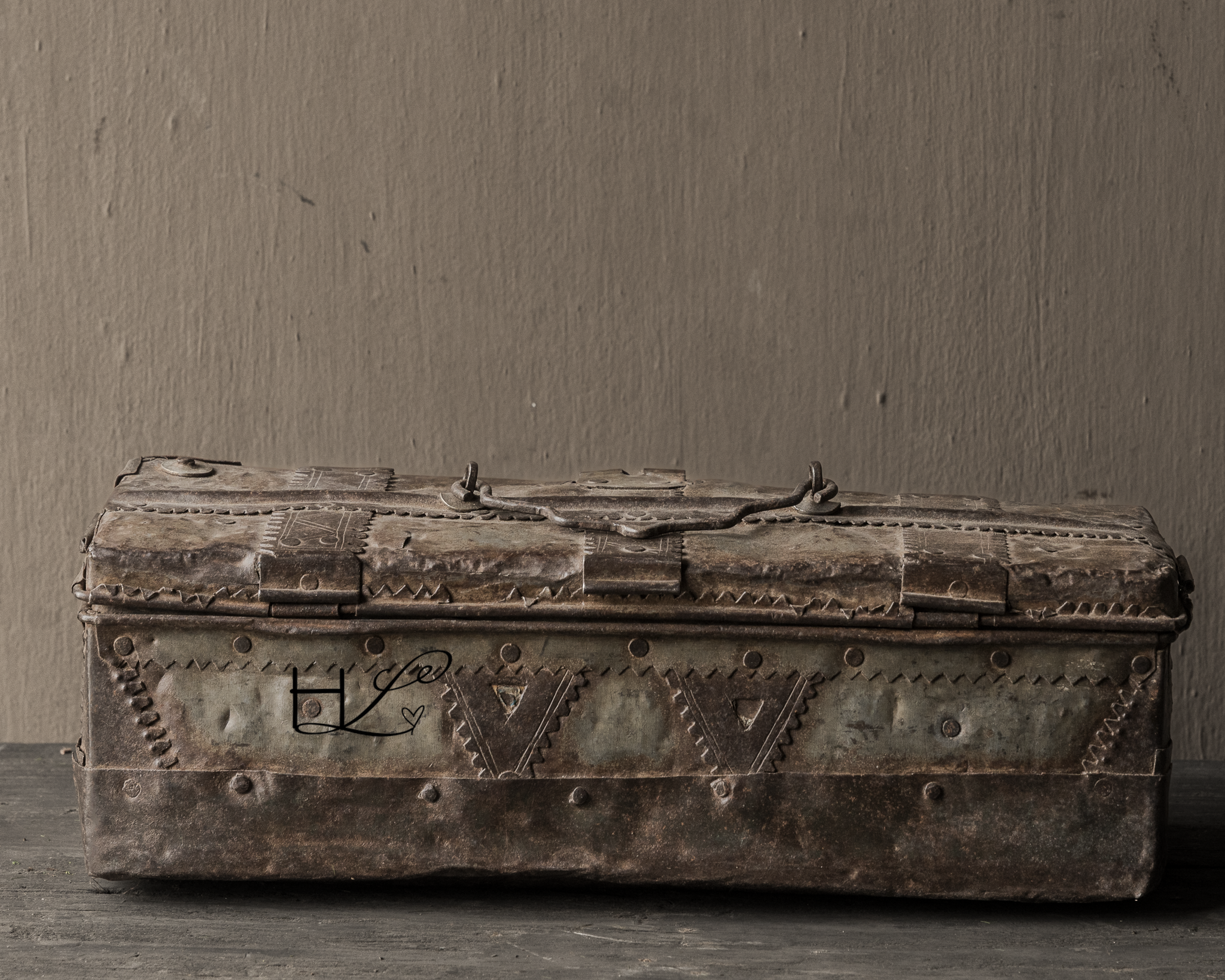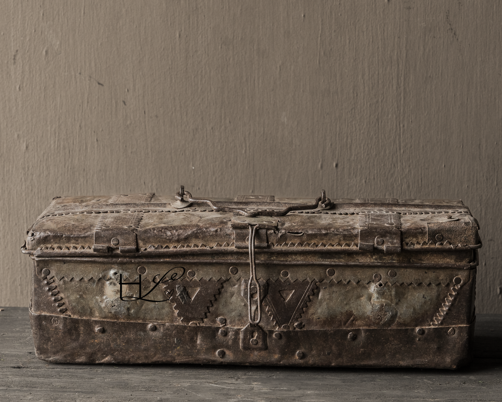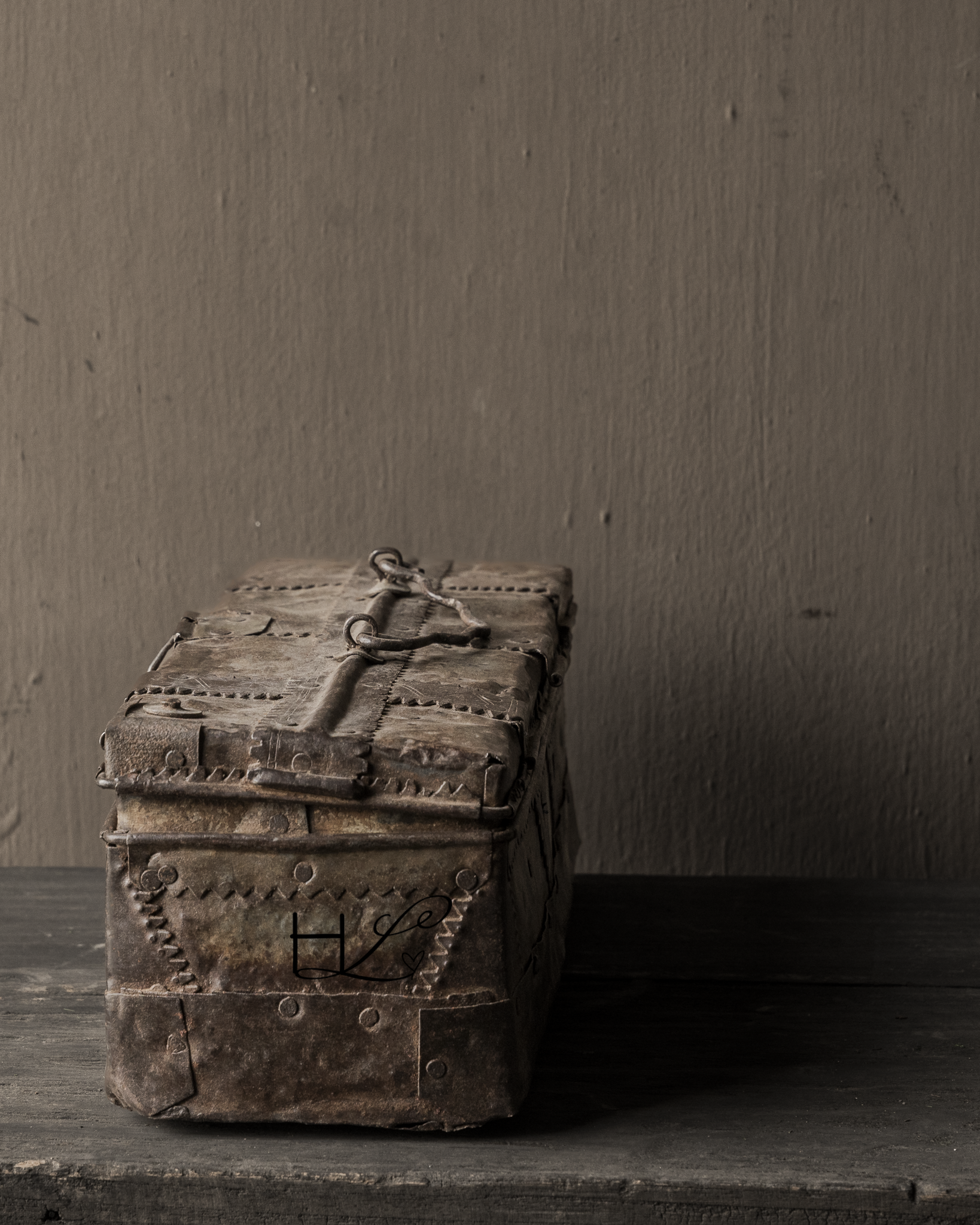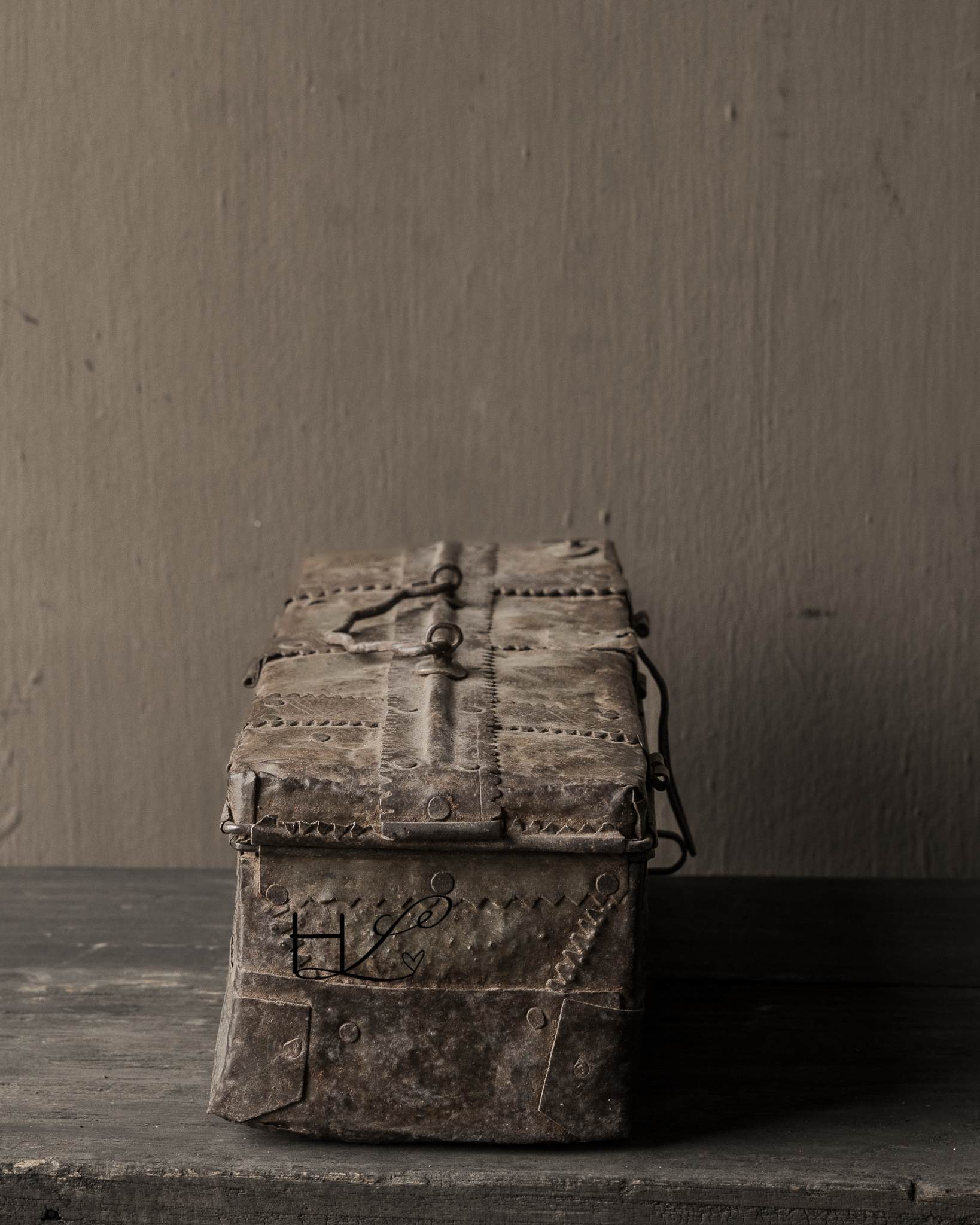Dit karaktervolle oude ijzeren kistje is een prachtig decoratief item met een doorleefde uitstraling. De robuuste afwerking, klinknagels en het verweerde metaal geven het kistje een puur en authentiek karakter.