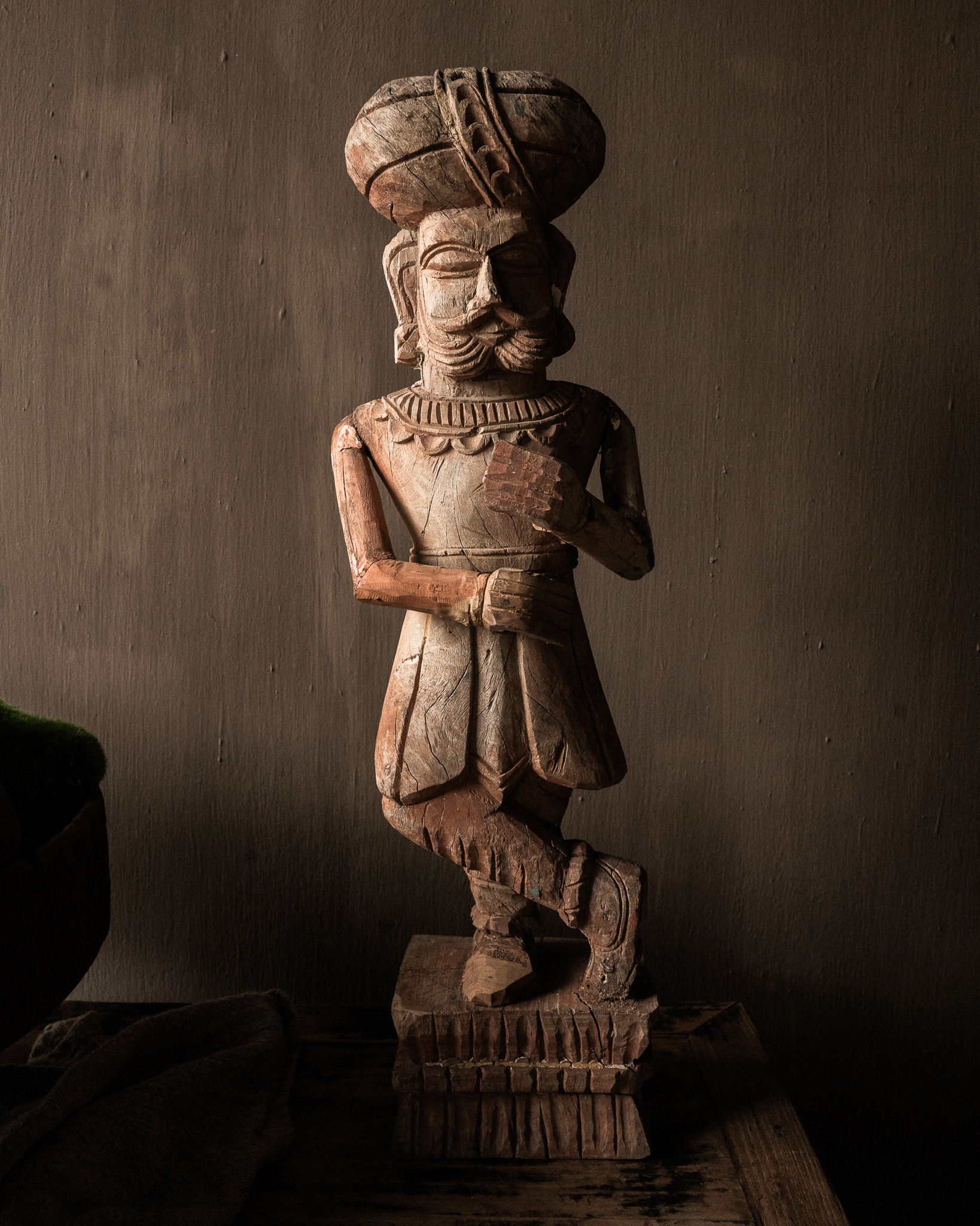 Een bijzonder en authentiek houten beeldje, met de hand gesneden in India. Deze wabi-sabi watchman straalt karakter en historie uit door zijn doorleefde uitstraling en subtiele restanten van oude verfsporen. Het beeldje is vervaardigd uit massief hout en geplaatst op een stevig statief, zodat het perfect tot zijn recht komt in ieder interieur.