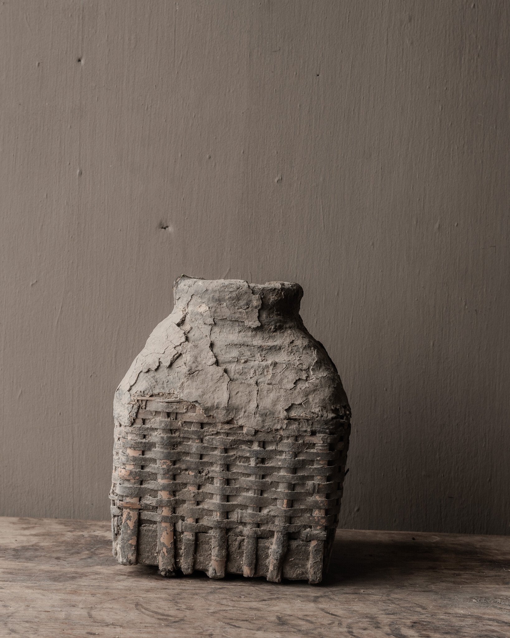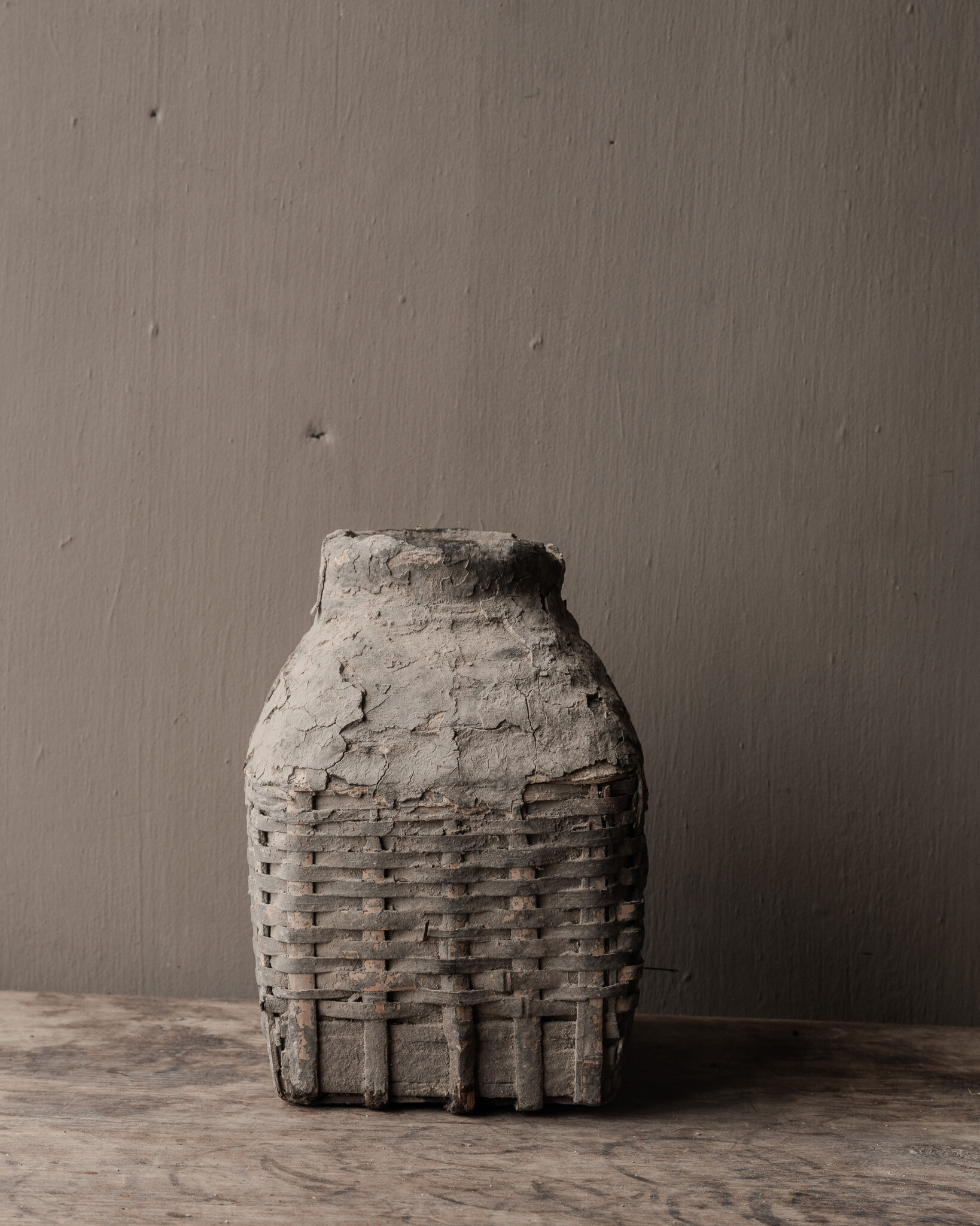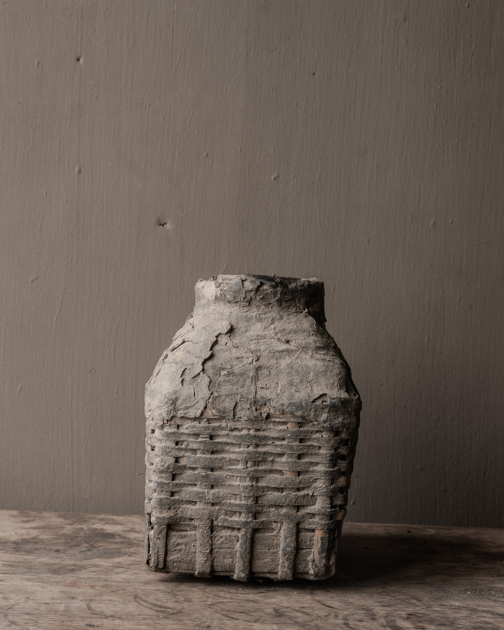 Deze oude authentieke kruik is een bijzonder en zeldzaam object, vervaardigd uit een gevlochten basis van riet of bamboe en afgewerkt met een laag leem/klei. De kruik is rondom voorzien van verweerde touwdetails, die dienden om het geheel te verstevigen en te dragen.