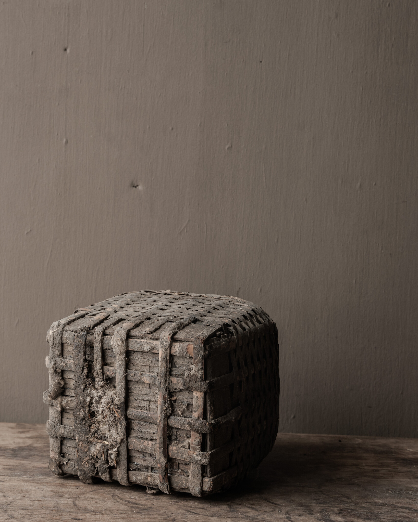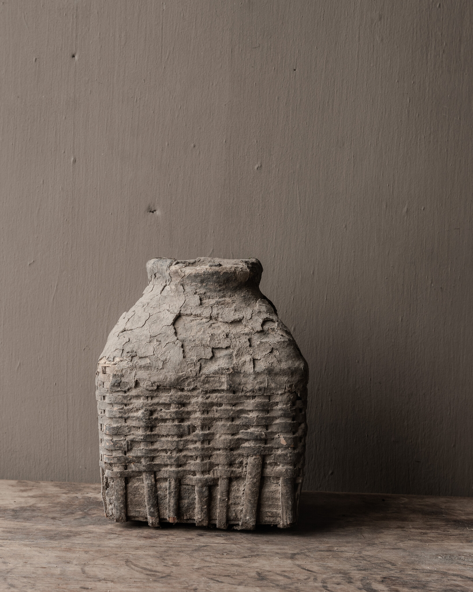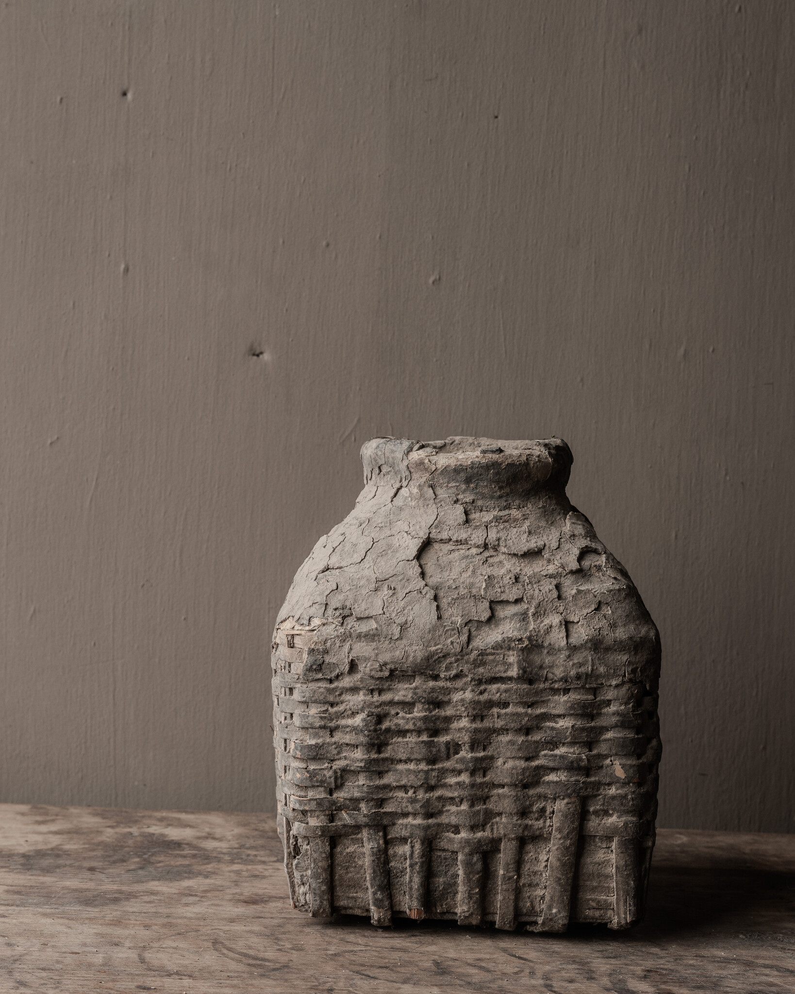 Deze oude authentieke kruik is een bijzonder en zeldzaam object, vervaardigd uit een gevlochten basis van riet of bamboe en afgewerkt met een laag leem/klei. De kruik is rondom voorzien van verweerde touwdetails, die dienden om het geheel te verstevigen en te dragen.
