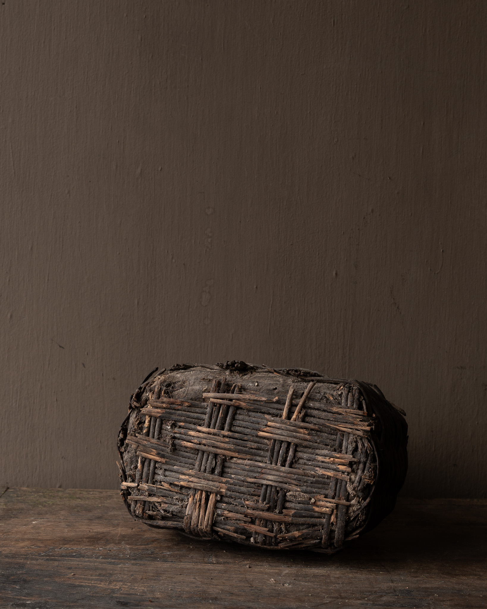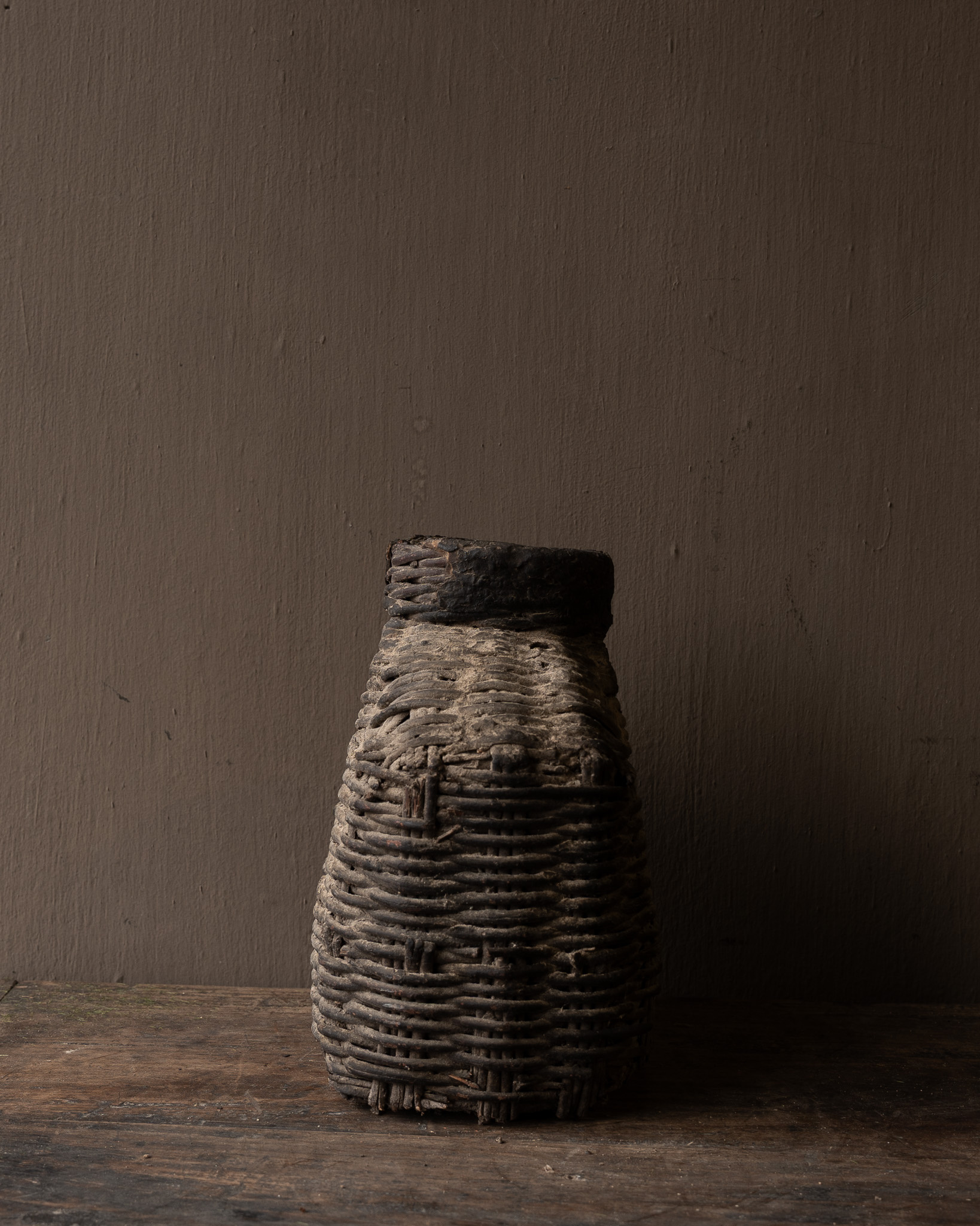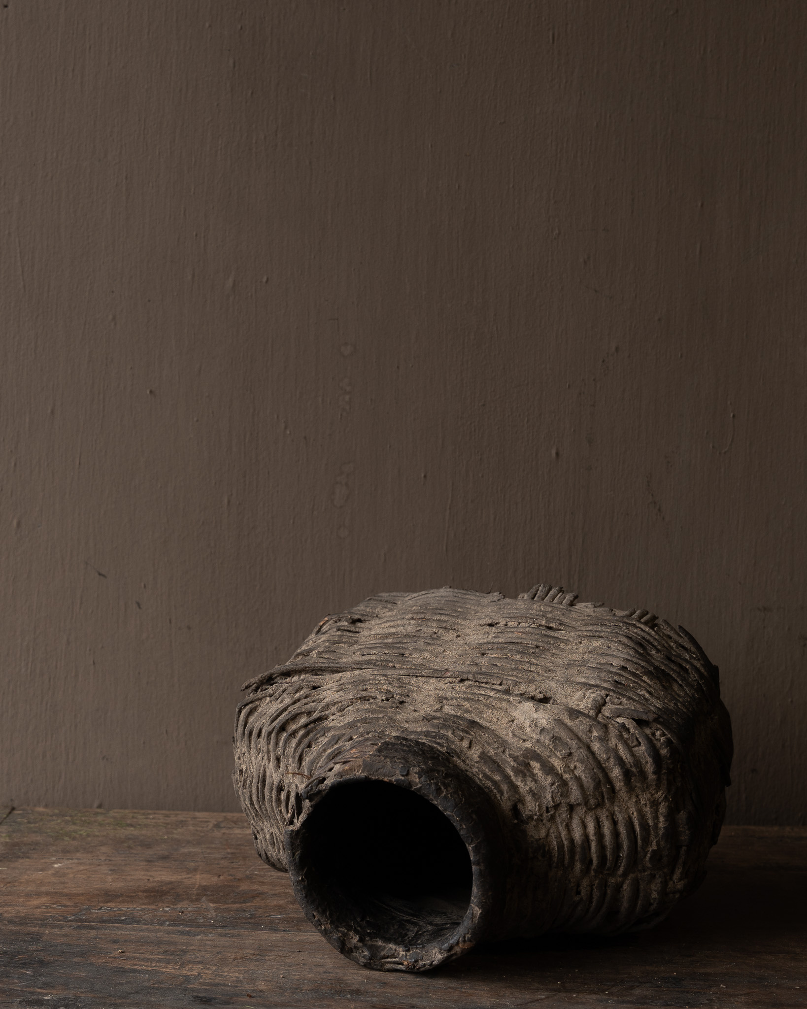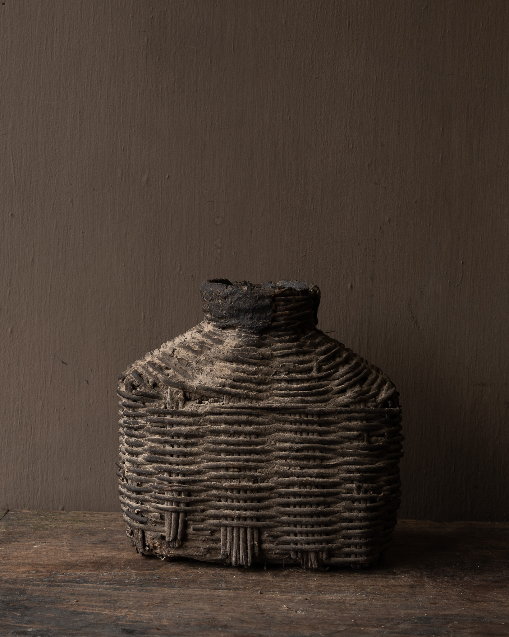 Deze oude authentieke kruik is een bijzonder en zeldzaam object, vervaardigd uit een gevlochten basis van riet of bamboe en afgewerkt met een laag leem/klei. De kruik is rondom voorzien van verweerde touwdetails, die dienden om het geheel te verstevigen en te dragen.
