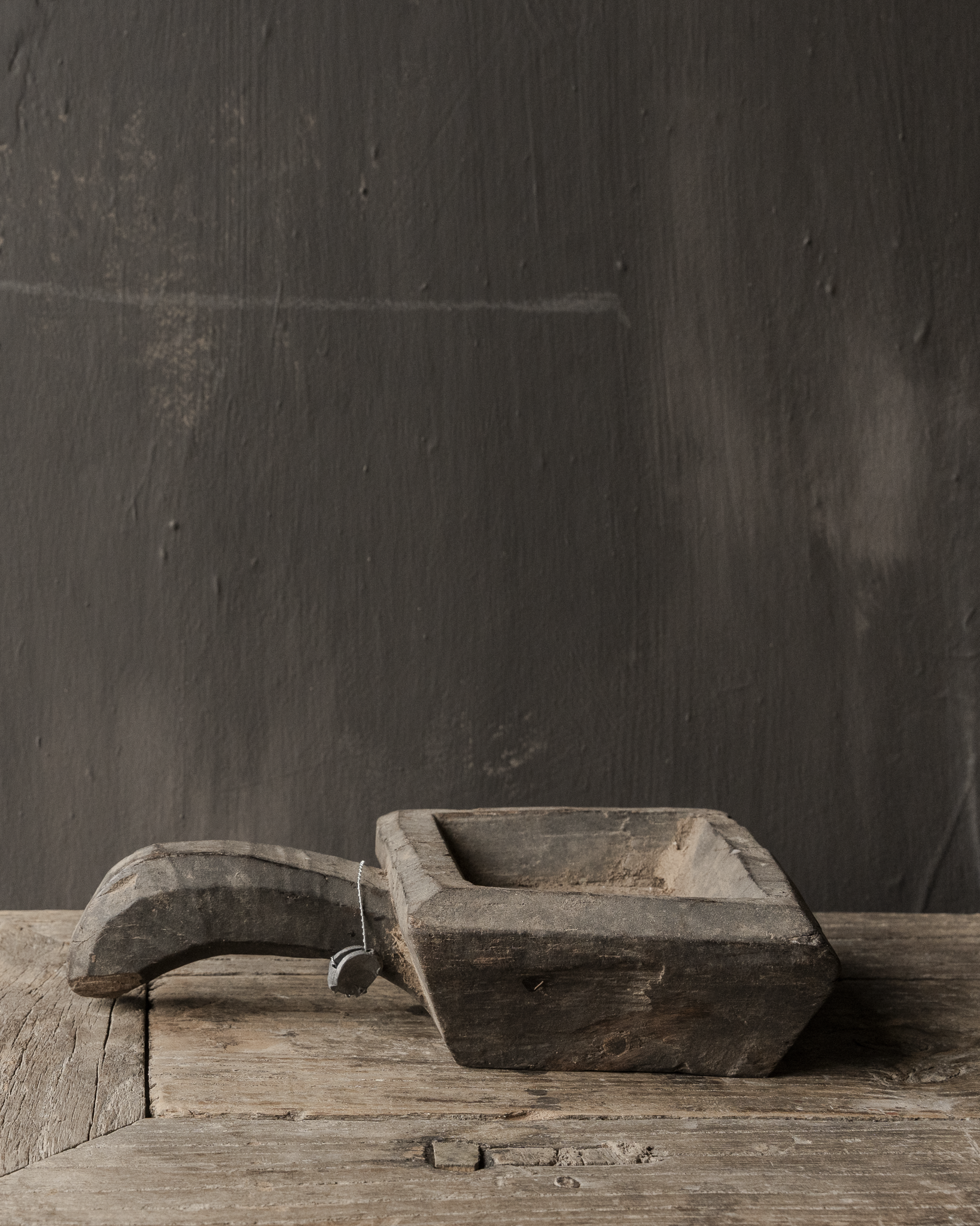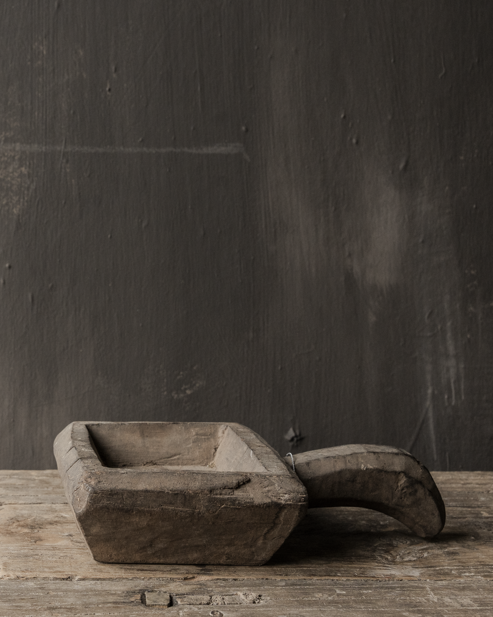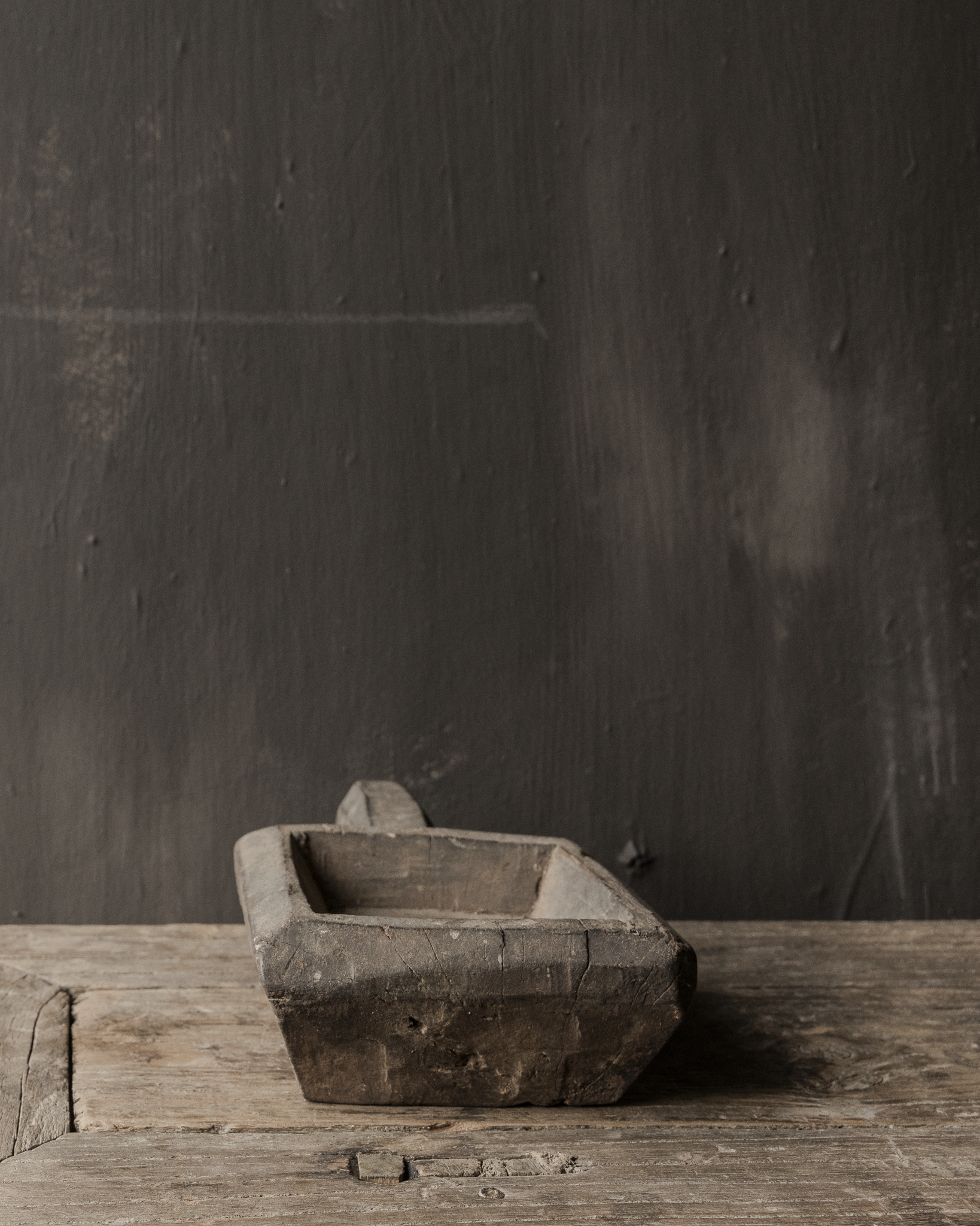 Het bakje is volledig met de hand vervaardigd uit massief hout. De diepe sporen van gebruik, kleine scheurtjes en verkleuringen geven het object een unieke wabi sabi uitstraling. De stevige handgreep maakt het geheel krachtig en tegelijkertijd ingetogen in vorm.