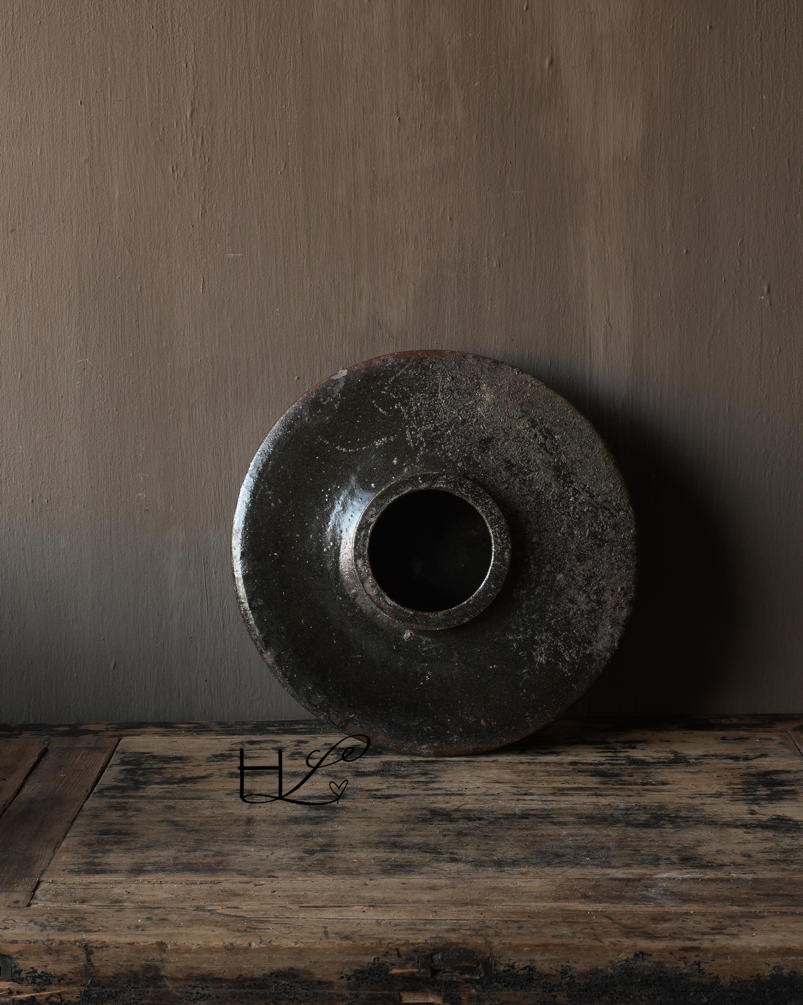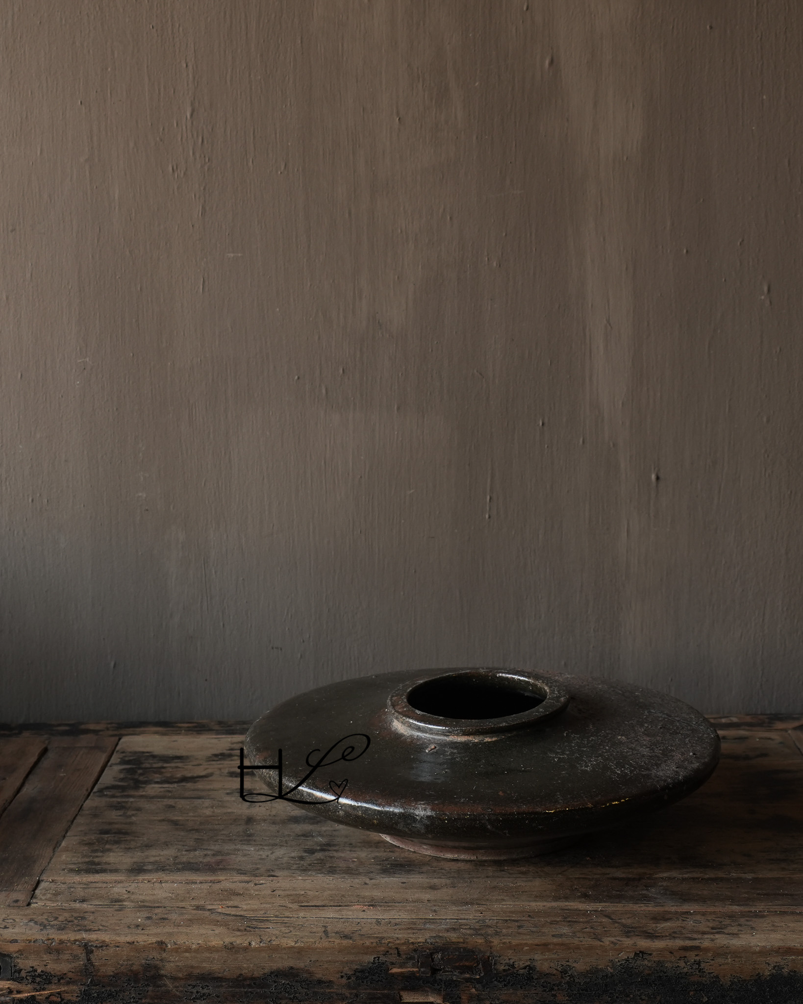 Deze authentieke geglazuurde kruik is een bijzonder en karaktervol object met een prachtige doorleefde uitstraling. De lage, brede vorm en het donkere glazuur geven de kruik een krachtige en rustige uitstraling die perfect past binnen een wabi-sabi of landelijk interieur.
