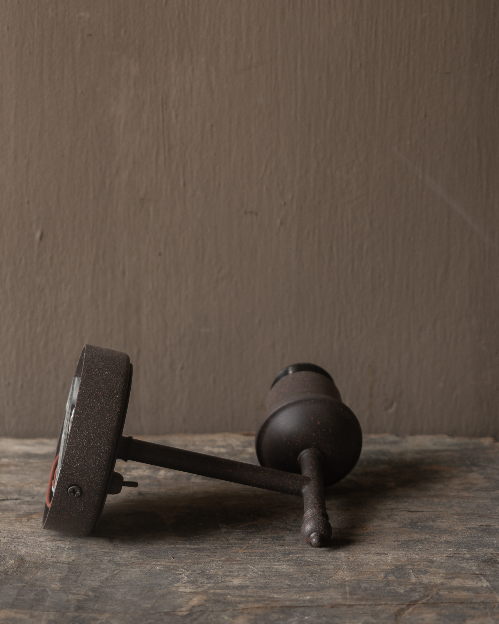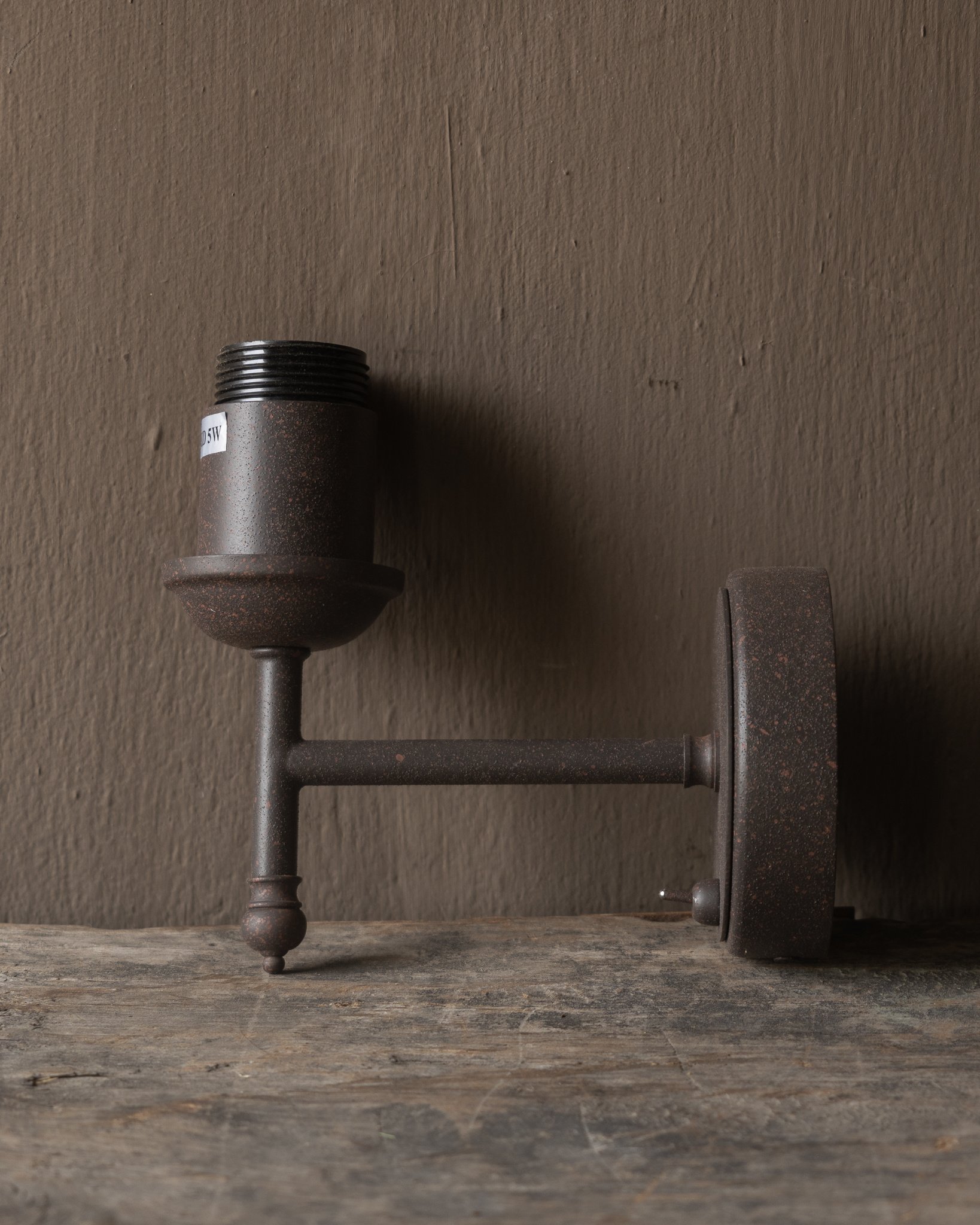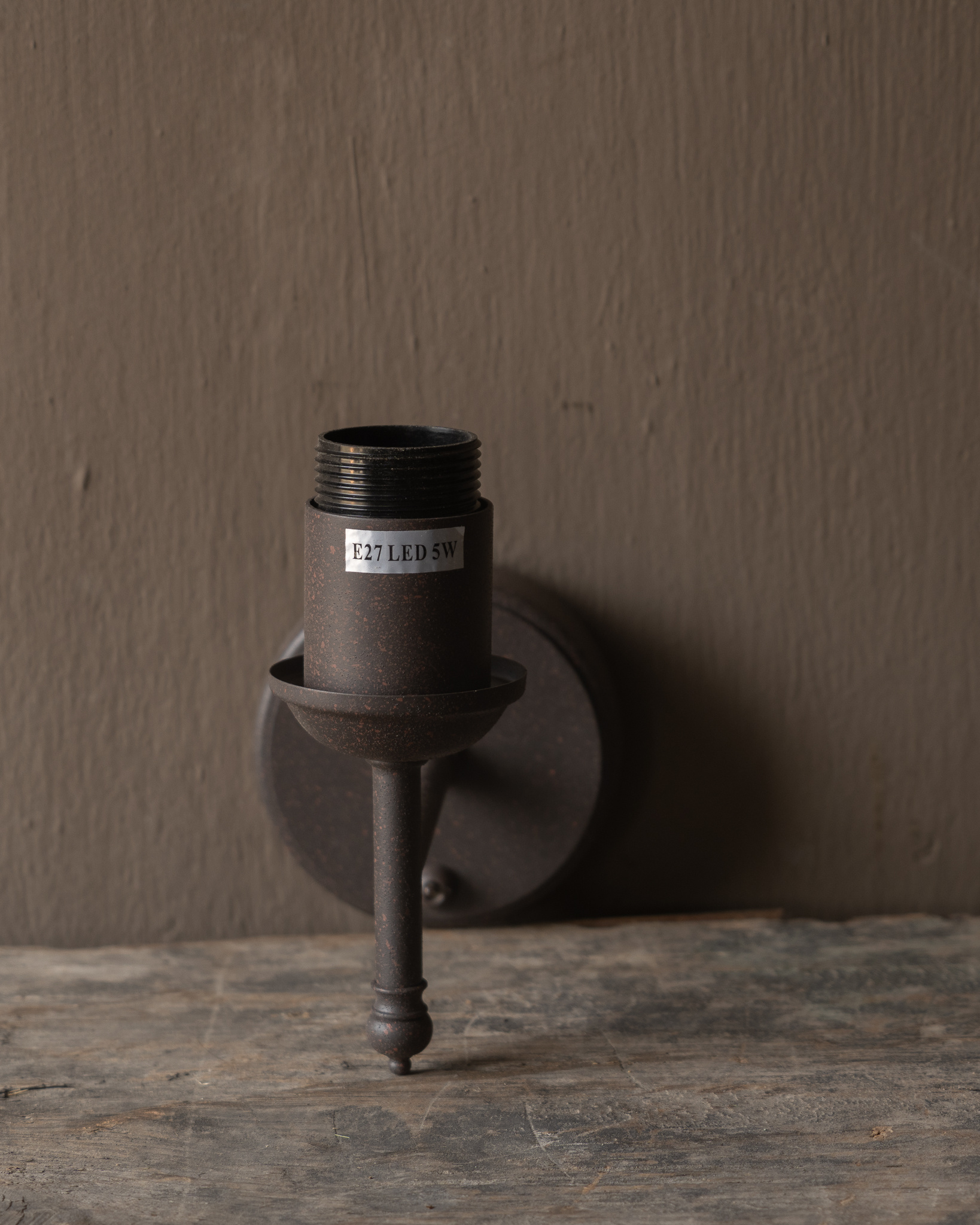 Een sfeervolle LUKSA wandlamp met een doorleefde uitstraling, perfect voor wie houdt van een landelijke en sobere woonstijl. De lamp heeft een industriële vormgeving met een warme bruinroestige poedercoating die prachtig combineert met natuurlijke tinten, verweerd hout en linnen textiel.