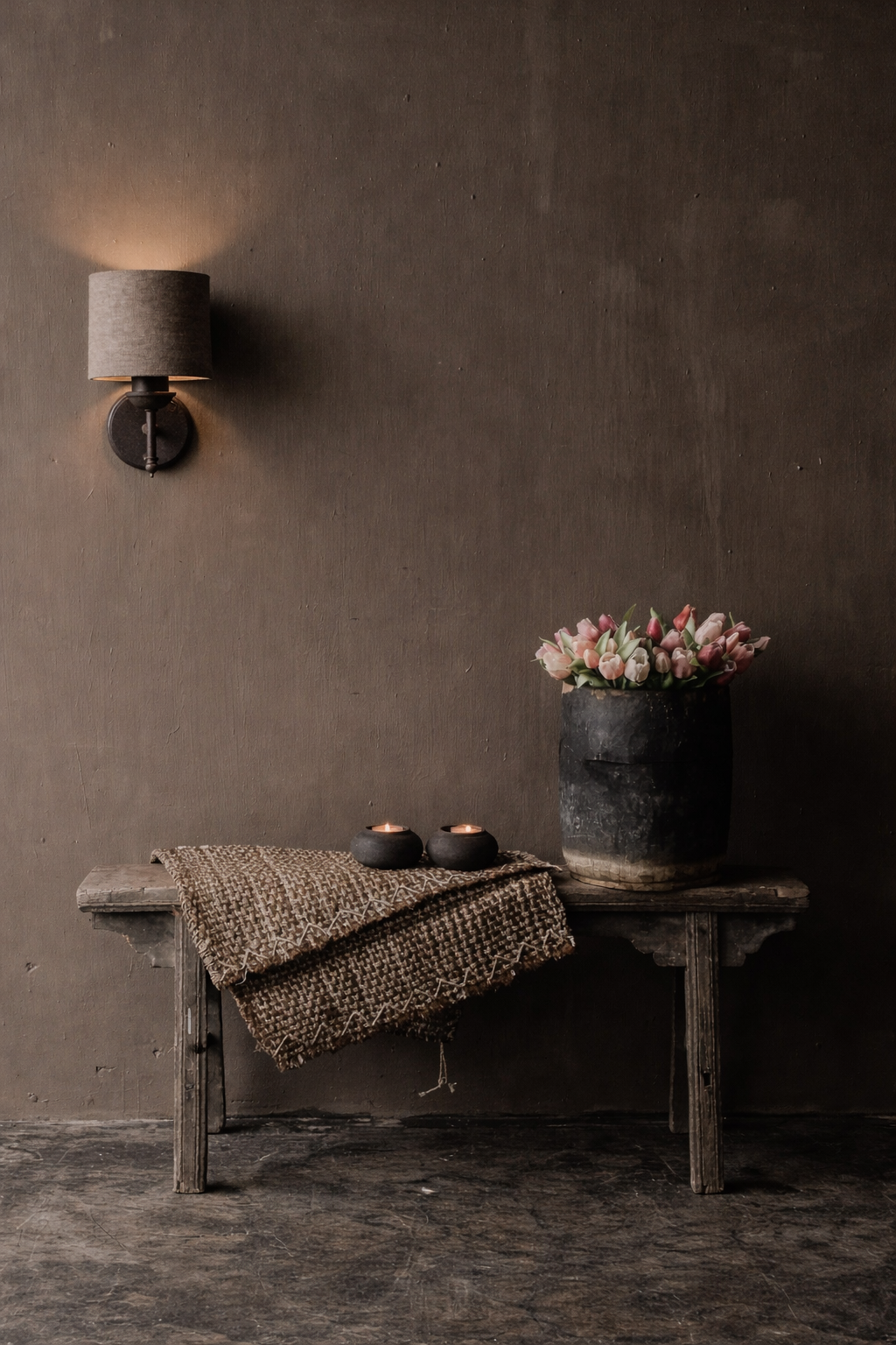 Een tijdloze wandlamp die moeiteloos past binnen een landelijk, sober en warm interieur.